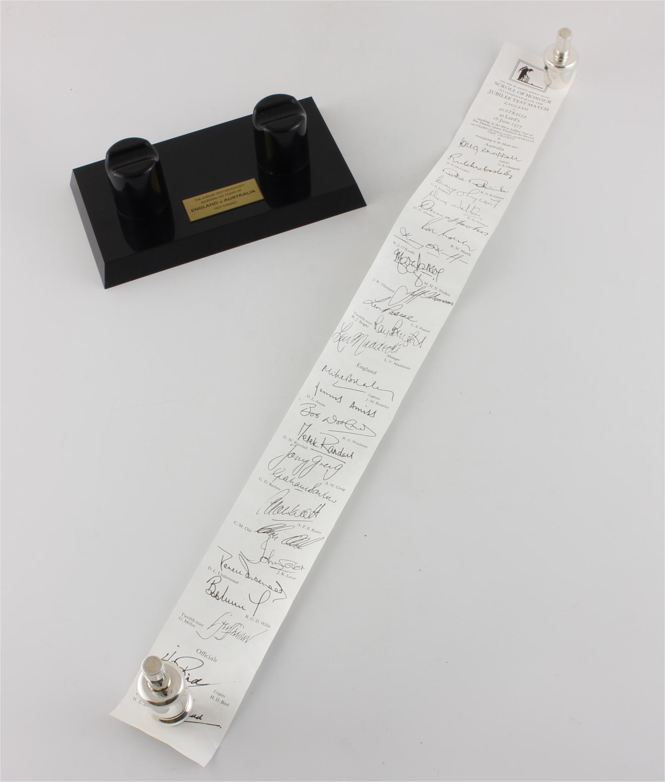 This silver bail unscrews to reveal a paper scroll recording the scores of the Centenary Test Match at Lord's along with the player's names and facsimile signatures.