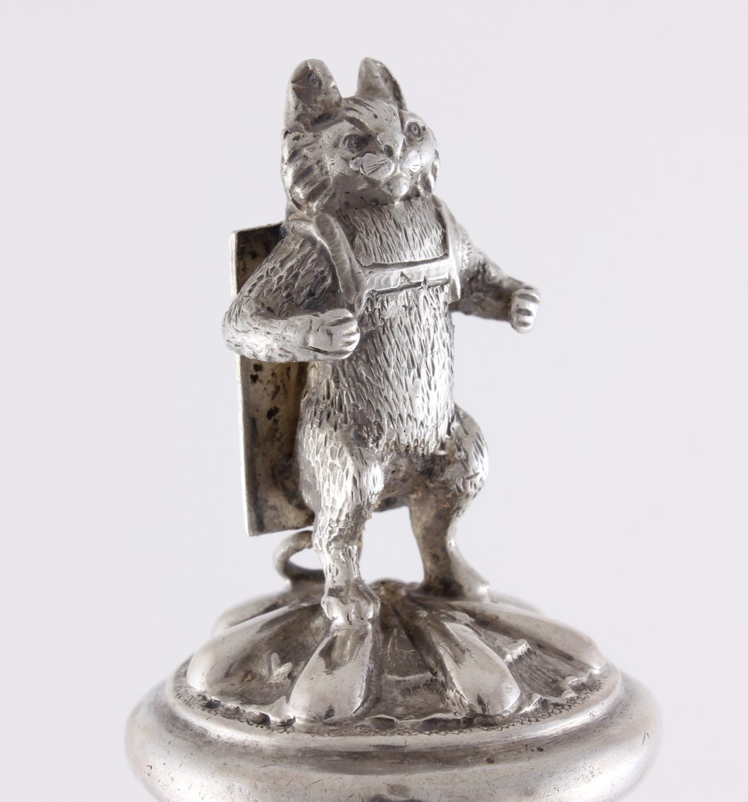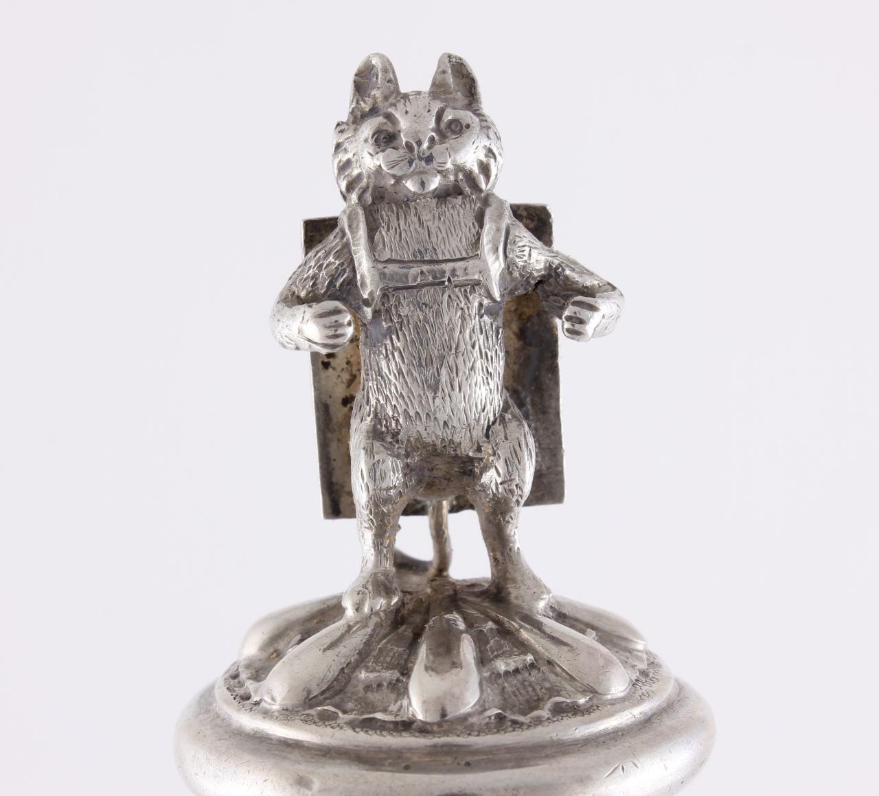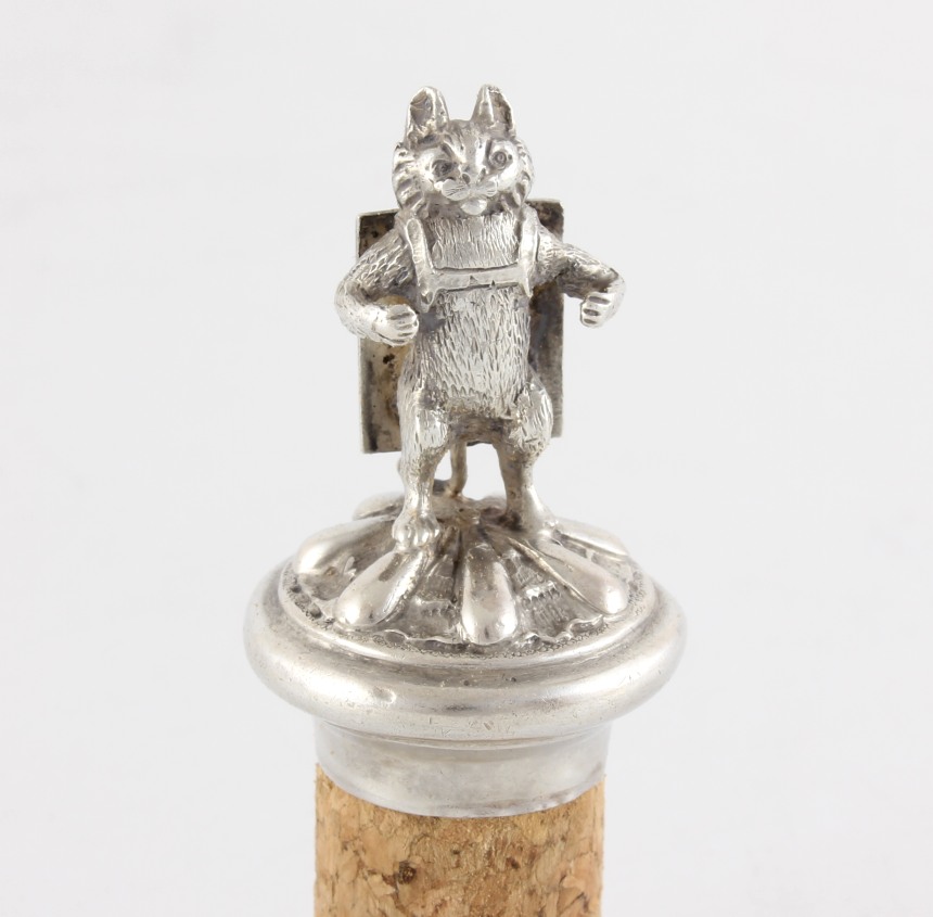 This novelty Victorian stopper of a cat figure proudly wearing an advertising sandwich board is a charming piece and the reverse board is blank so could be engraved if you so wished.