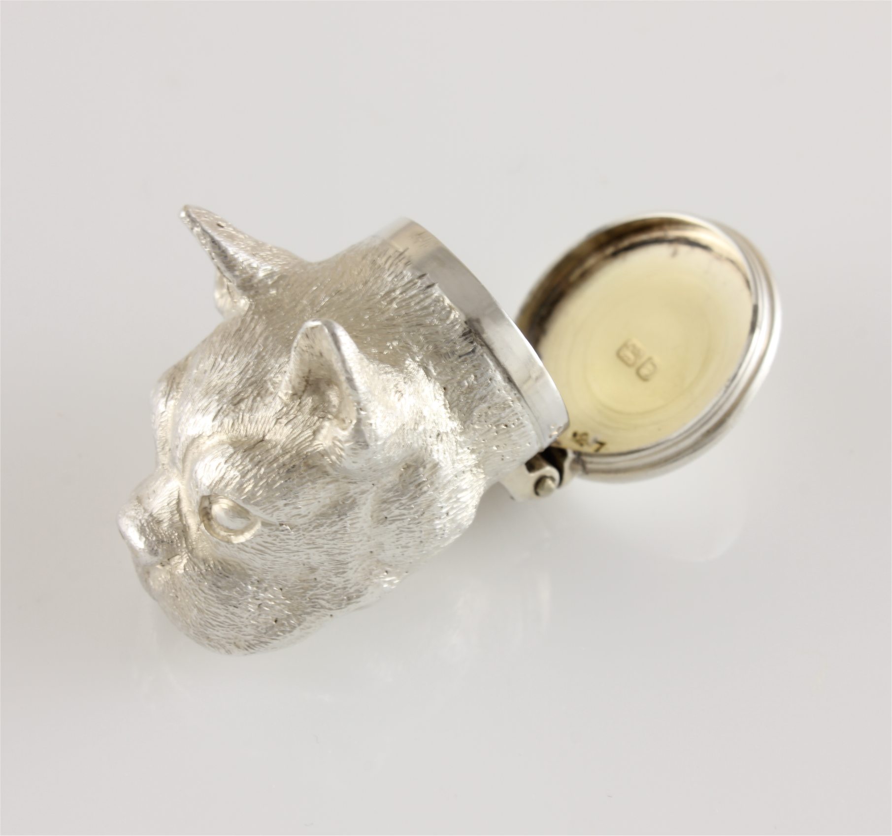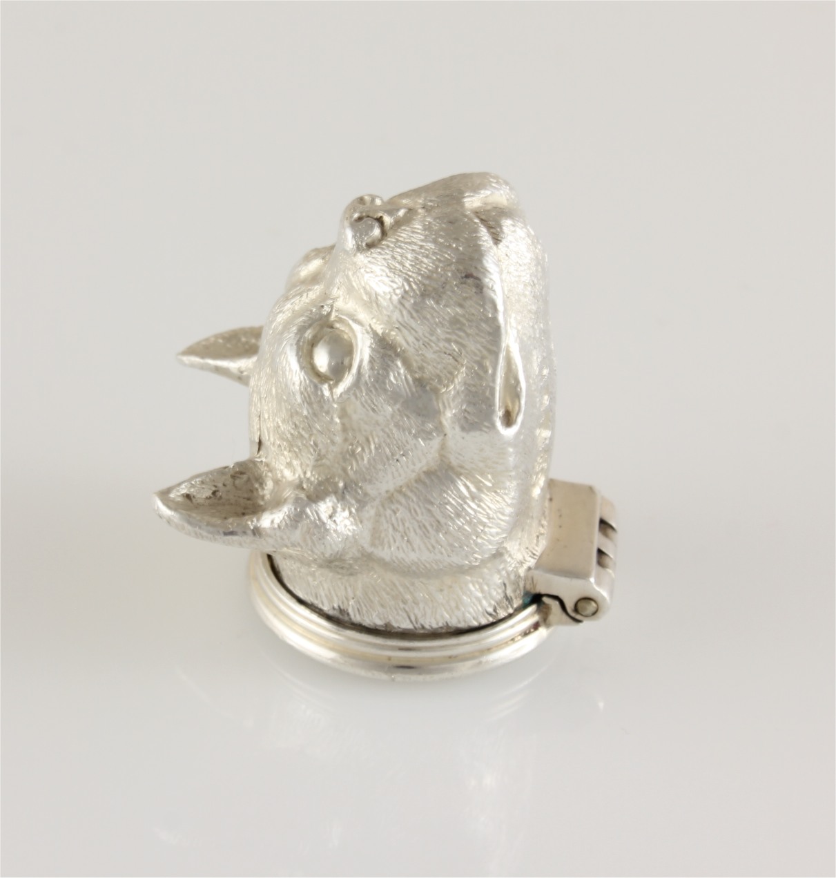 This beautiful box which has a hinged lid is realistically modelled as a French Bulldog's head with wonderful detail, the inside is gilded, feels heavy in the hand and is in excellent condition.