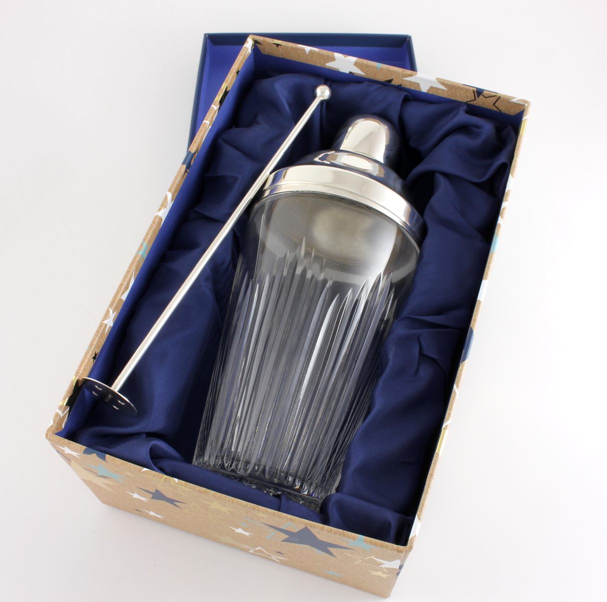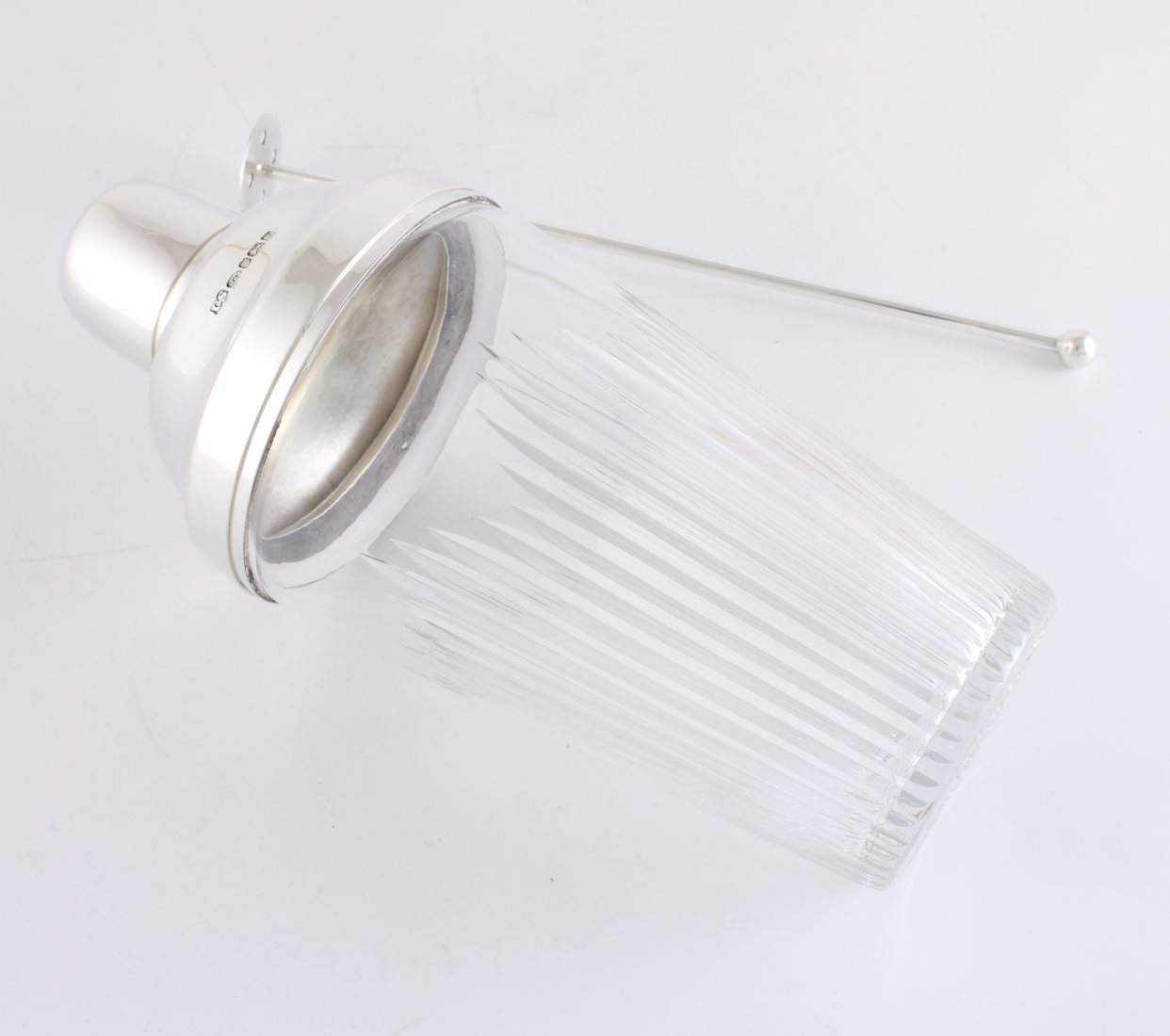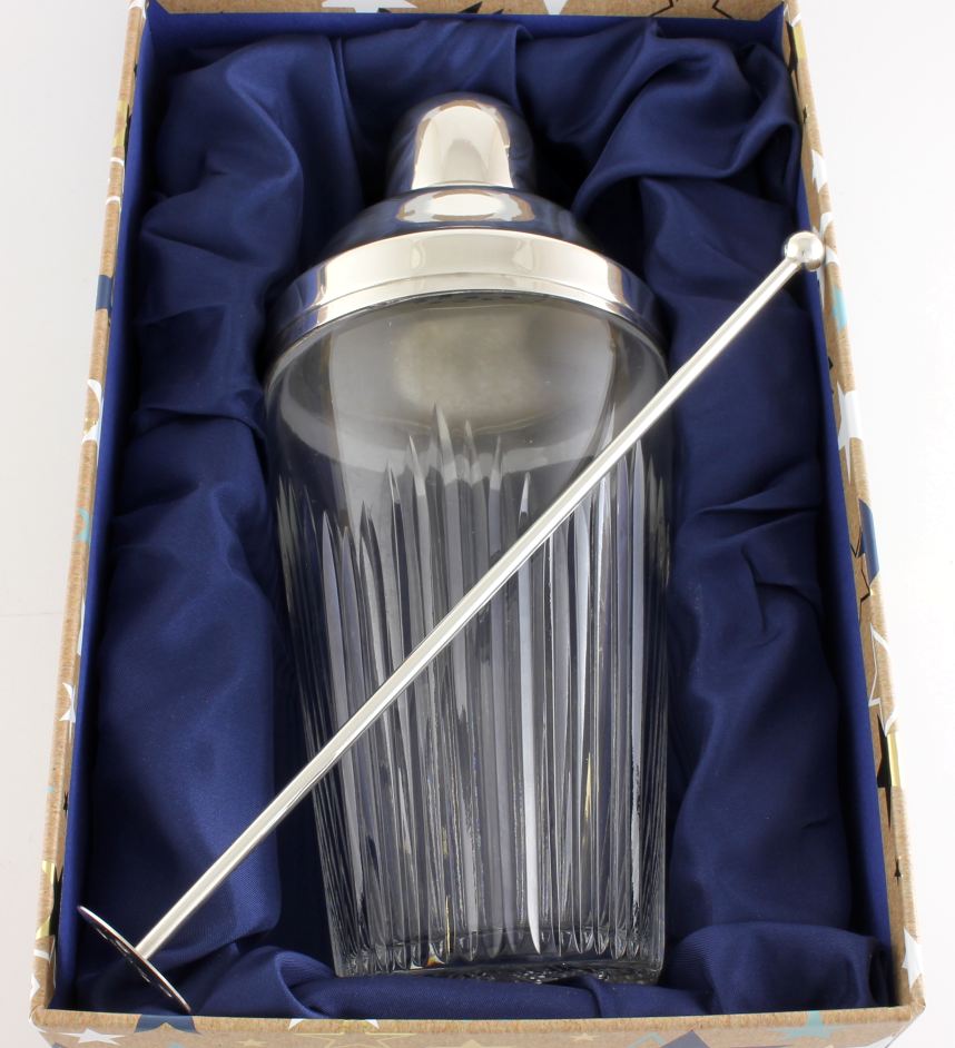 This handsome solid silver and cut glass cocktail shaker which is in the Art Deco style comes complete with a matching solid silver muddler to crush your fruit and stir your cocktail.