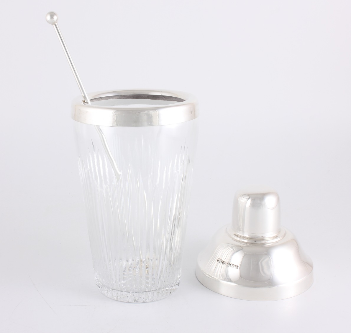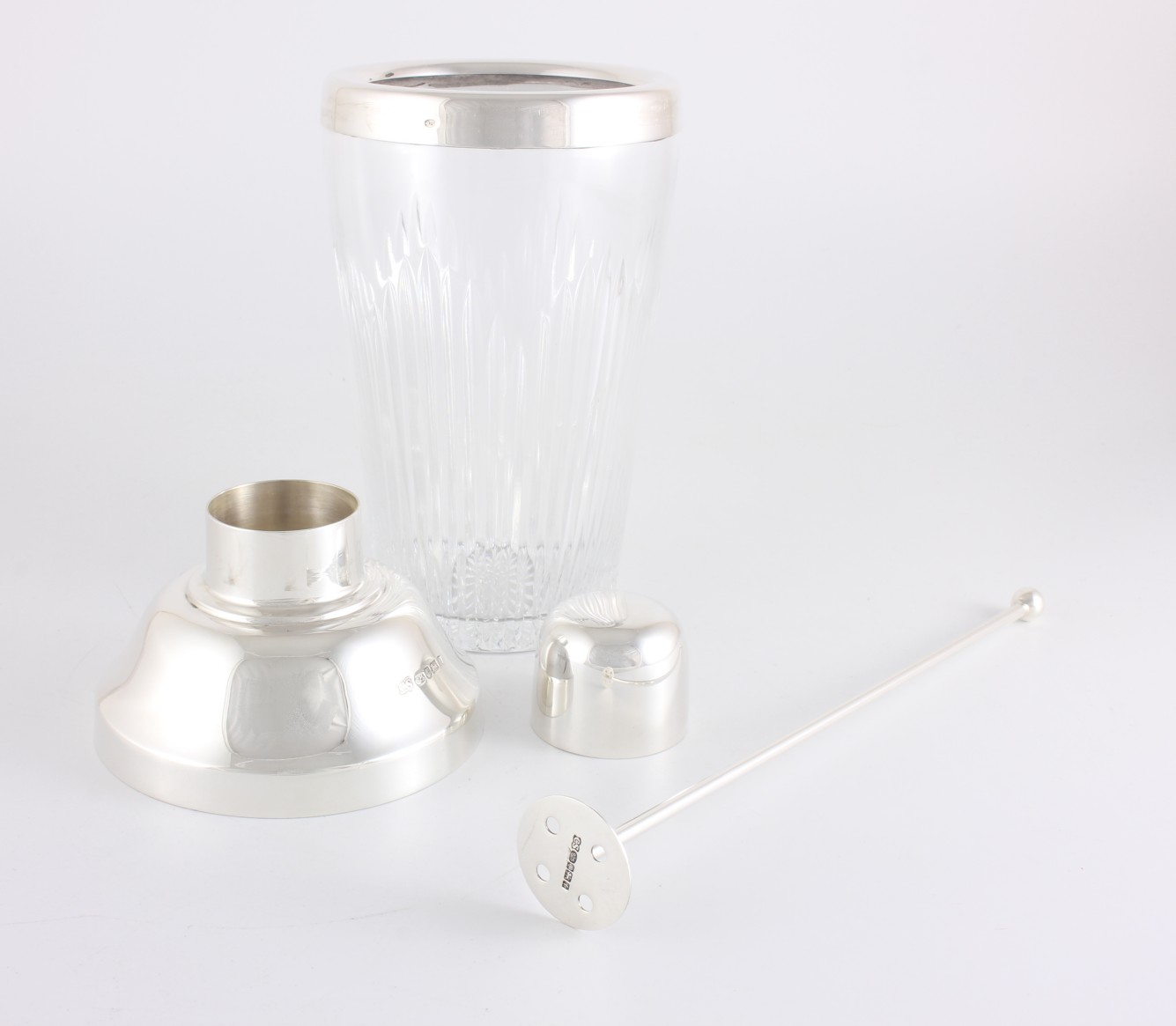This three piece shaker has a solid silver top with a removable silver lid that incorporates an inner strainer which are all hallmarked for sterling silver.