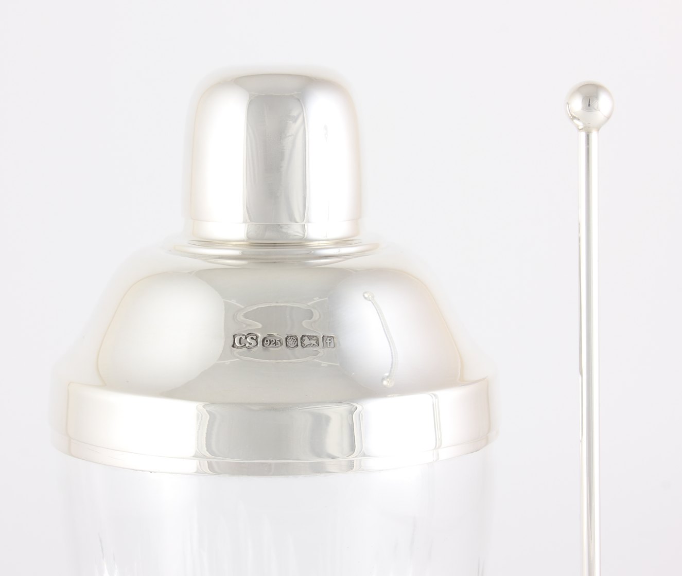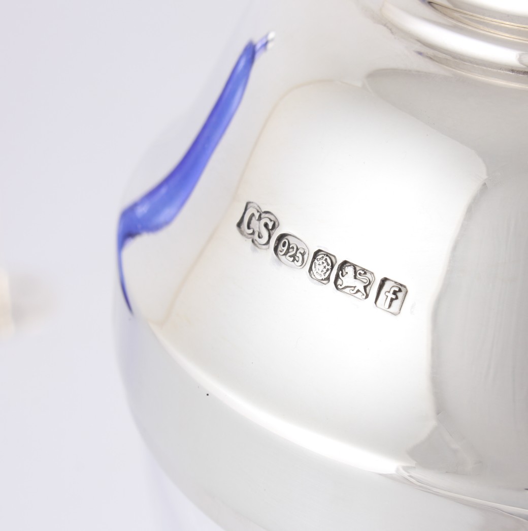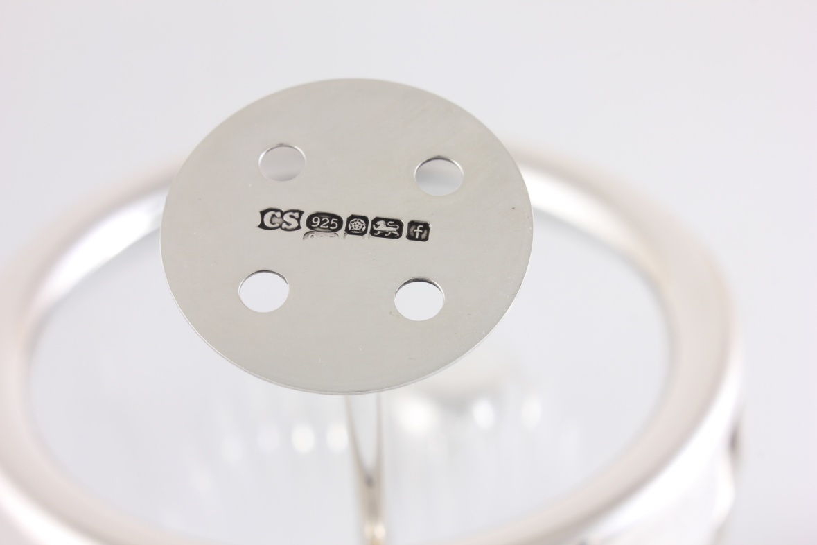 Hallmarks: Fully hallmarked with Lion and 925 for sterling silver. Sheffield. Date letter f for 2005. Maker's mark for Camelot Silverware Ltd to top and muddler. Also marked with 925 to rim and lid.