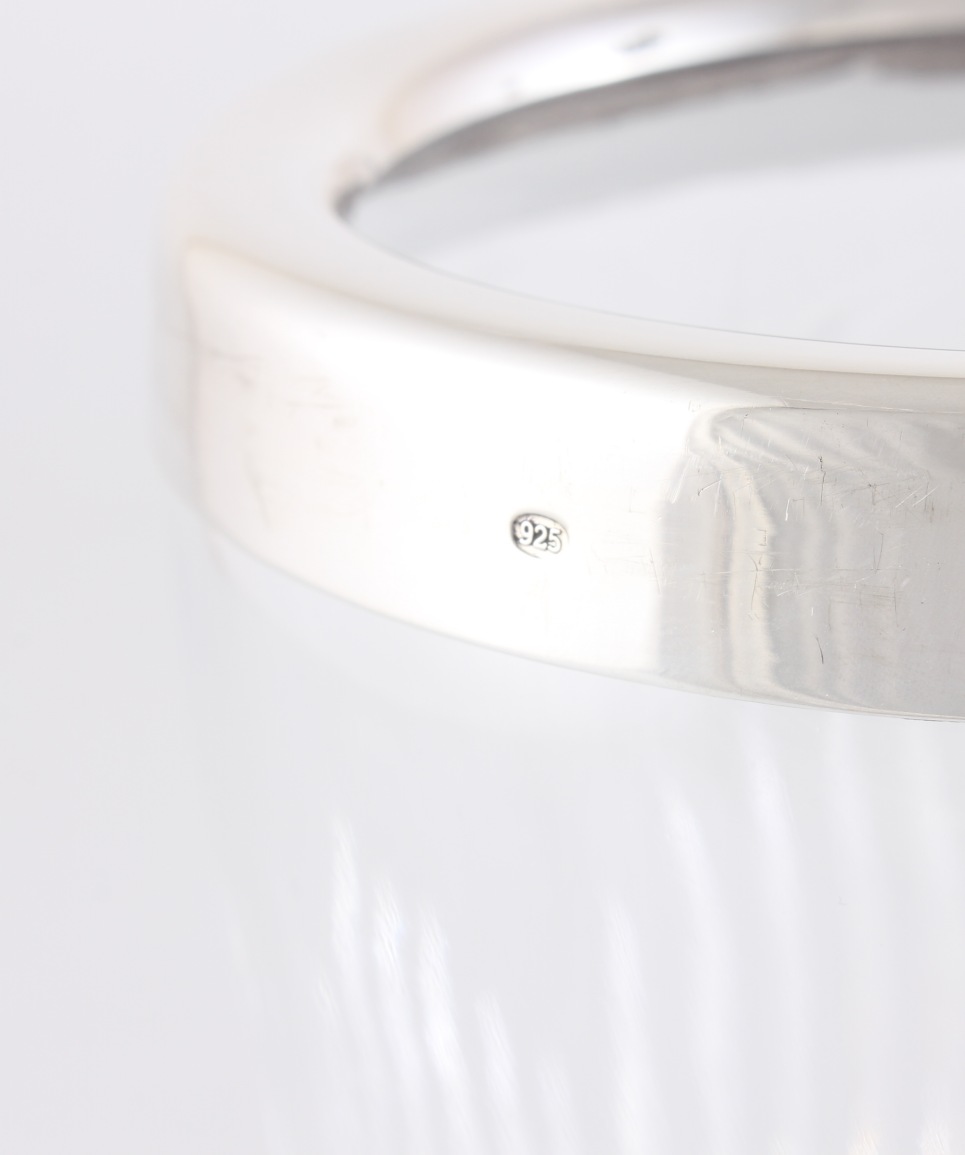 The tapering glass body has a beautiful Art Deco design with a solid silver band around the top edge and the base has a star cut design.
