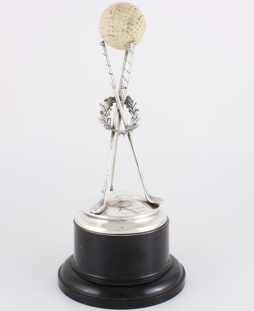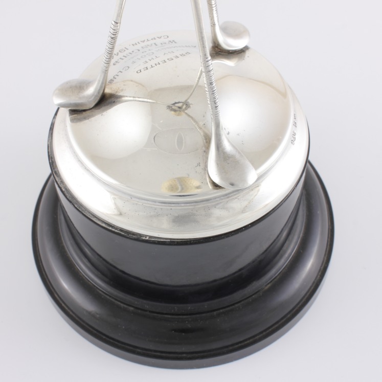This vintage golf trophy which features three crossed solid silver golf clubs with a laurel wreath entwined has a golf ball holder at the top and rests on a silver base section.