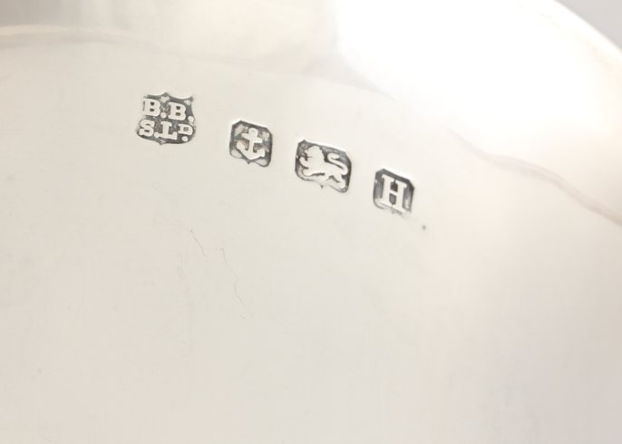 Hallmarks: Birmingham. Date letter H for 1932. Maker's mark for Barker Brothers.