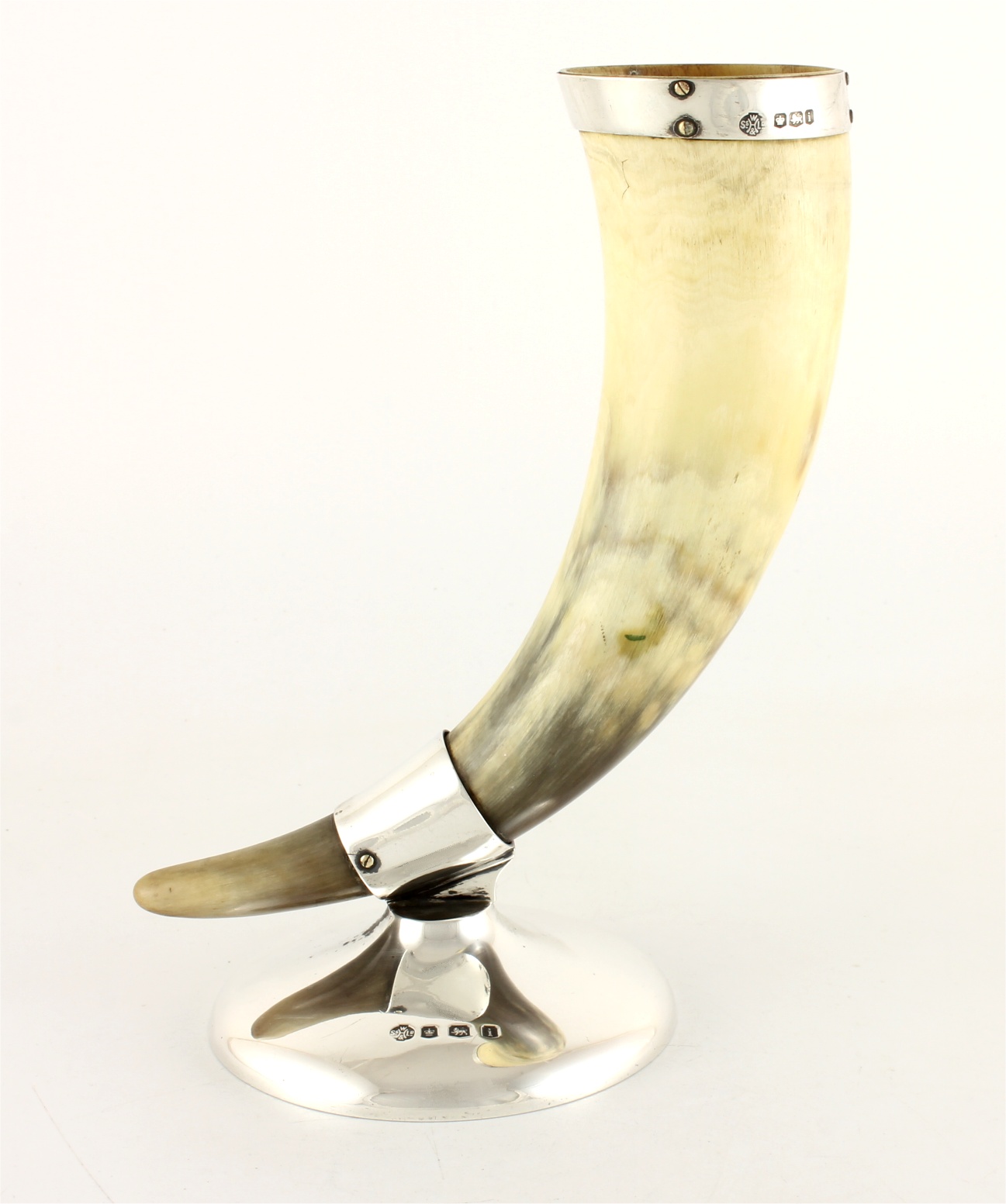This very handsome antique horn of plenty or Cornucopia which is by William Hutton & Sons Ltd dates from 1926 and is unusual being mounted with a sterling silver stand and top rim which are both fully hallmarked for Sheffield 1926.