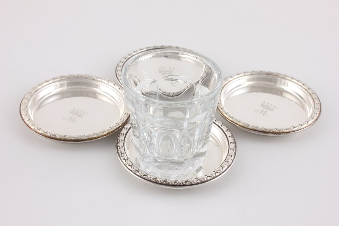 This matching set of four solid silver pin dishes which are by Adie Brothers Ltd have a Royal Crown M Monogram to each of the centres and are fully hallmarked to the undersides for 1954.