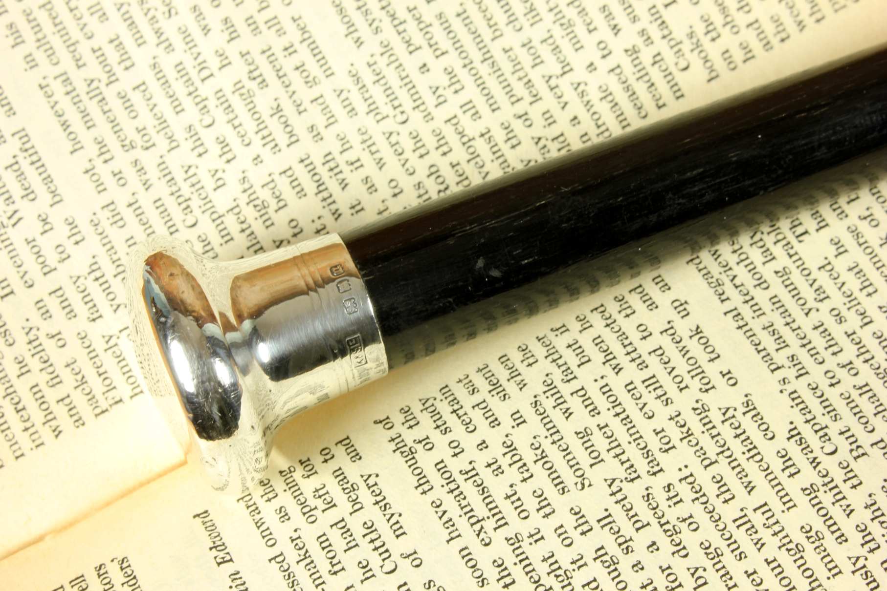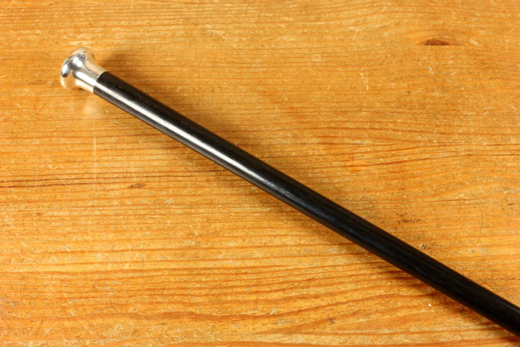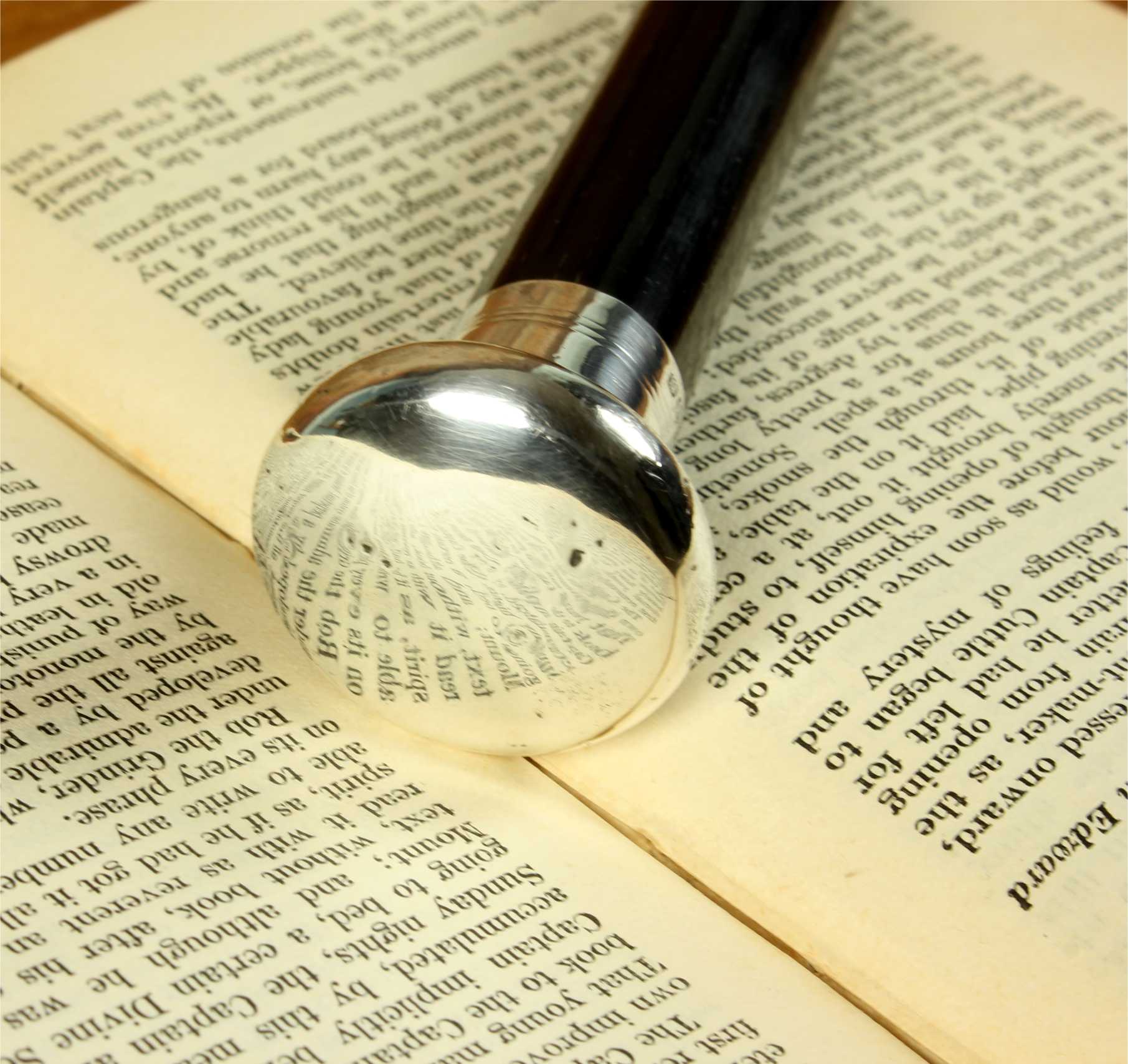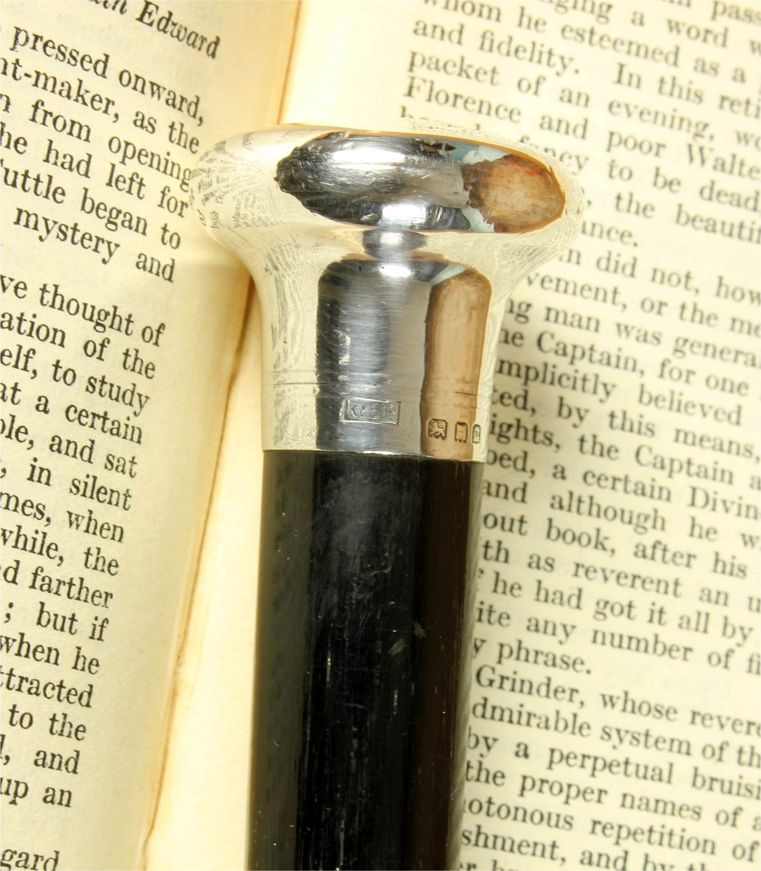 This antique walking cane which has a beautiful ebonised wooden shaft has a plain silver handle to one end hallmarked for 1928 and a brass ferrule to the other.