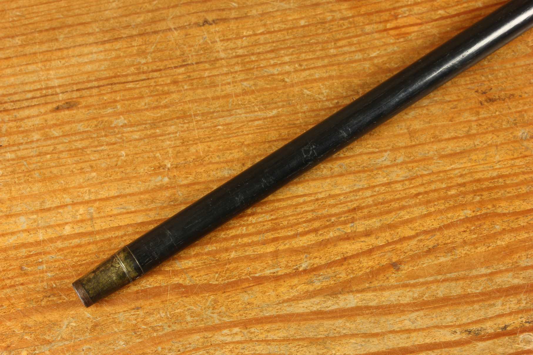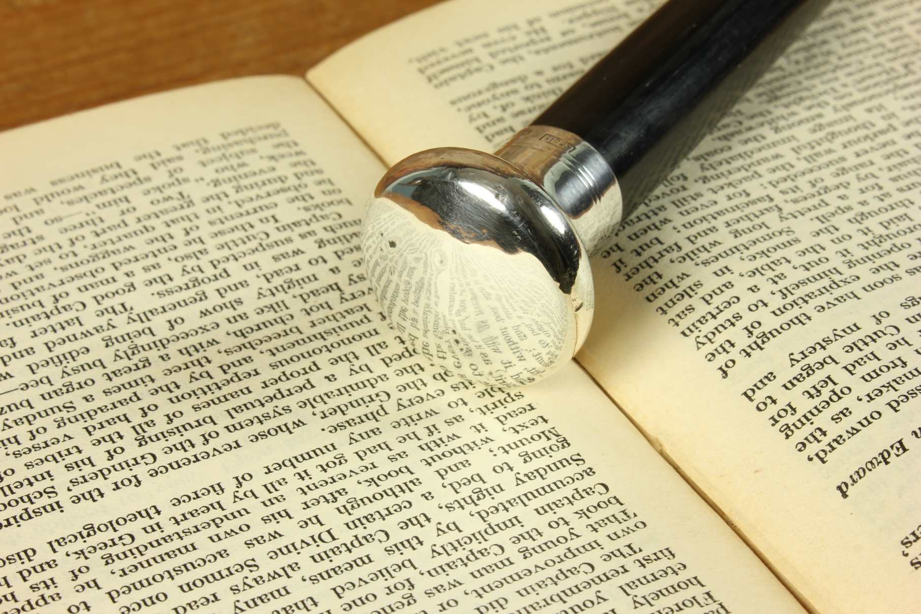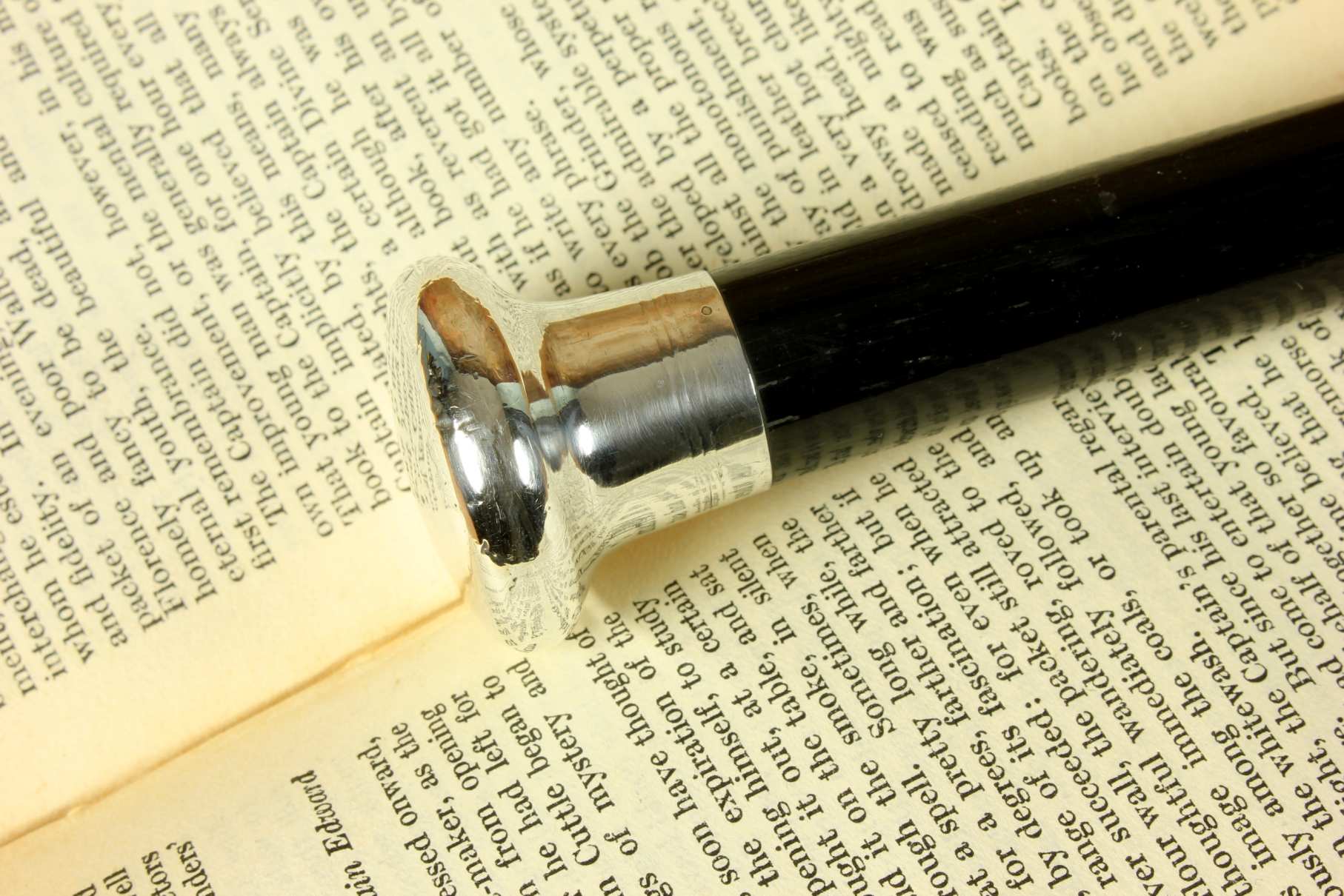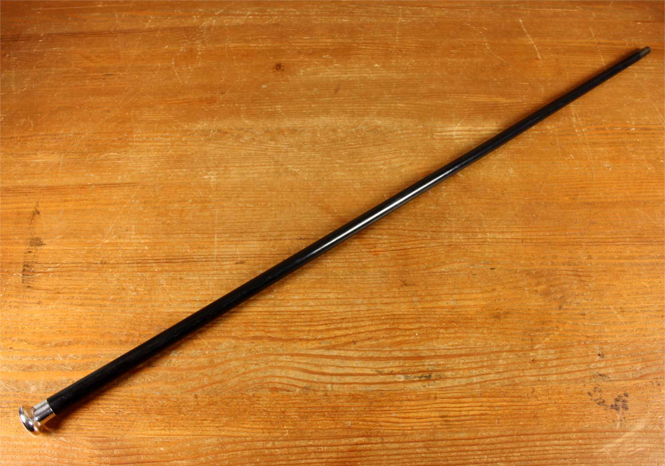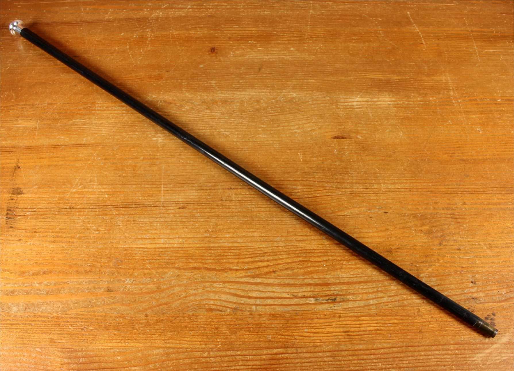This antique walking cane which has a beautiful ebonised wooden shaft has a plain silver handle to one end hallmarked for 1928 and a brass ferrule to the other.