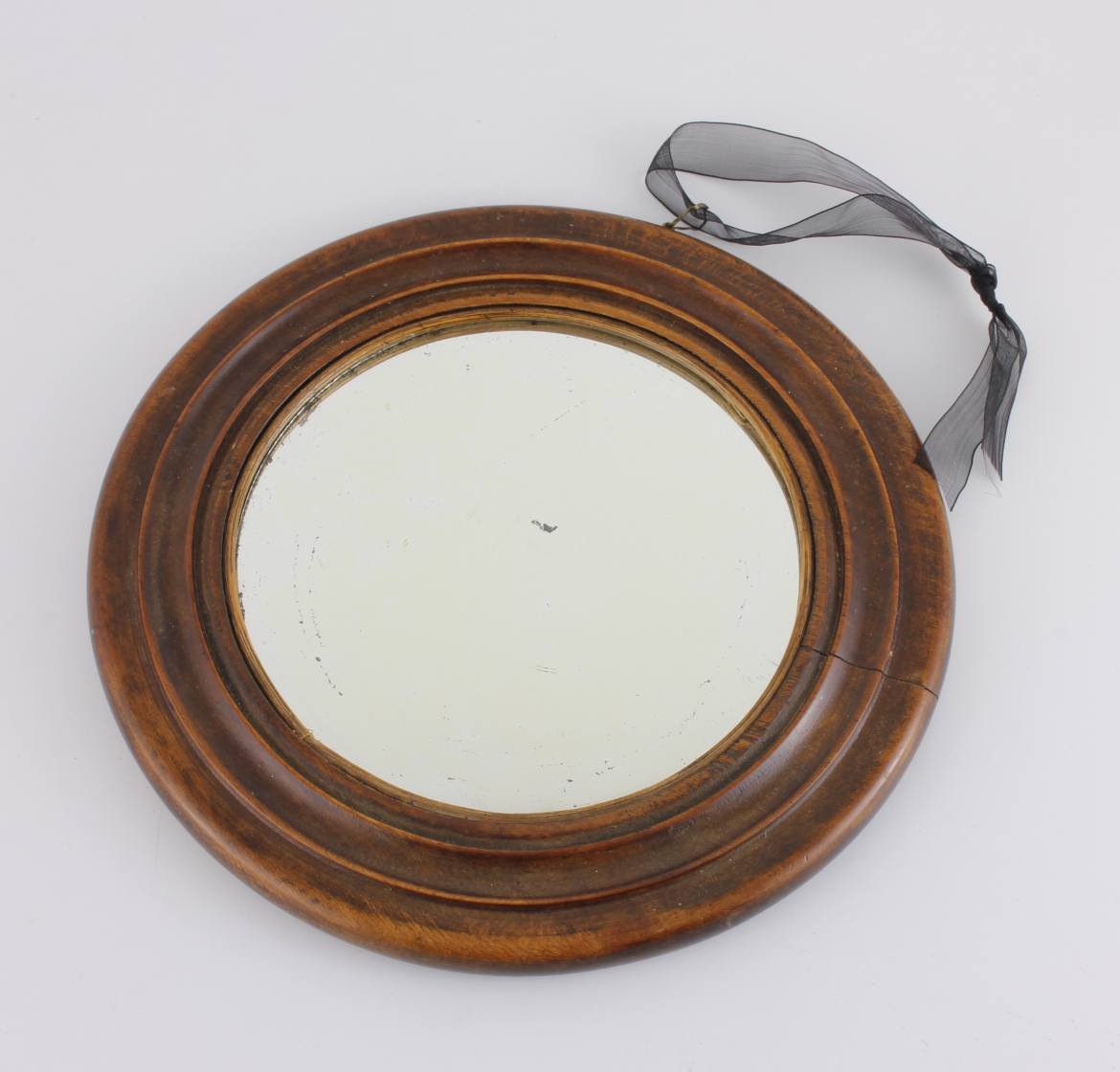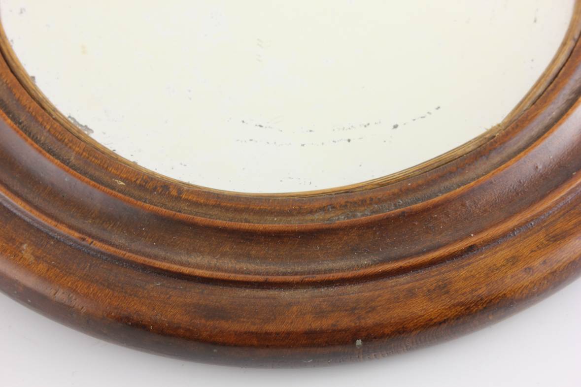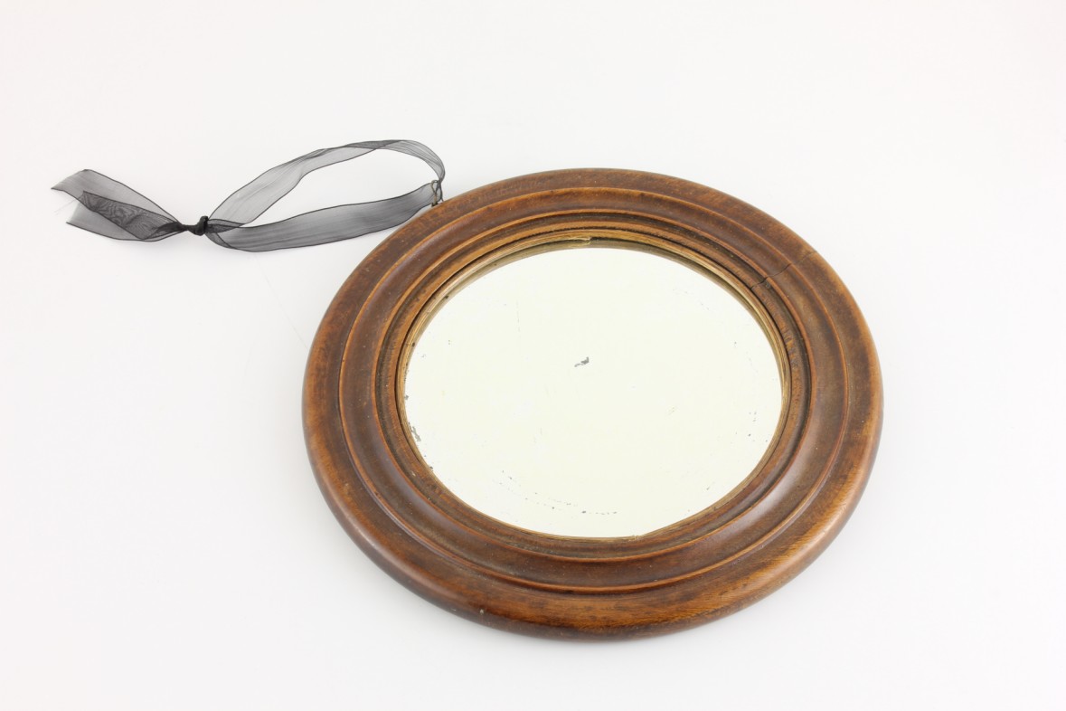 This charming small wall mirror has a round wooden frame and a mirror plate with some light foxing which gives it an attractive look.