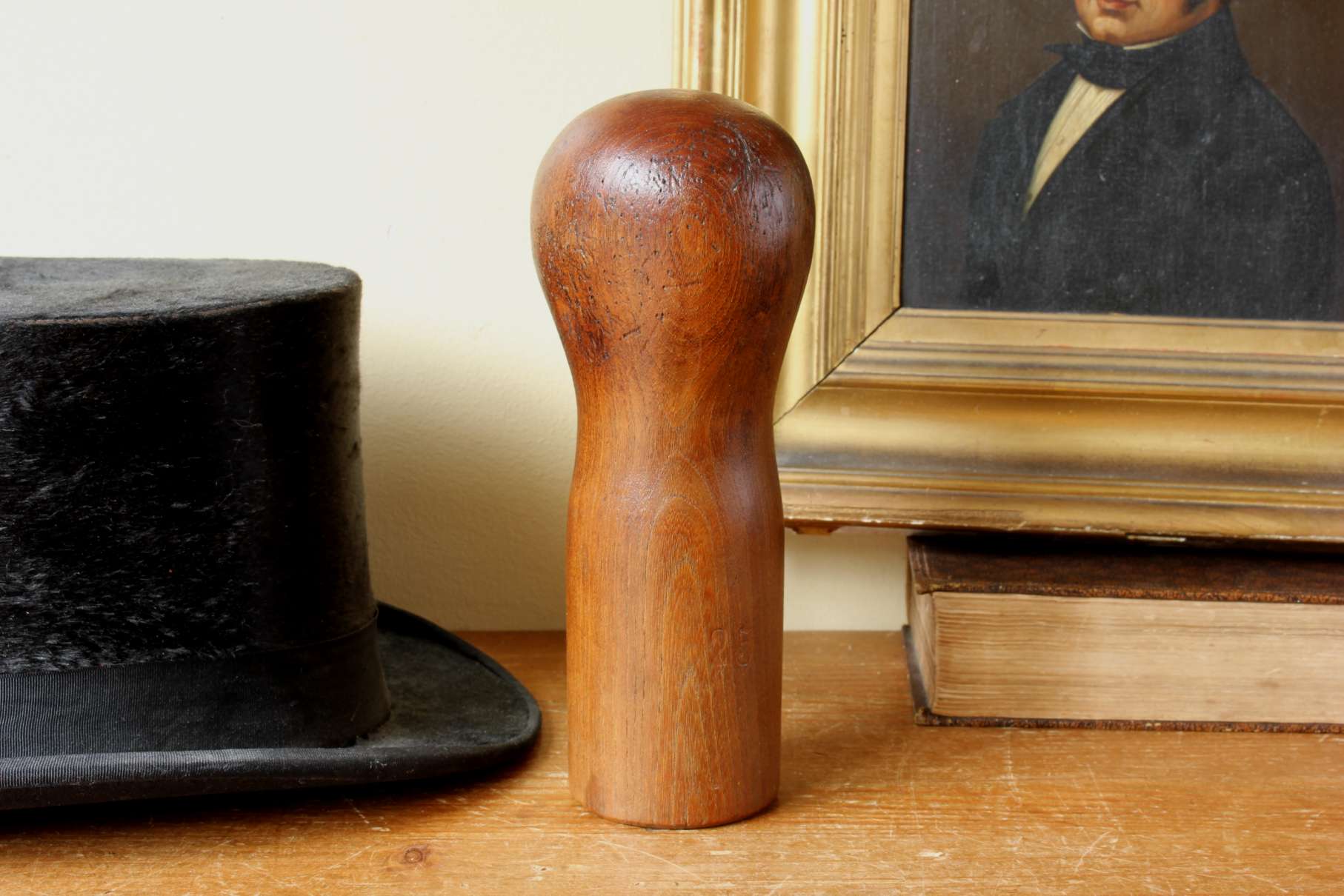 This handsome head shaped wooden block which is rare being a very small size is stamped with the number 25, has a wonderful dark brown colour and has accumulated lots of pin holes and wear over the years leaving a beautiful patina.