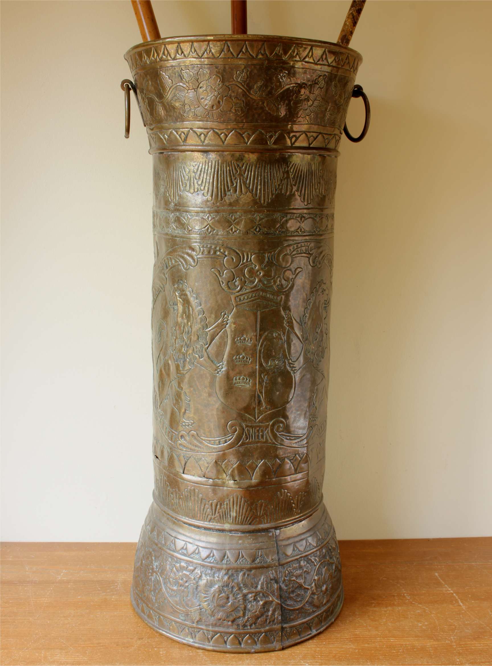 This large handsome antique brass umbrella / stick stand which was made in Netherlands dates from the beginning of the 20th century.
