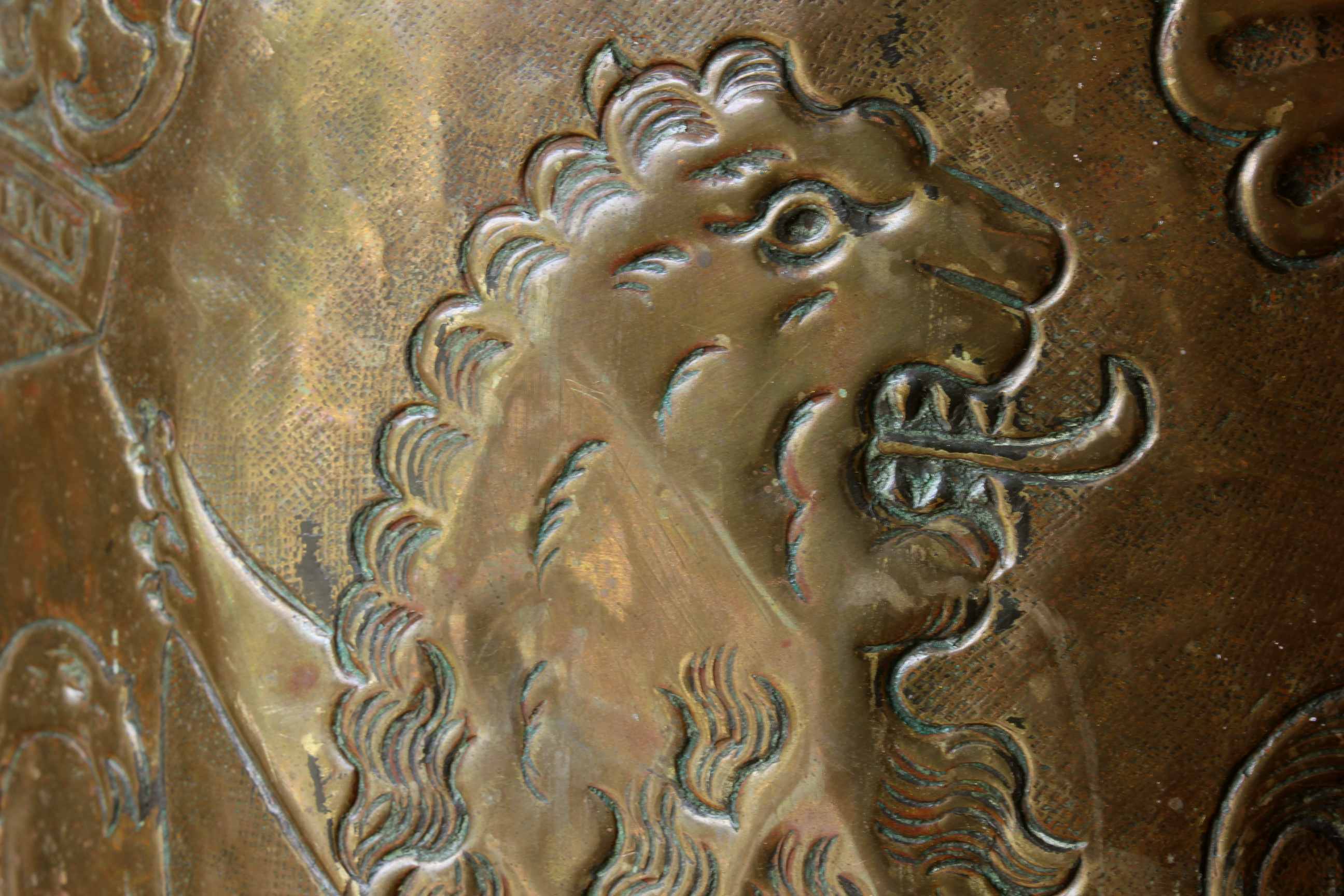 This unusual stand has two ring side handles, seamed edging and has lots of wonderful hand embossed floral decoration. The front has a Dutch Crest that has two lions on either side of a shield and the wording Sneek which is in the Netherlands.
