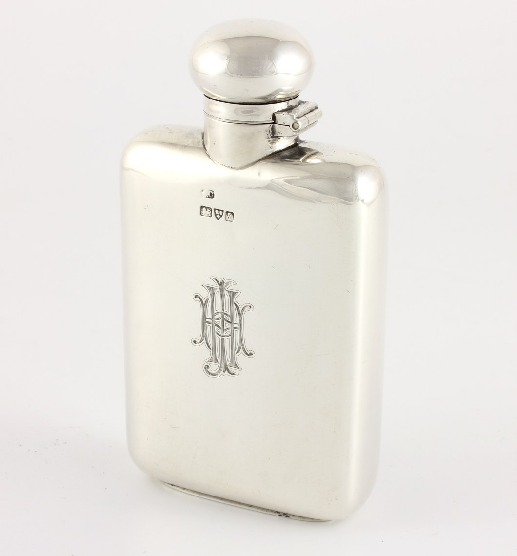 This tactile Edwardian spirit hip flask which is made of silver is fully hallmarked for Chester 1905, has a hinged flip / bayonet top and is made by Colen Hewer Cheshire.