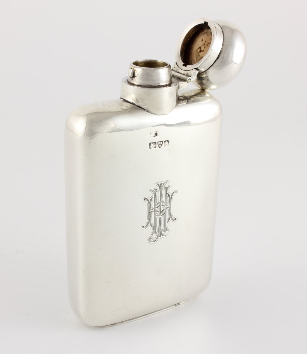 This handsome hip flask has a beautiful monogram to the front and a hinged flip / bayonet top which has had a new cork fitted so seals well and does not leak and is a good size to fit in a pocket.
