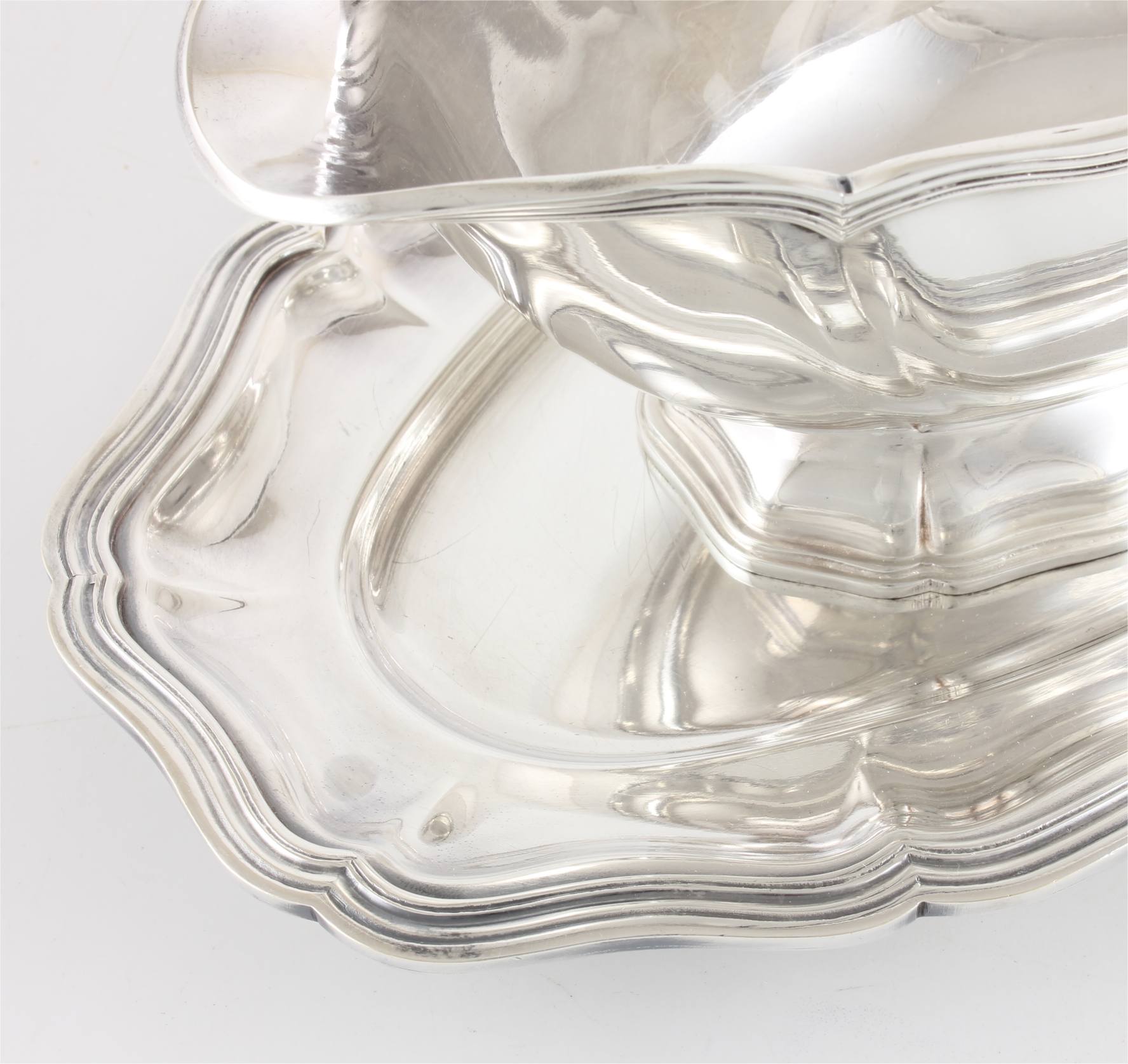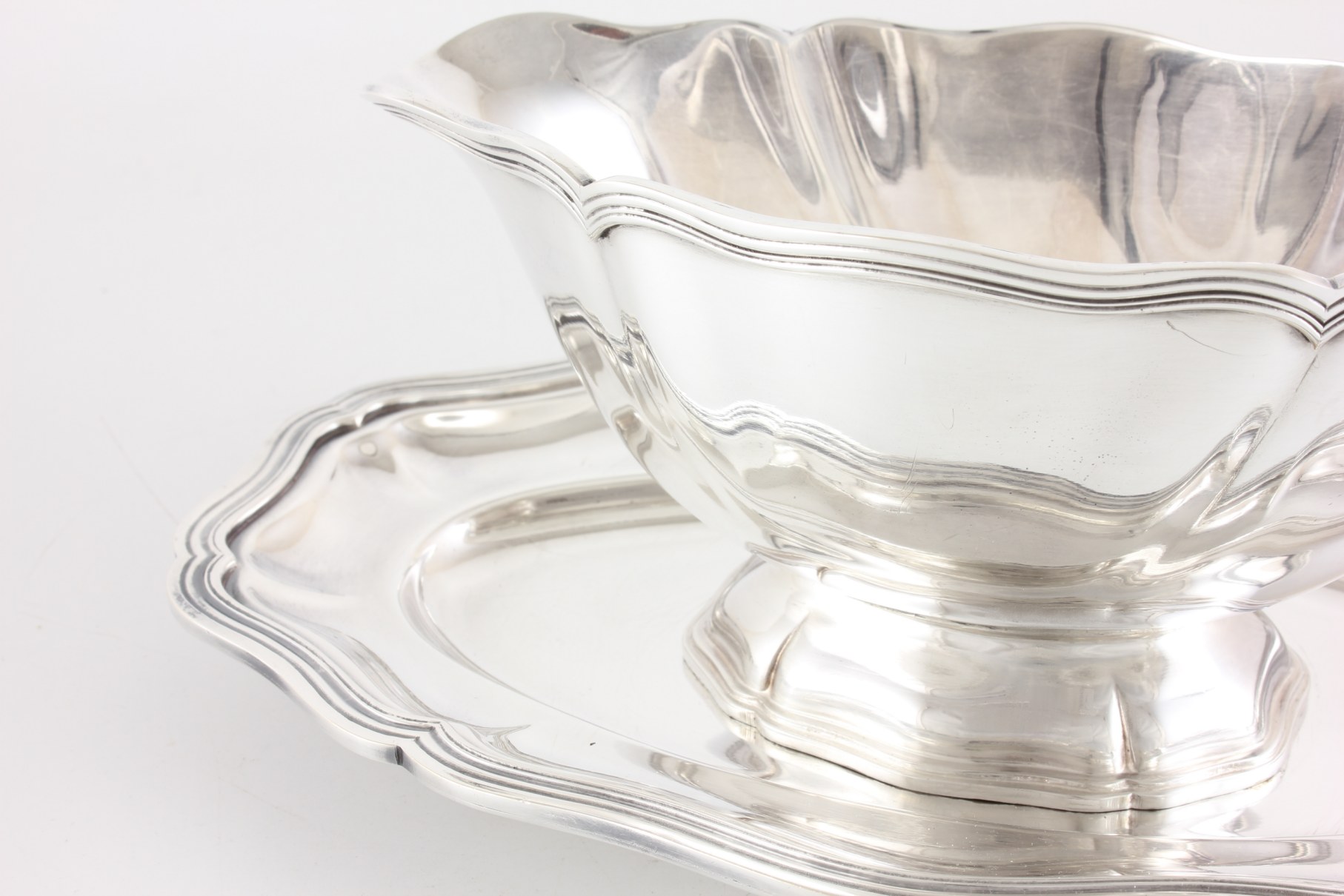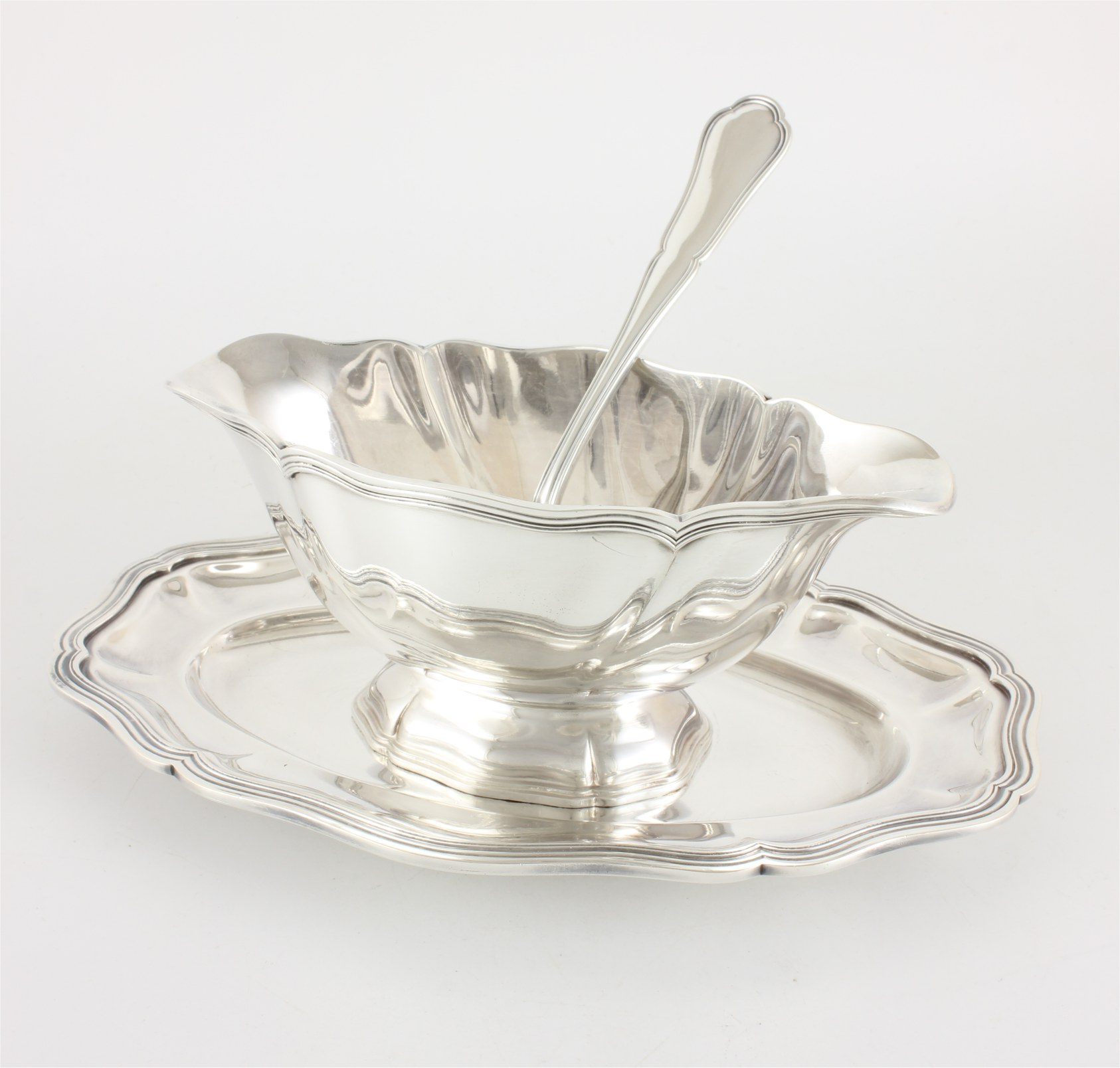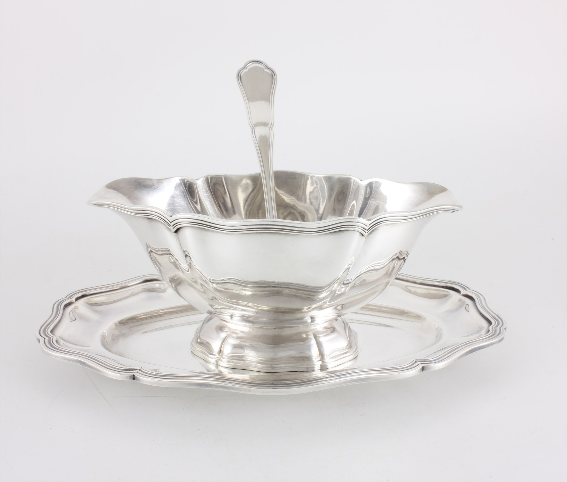 This sauciere has a wonderful wavy design and sits on it's attached underplate that is marked to the underside with the French maker's marks. This sauce bowl comes with it's St Medard silver plated sauce ladle.