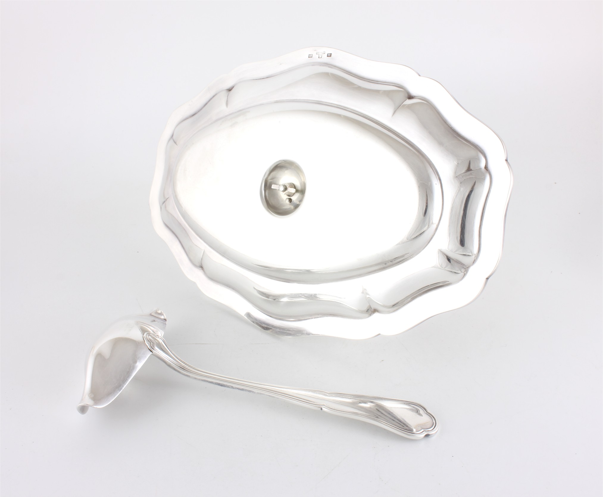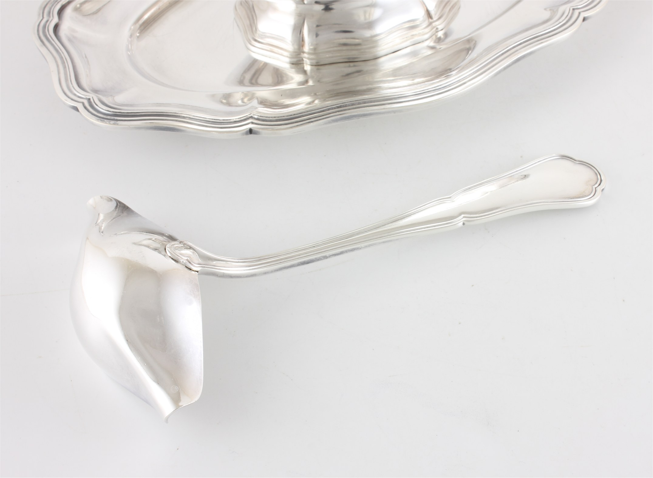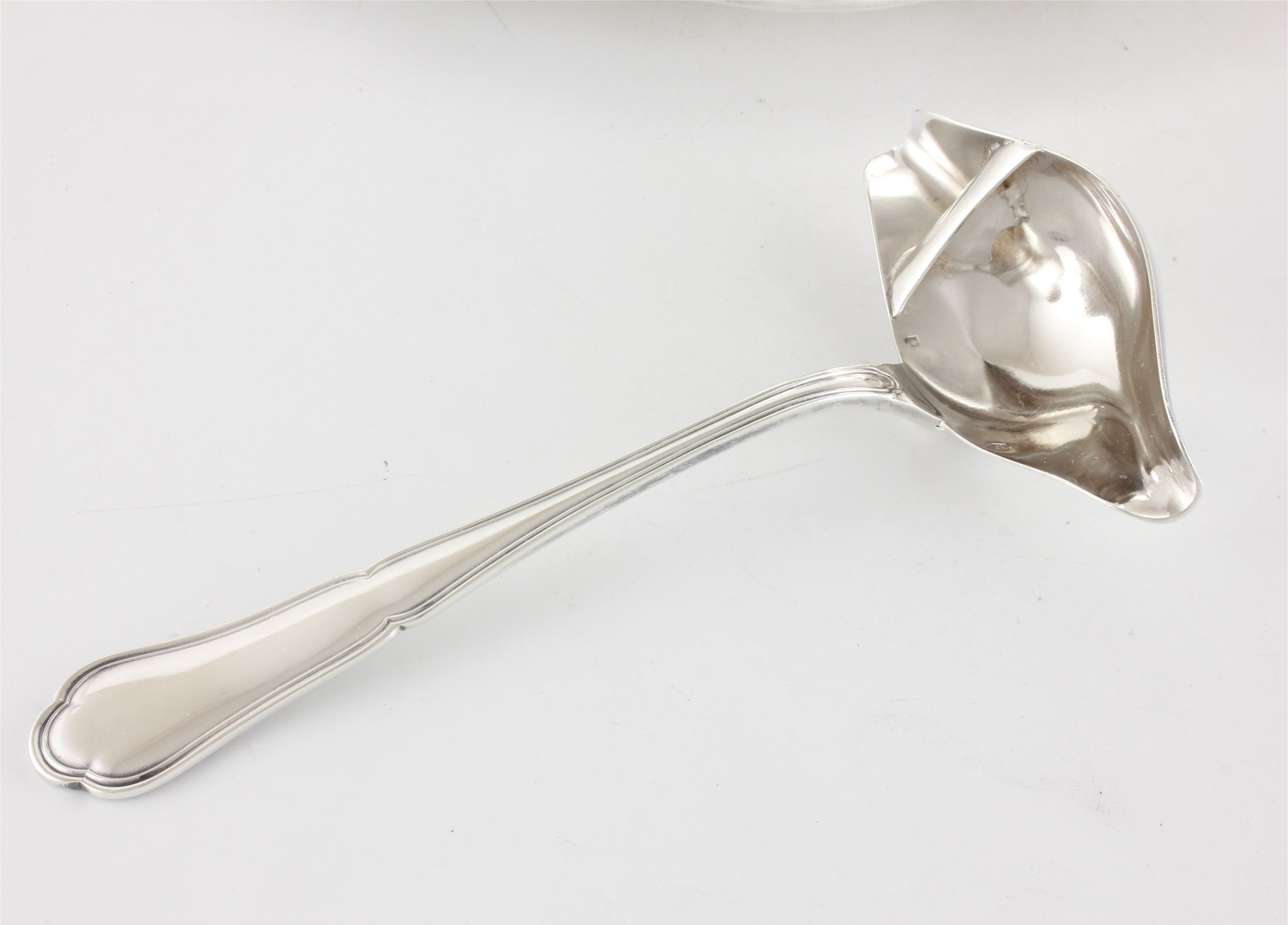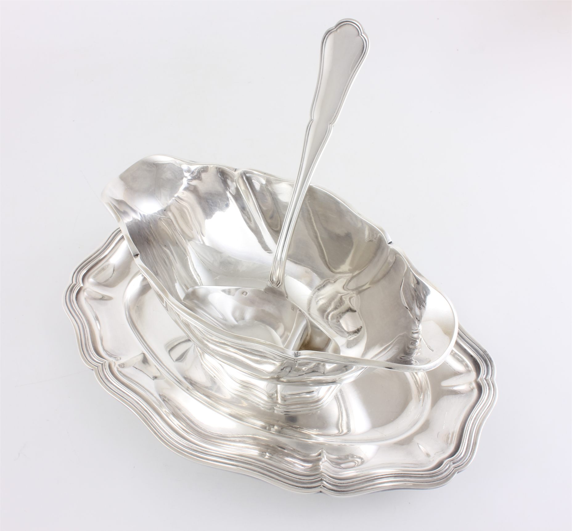 This sauciere has a wonderful wavy design and sits on it's attached underplate that is marked to the underside with the French maker's marks. This sauce bowl comes with it's St Medard silver plated sauce ladle.