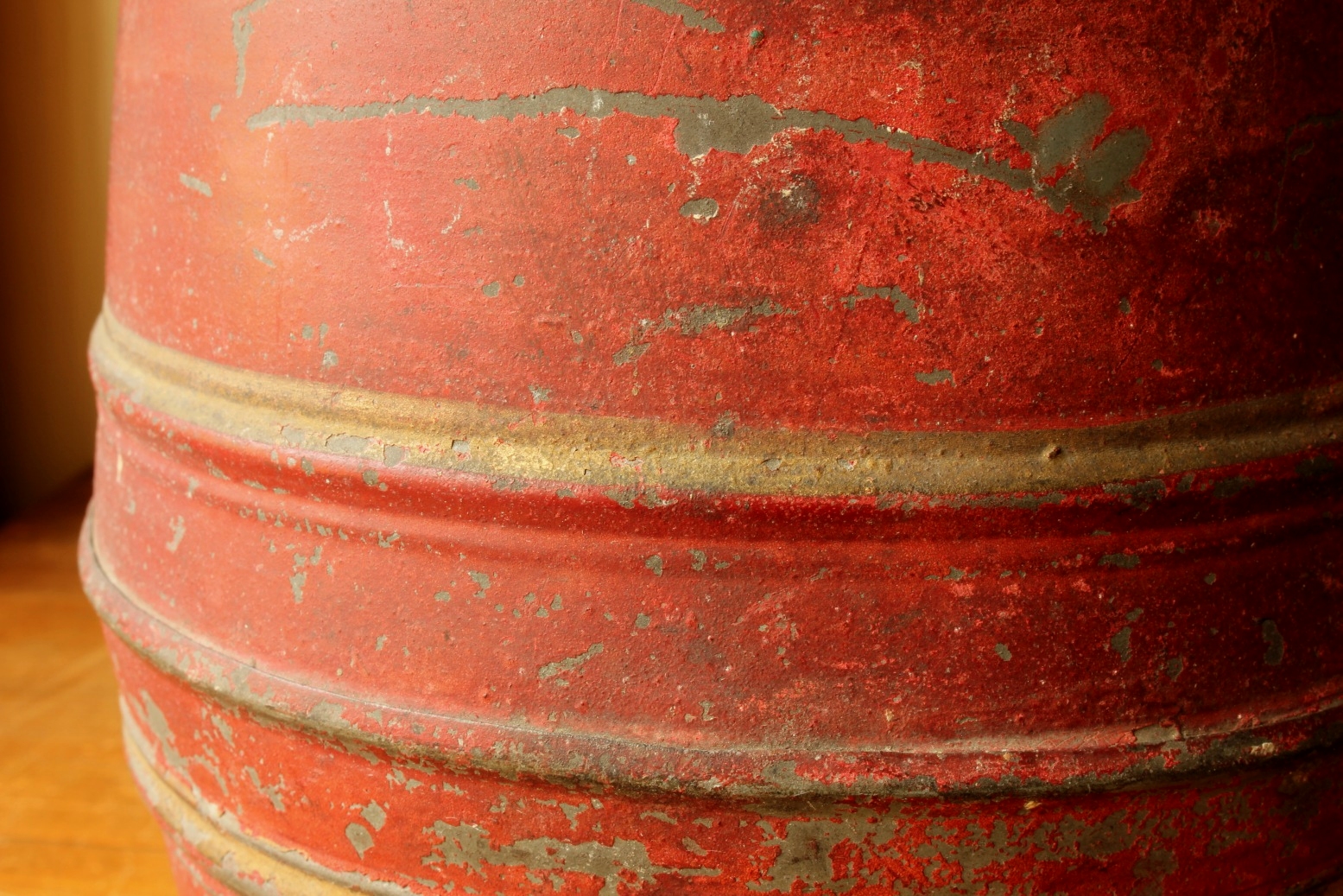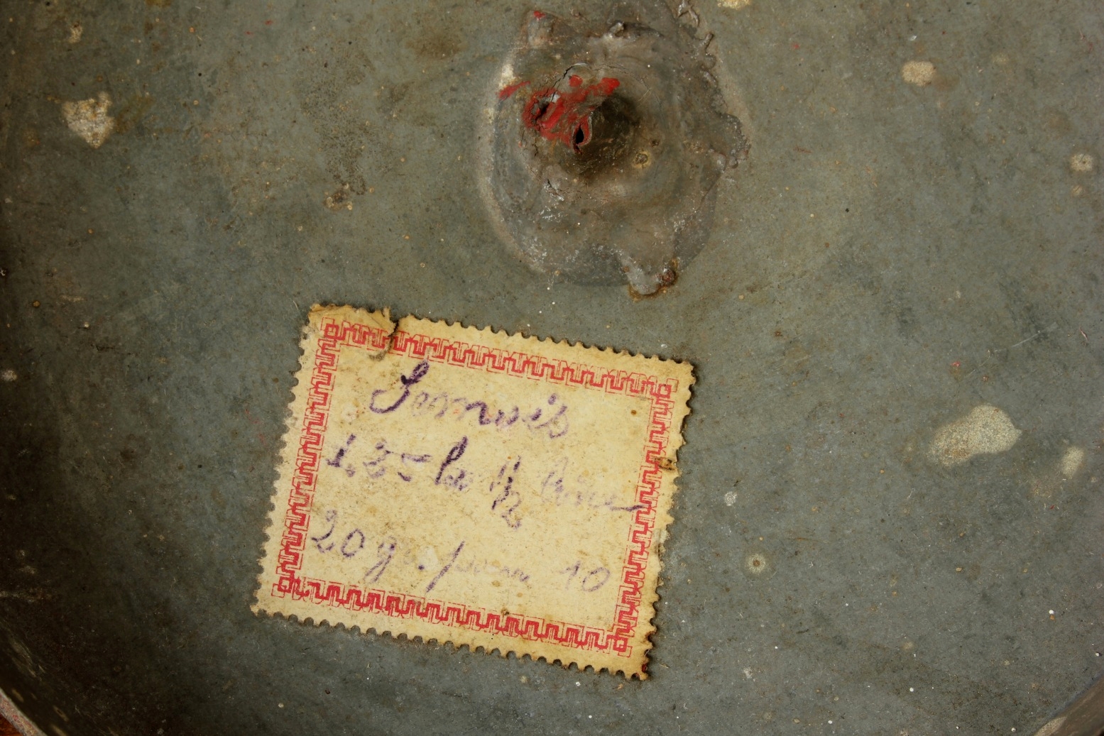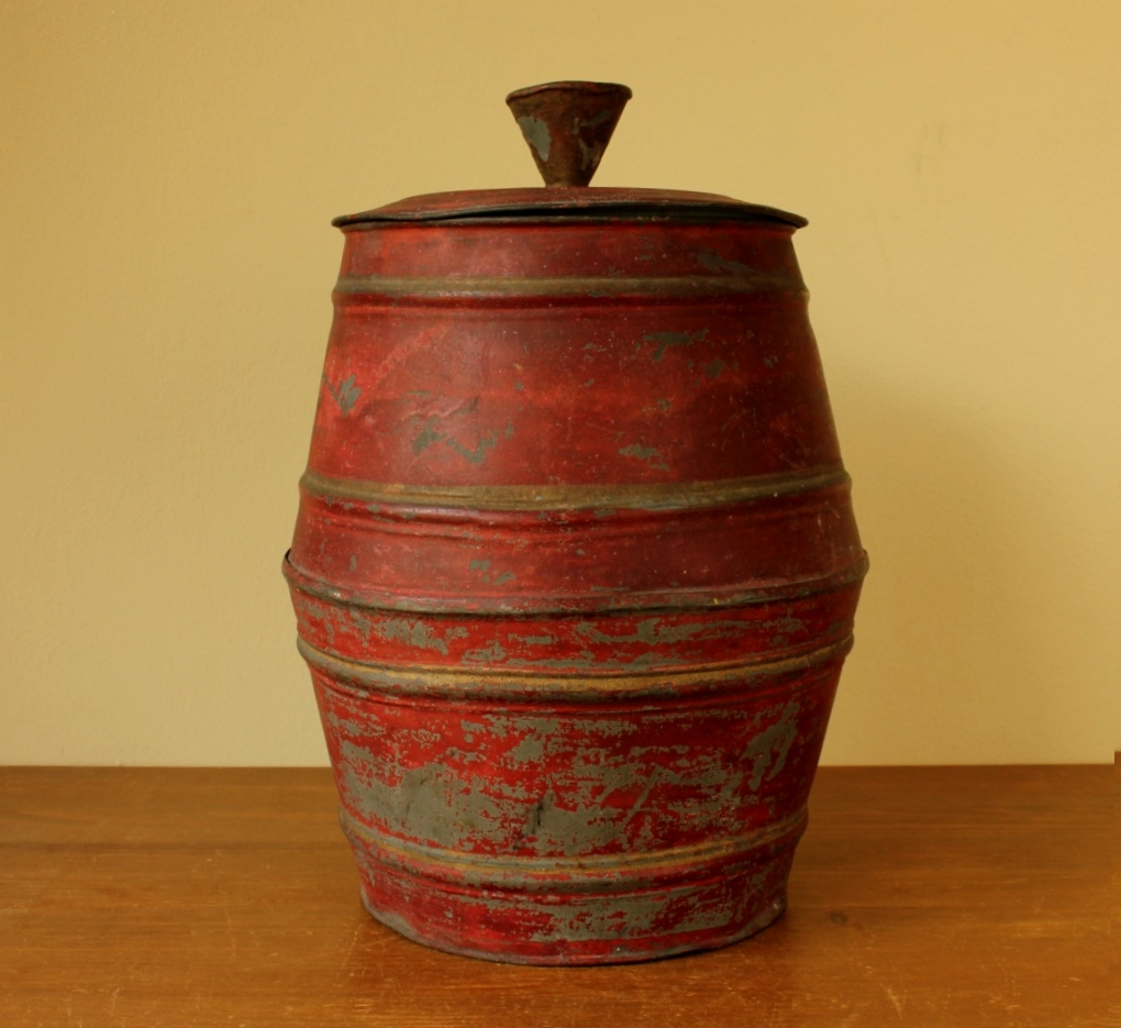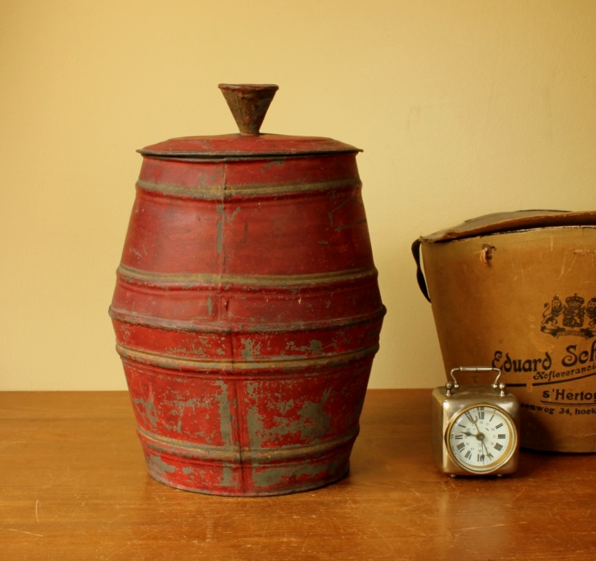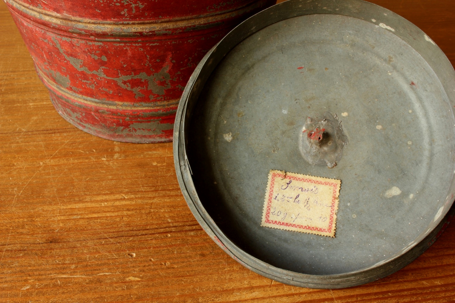 This red jar has a wonderful shape with faded gold detailing and a nice patina giving it just the right look. There is an original shop label to the inside lid with Samois handwritten.