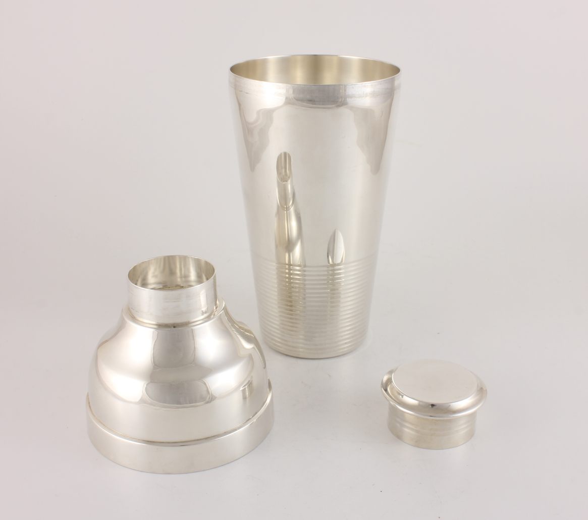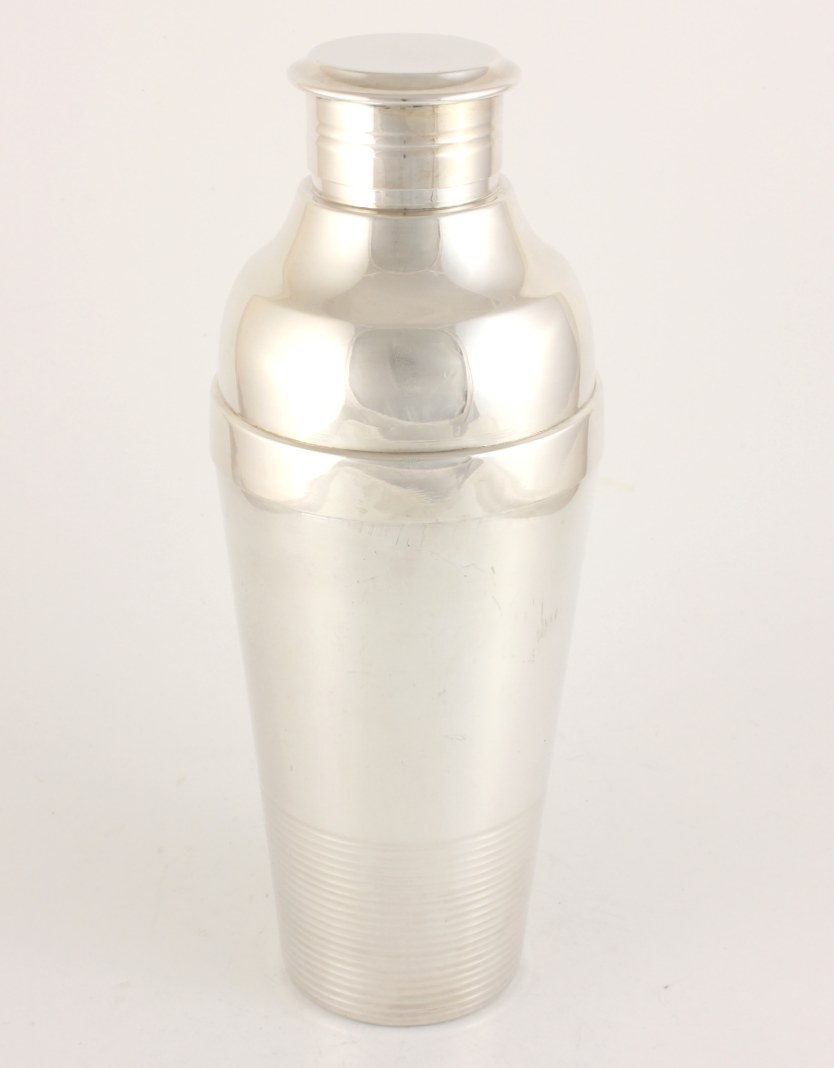 This large and impressive French cocktail shaker which is a 3 piece design is made of silver plate by top silversmith Christofle and dates from c1940.