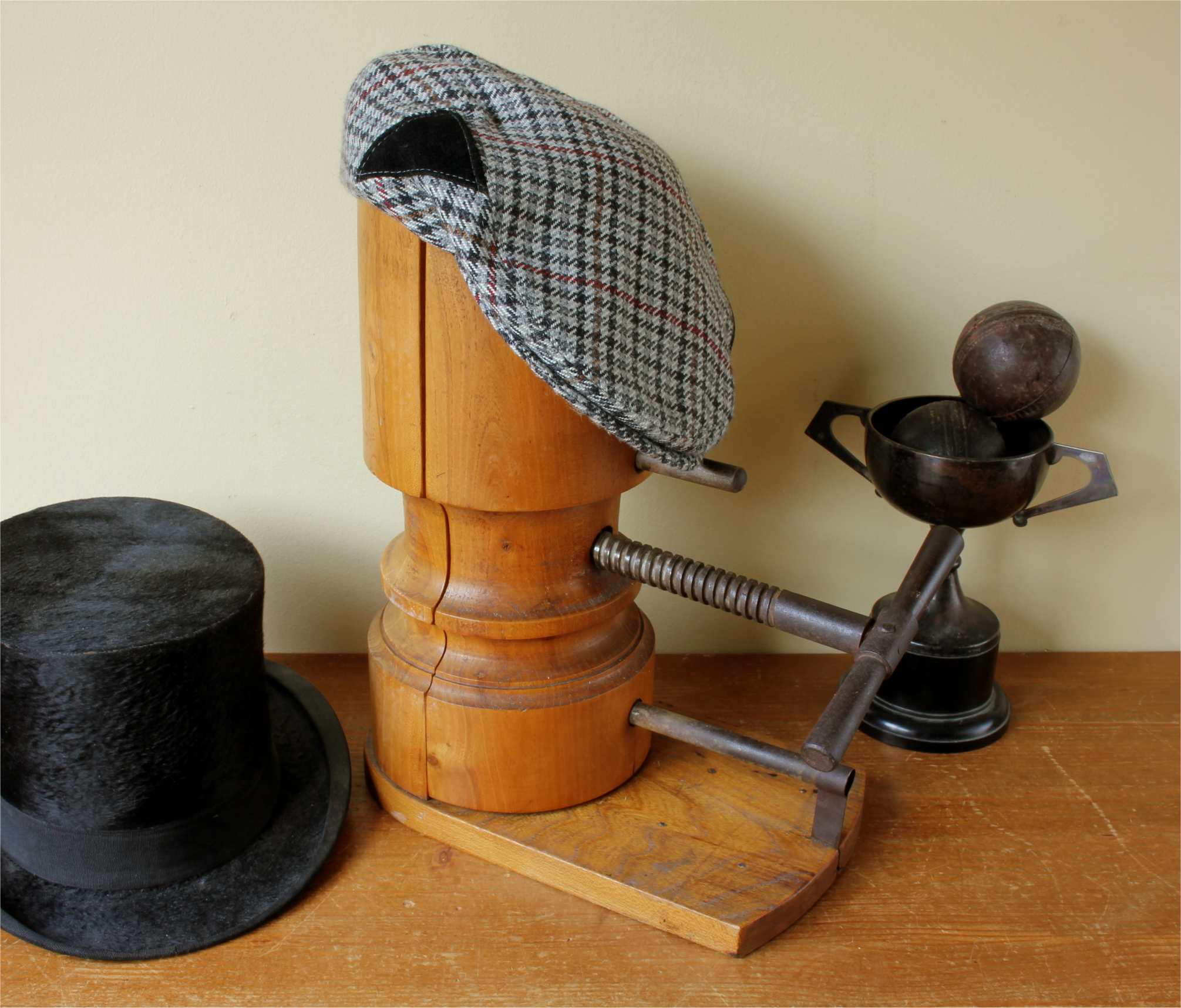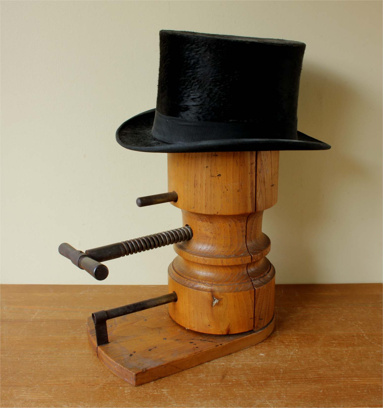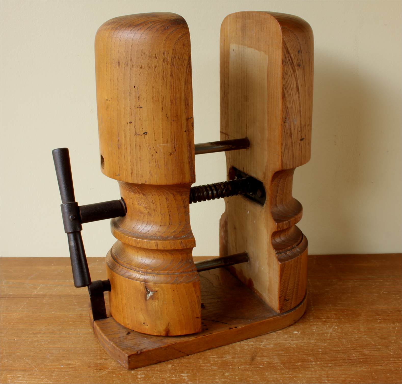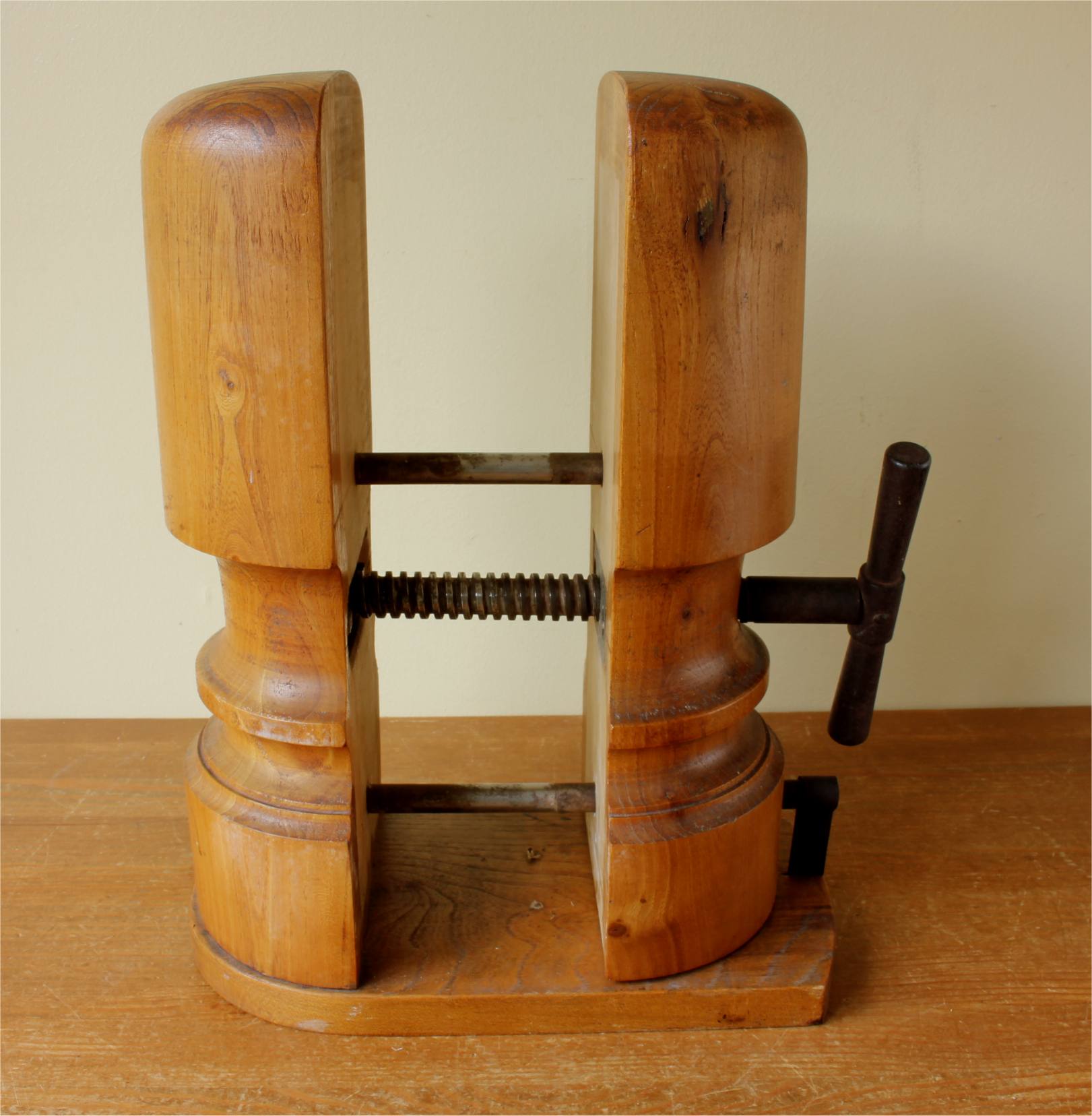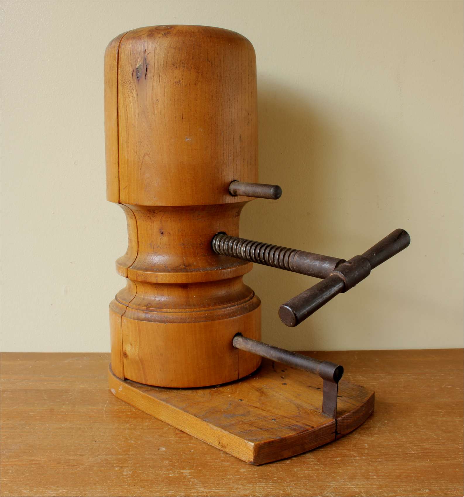 This handsome Milliner's hat stretcher which dates from the early 20th century sits on it's wooden base and has an attractive golden brown patina.