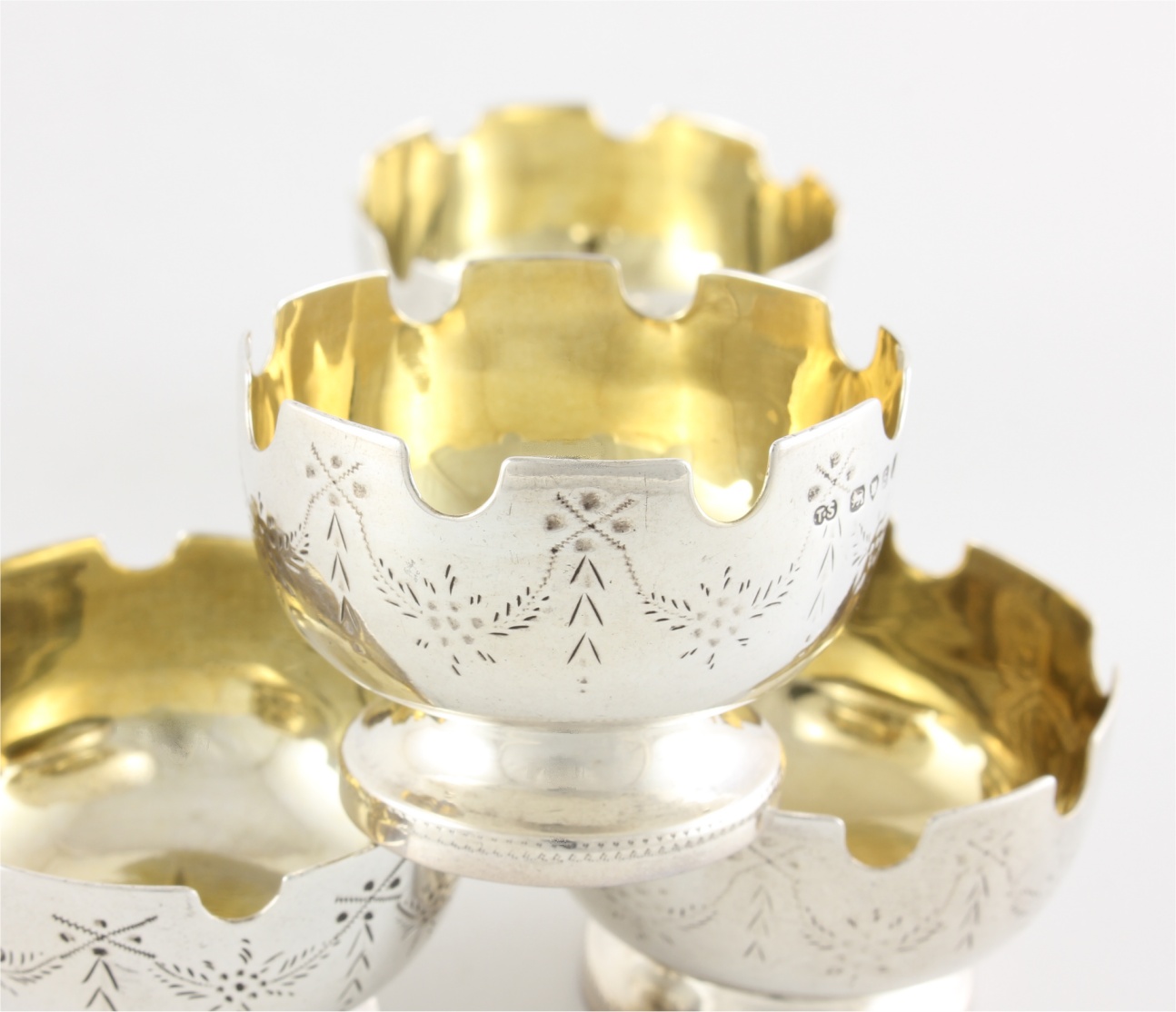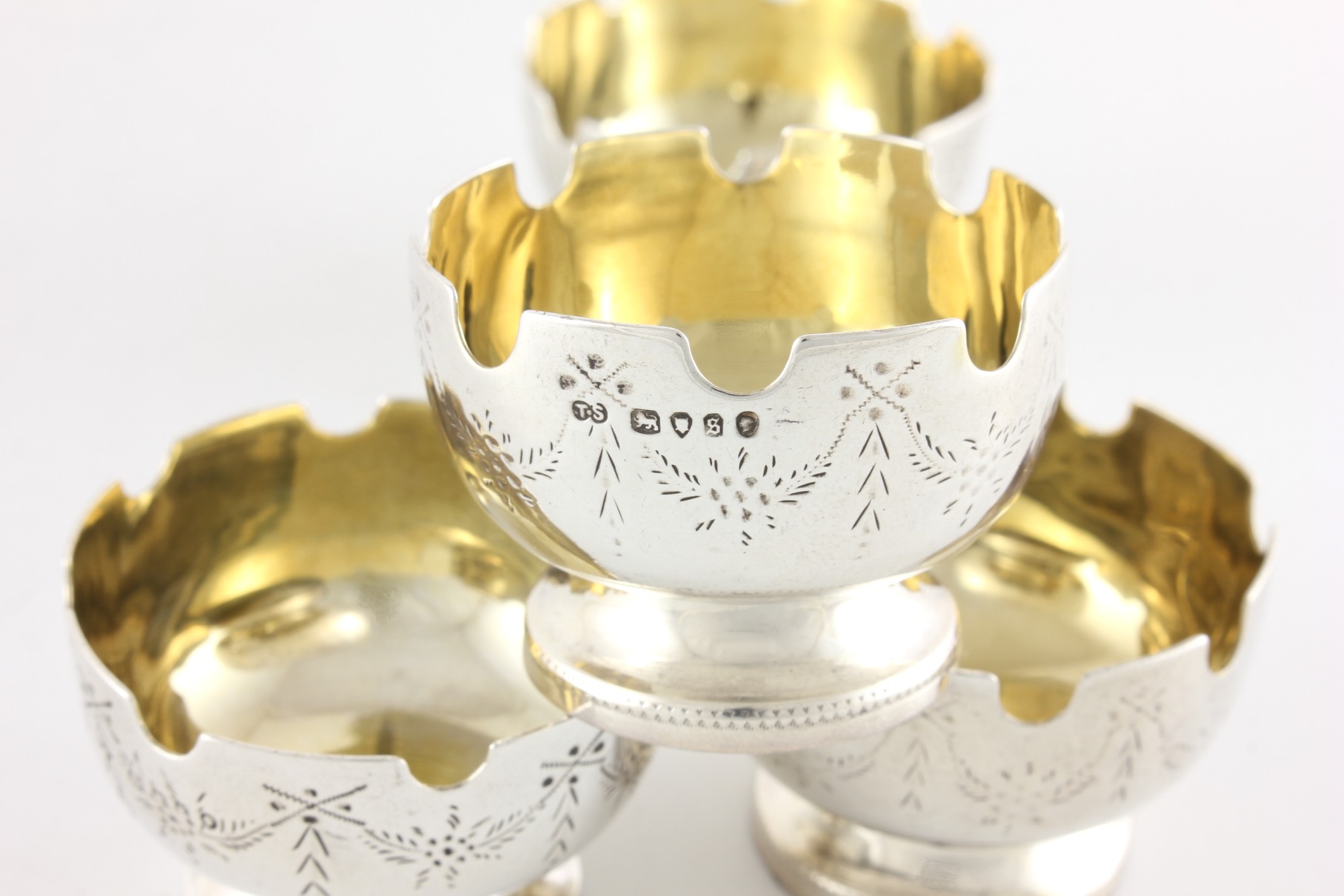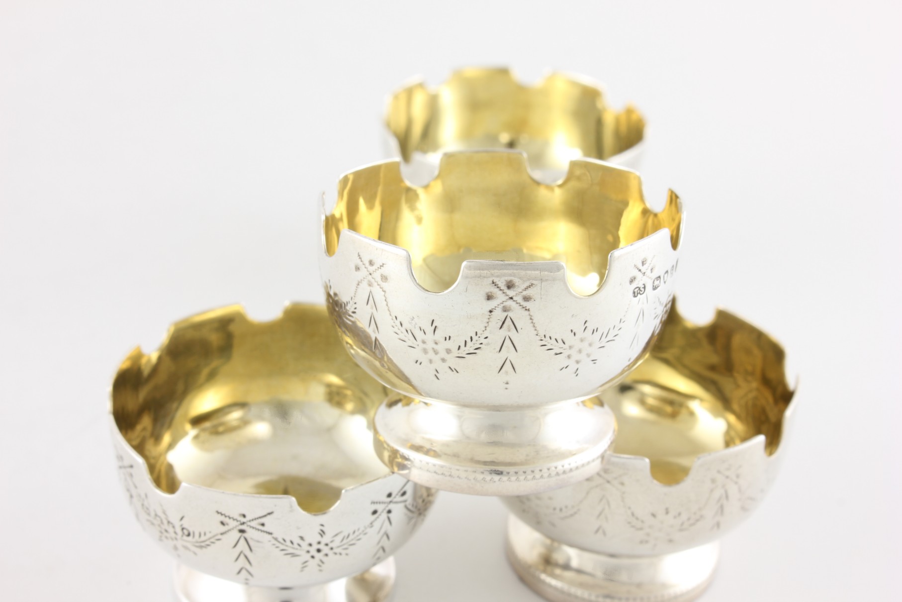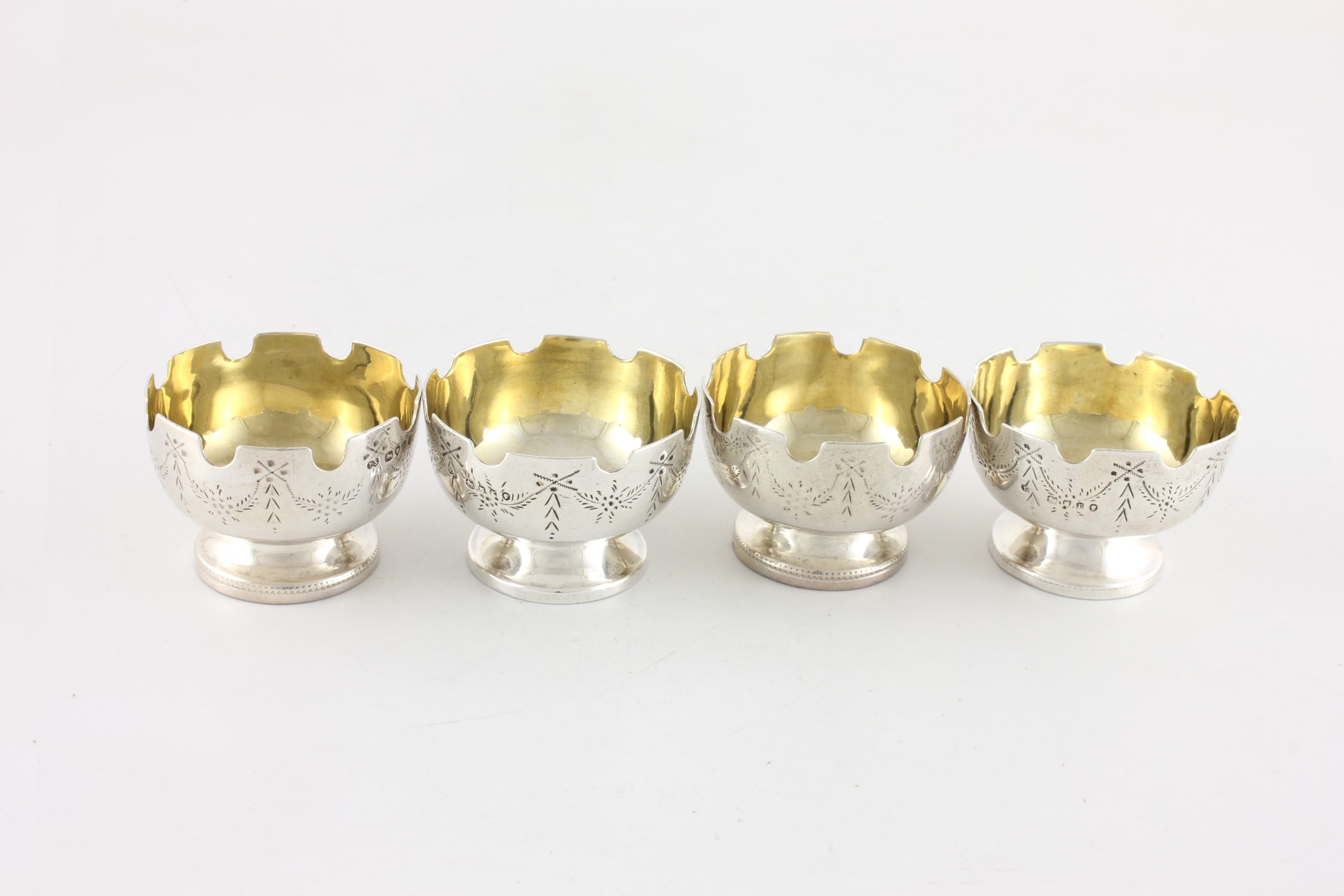 These unusual Victorian salts are of excellent quality with the top edge having a castle turret design, have a swag pattern to the outer, sit on raised feet and are nicely gilded to the insides.