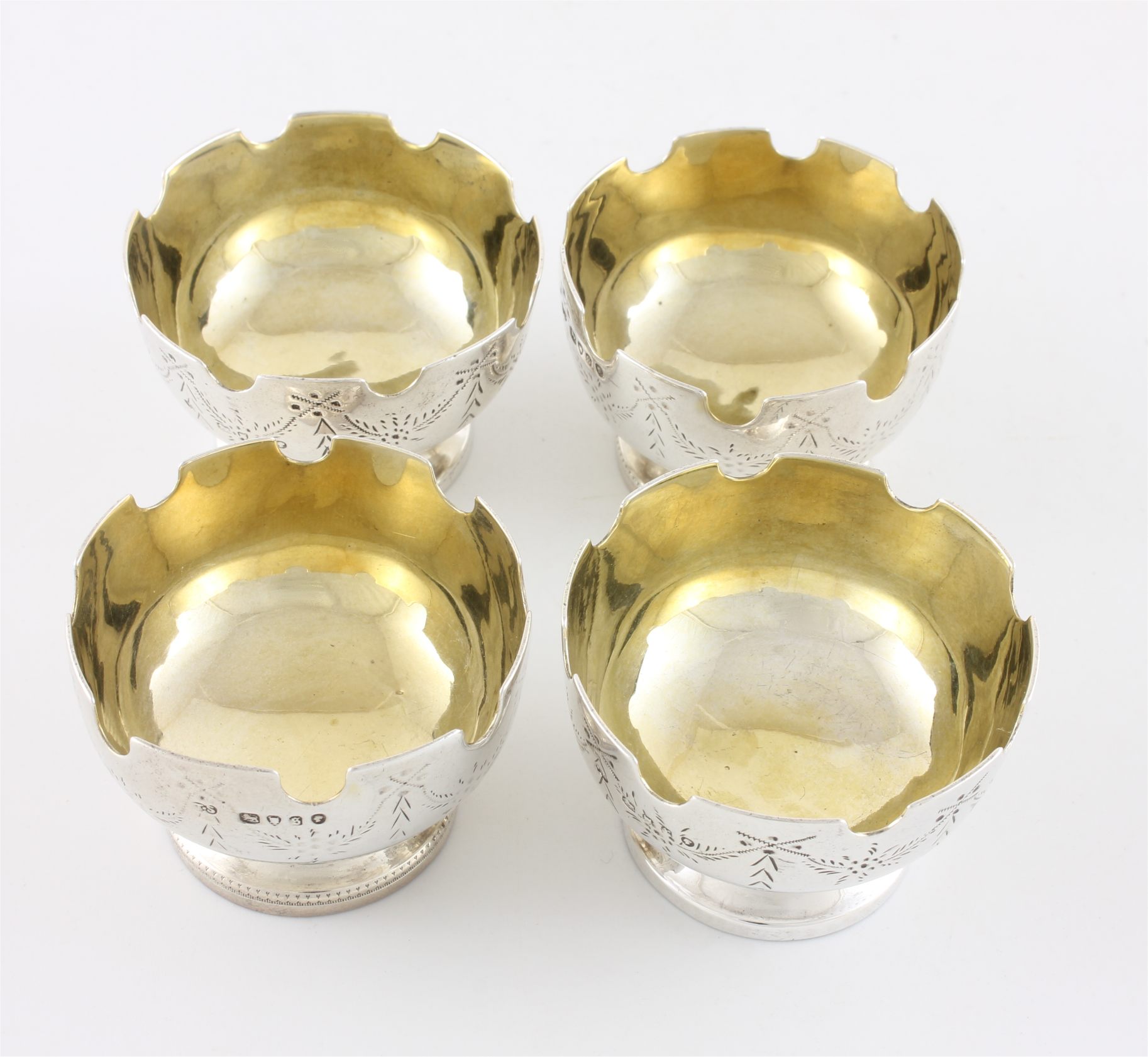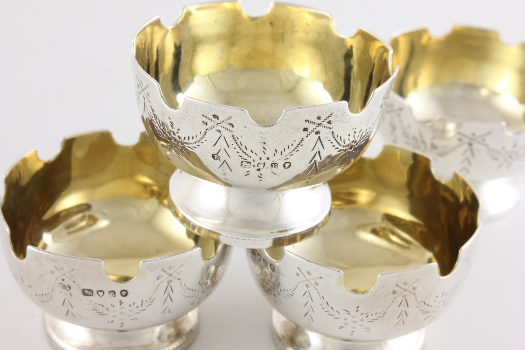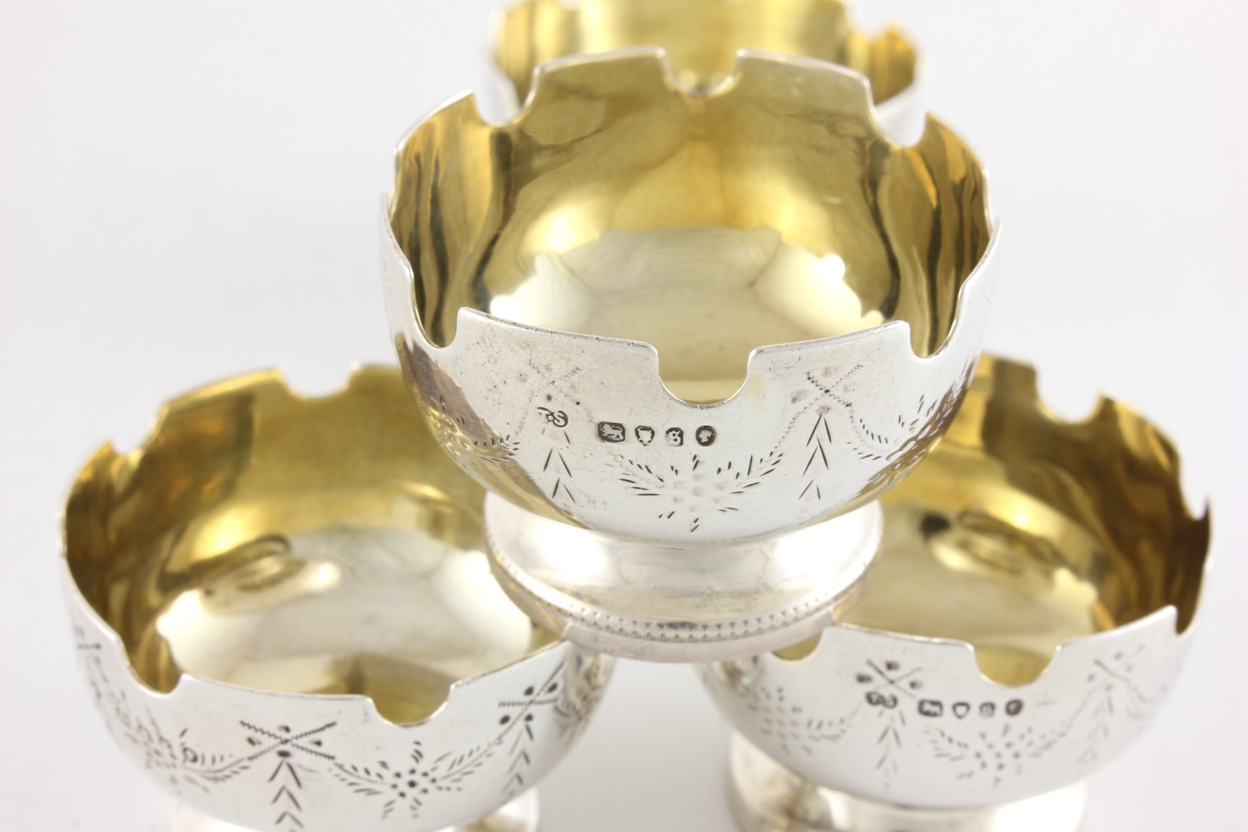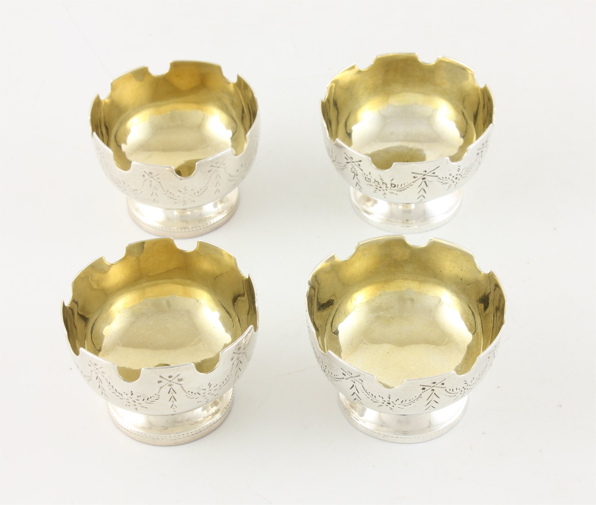 These unusual Victorian salts are of excellent quality with the top edge having a castle turret design, have a swag pattern to the outer, sit on raised feet and are nicely gilded to the insides.