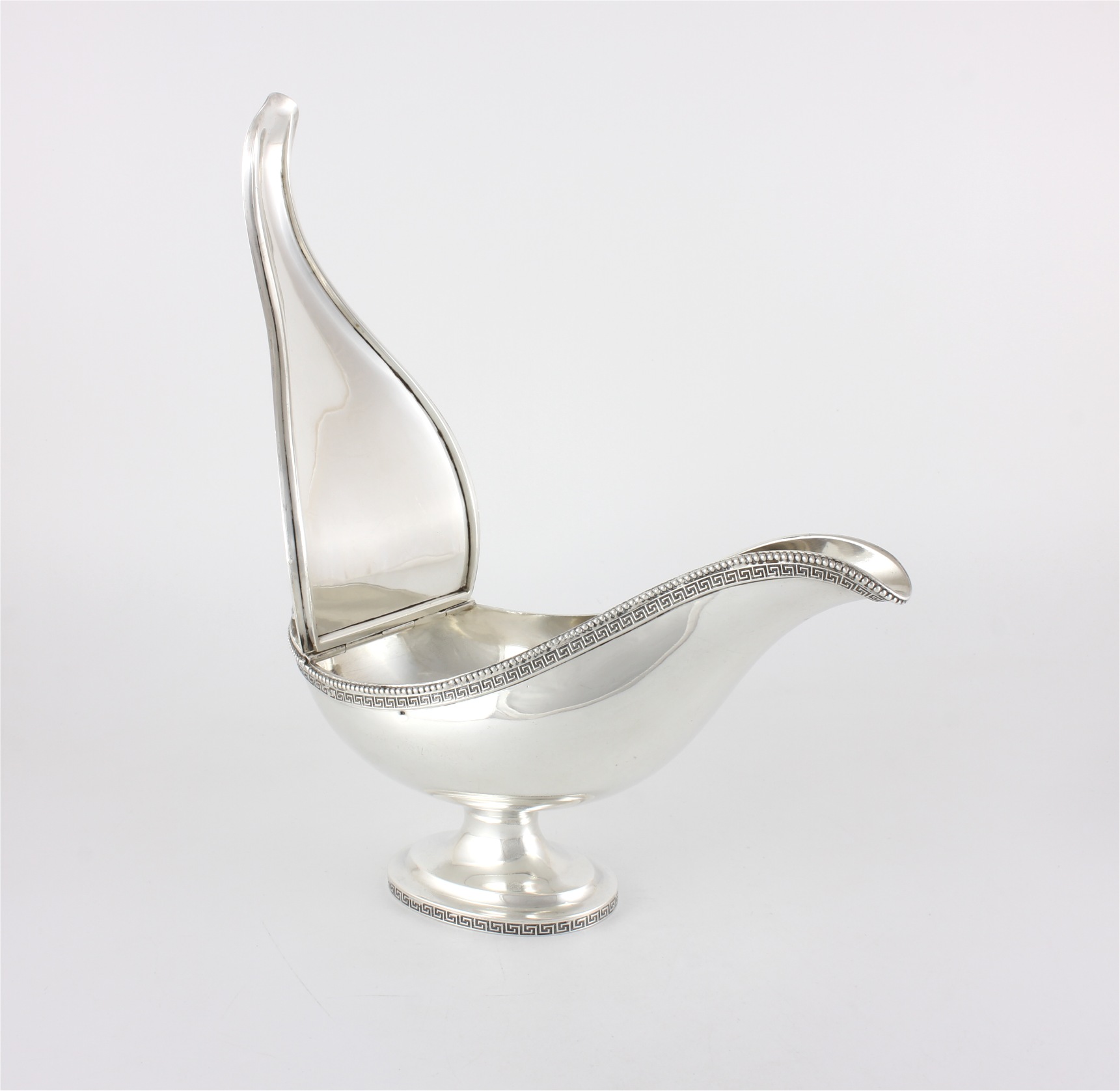 The gravy boat has a Greek key design and beaded edge which runs around the top of the body and is stamped with French import marks to the body and lid.