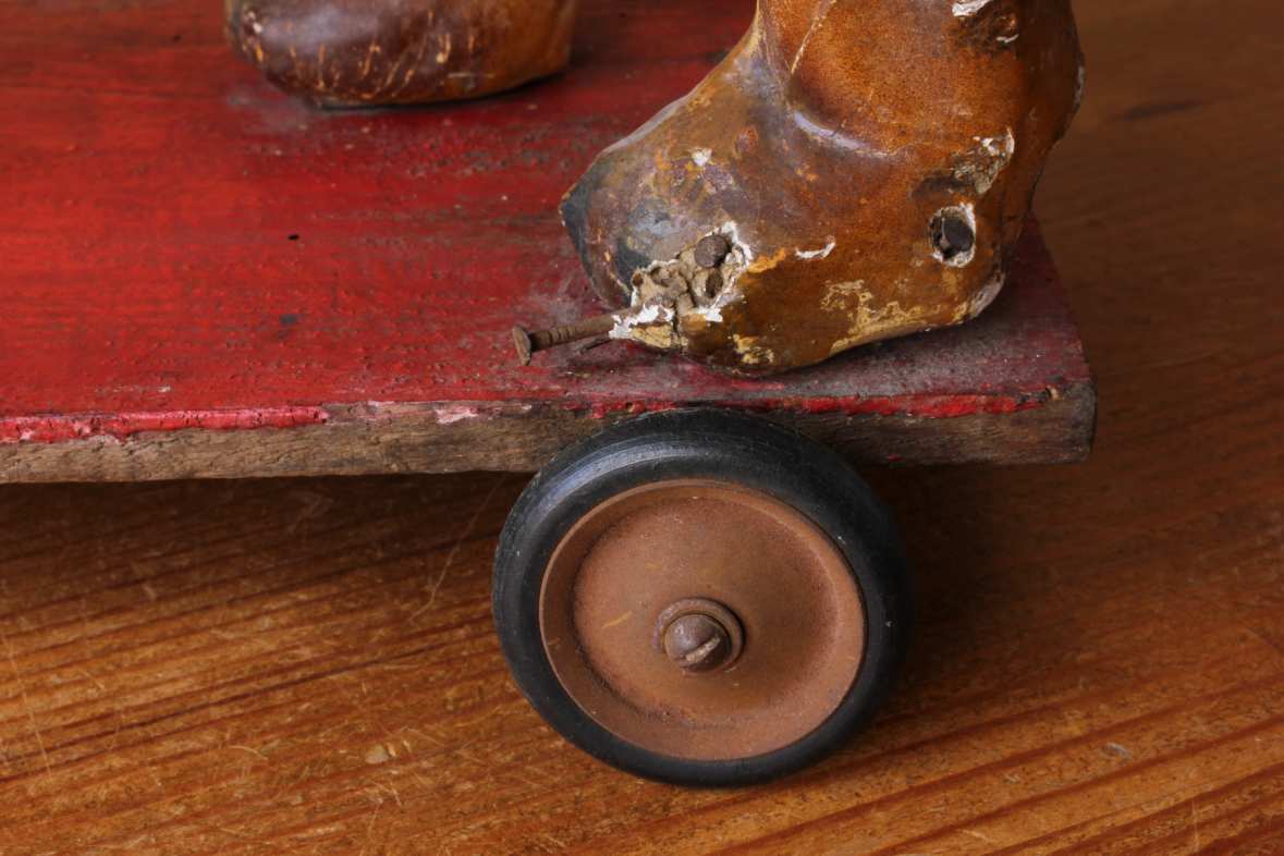 This charming lion is hand made of painted papier mache and stands on it's pull along wooden trolley.