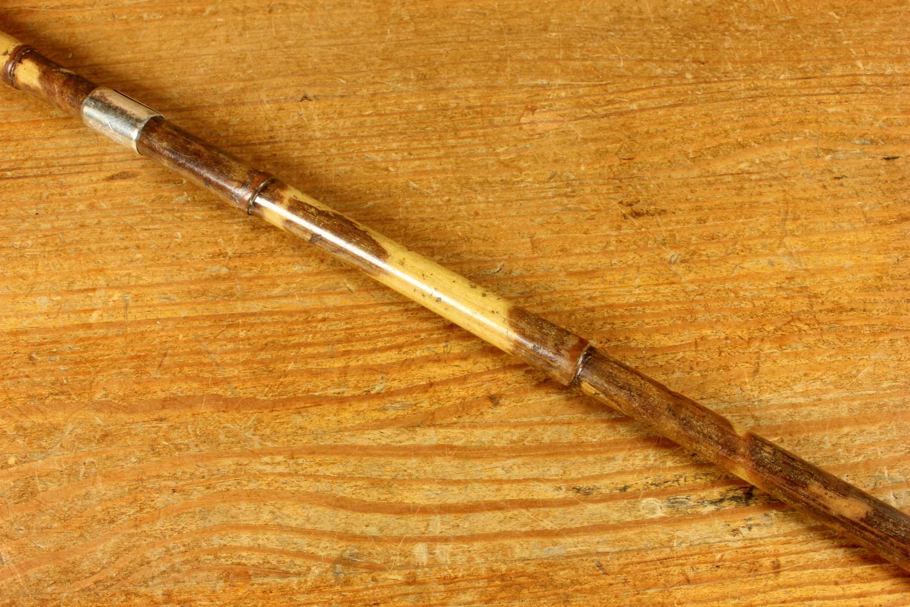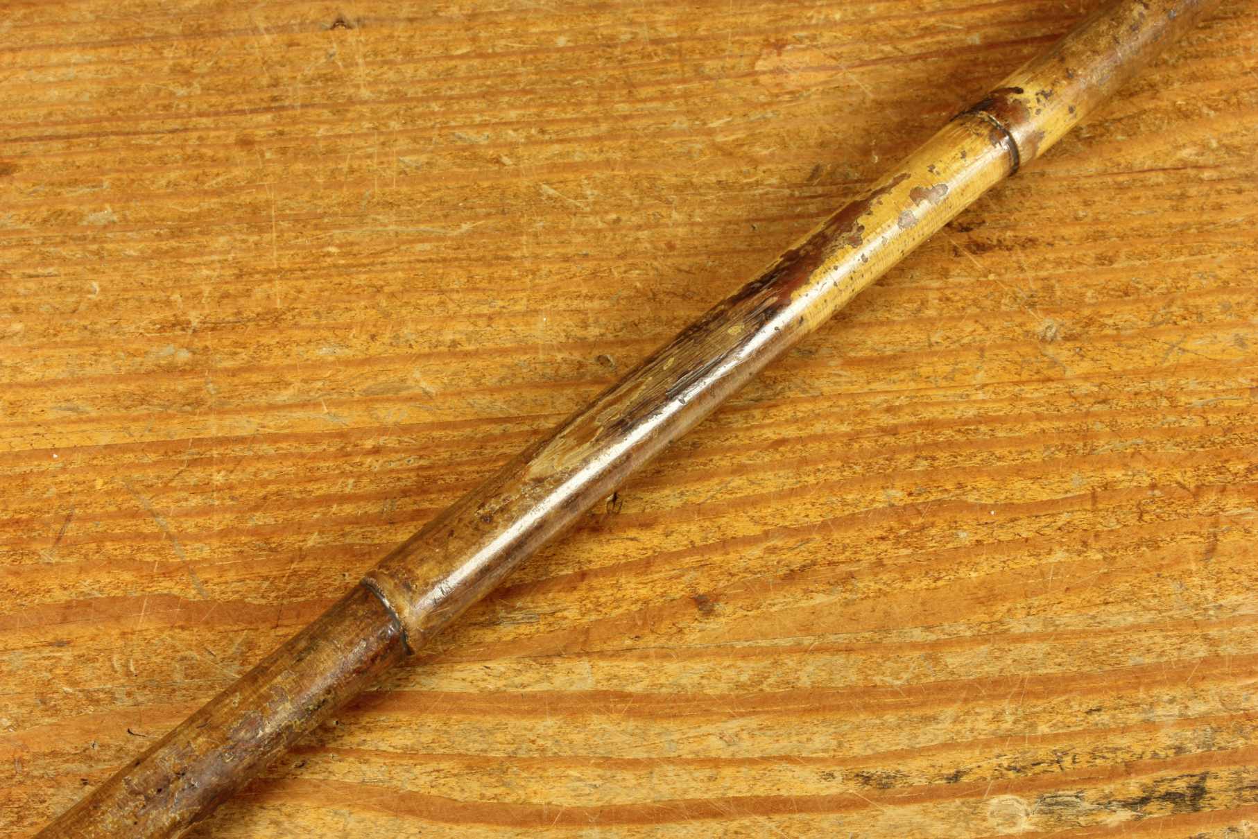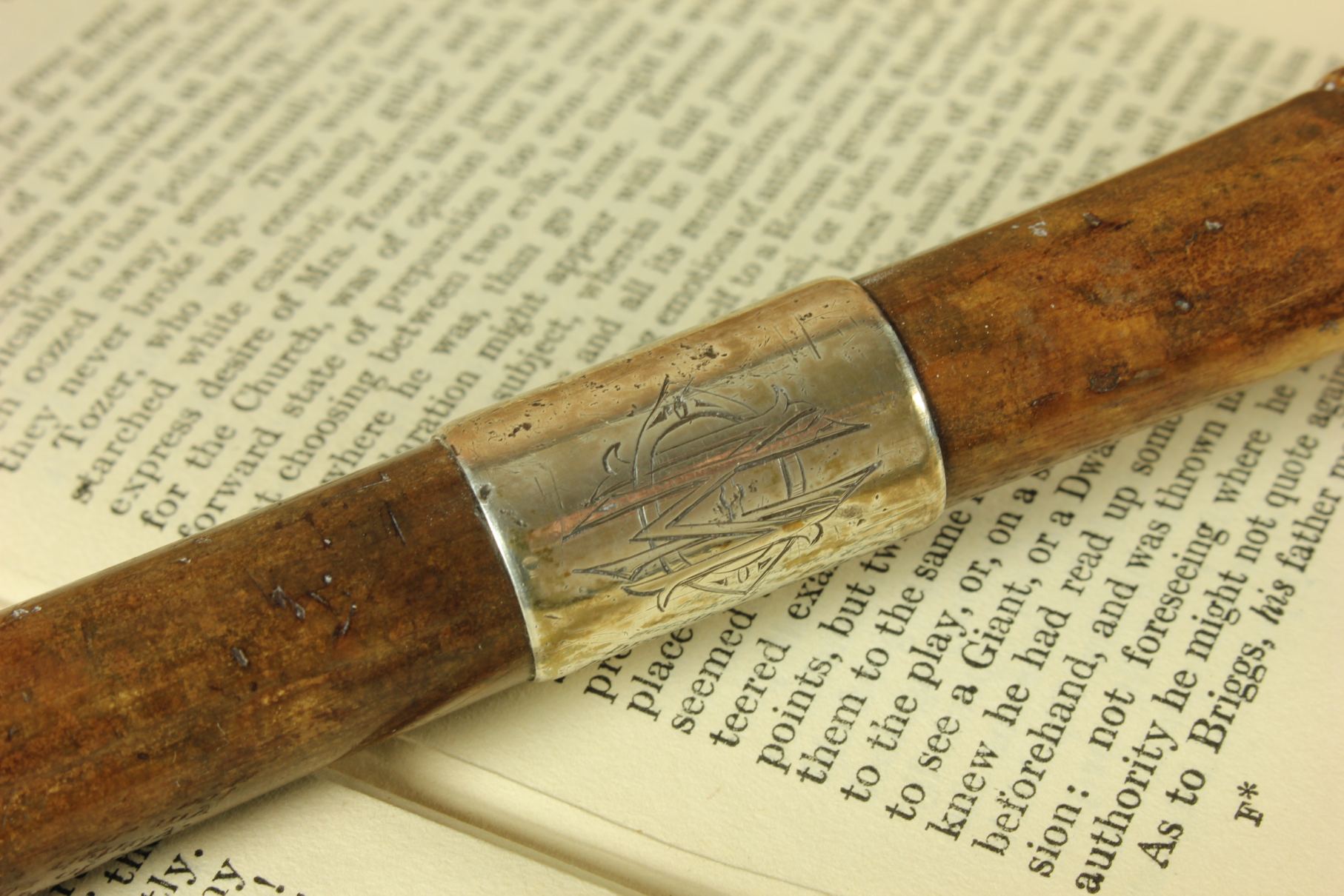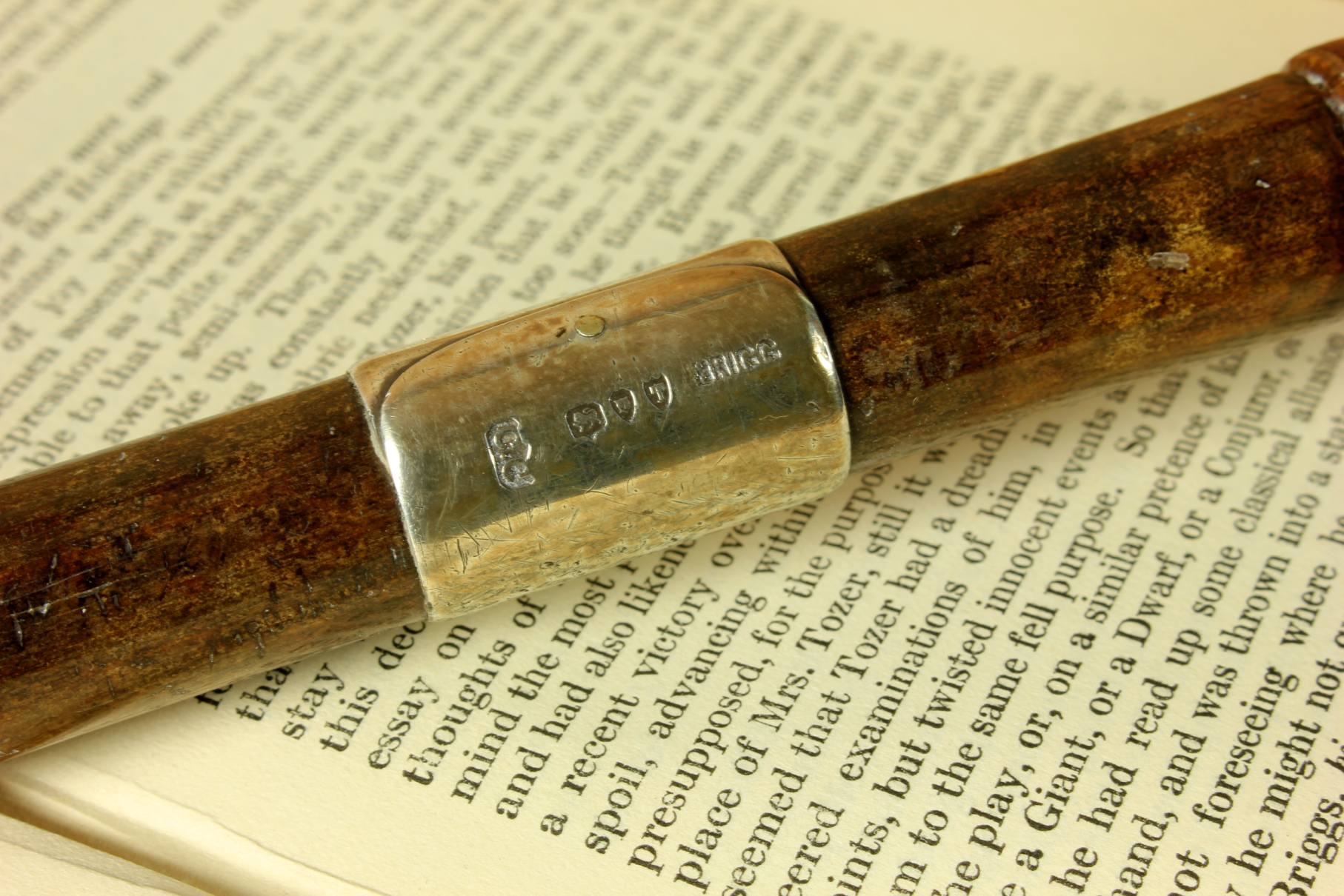 This antique stick which is by top stick maker Thomas Brigg & Sons of London has a bamboo shaft and a Charles Cooke hallmarked silver collar which dates to 1894.