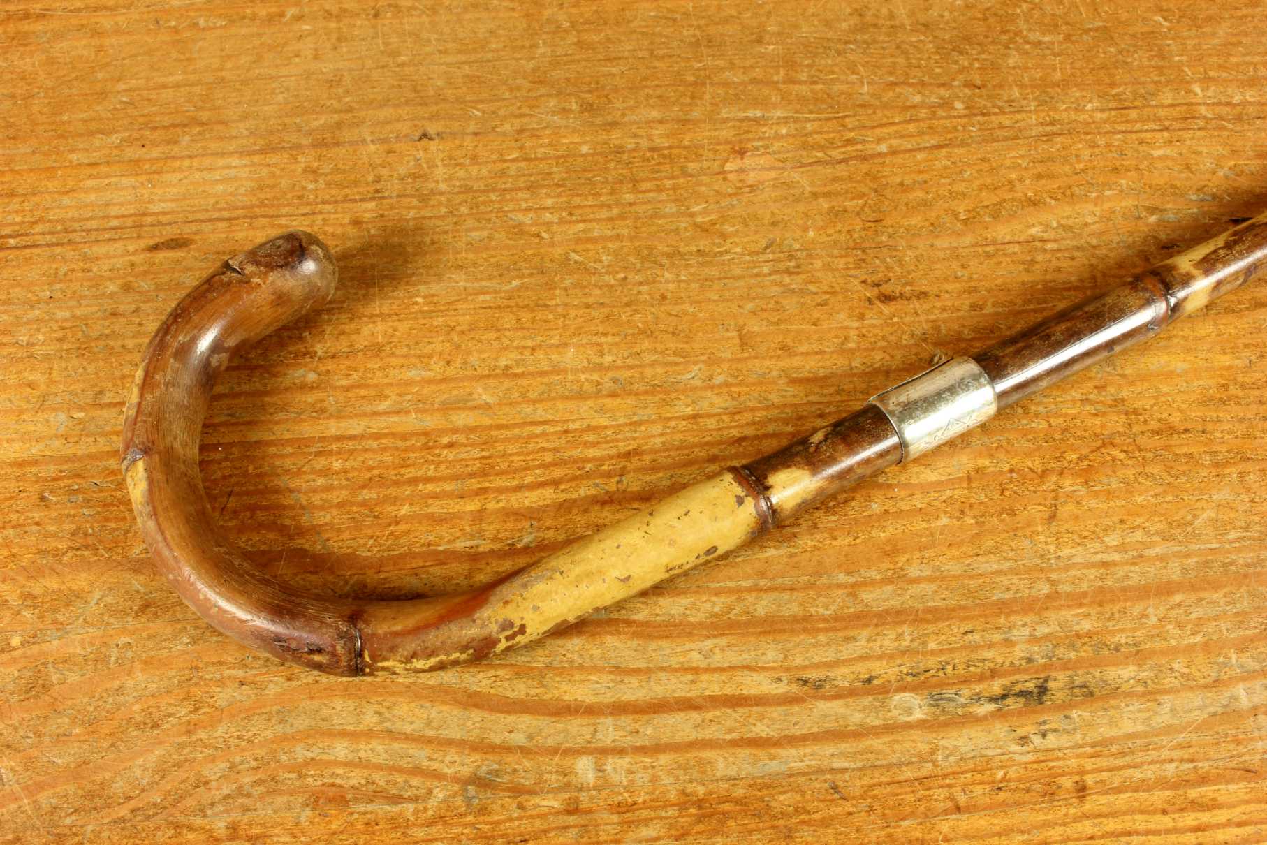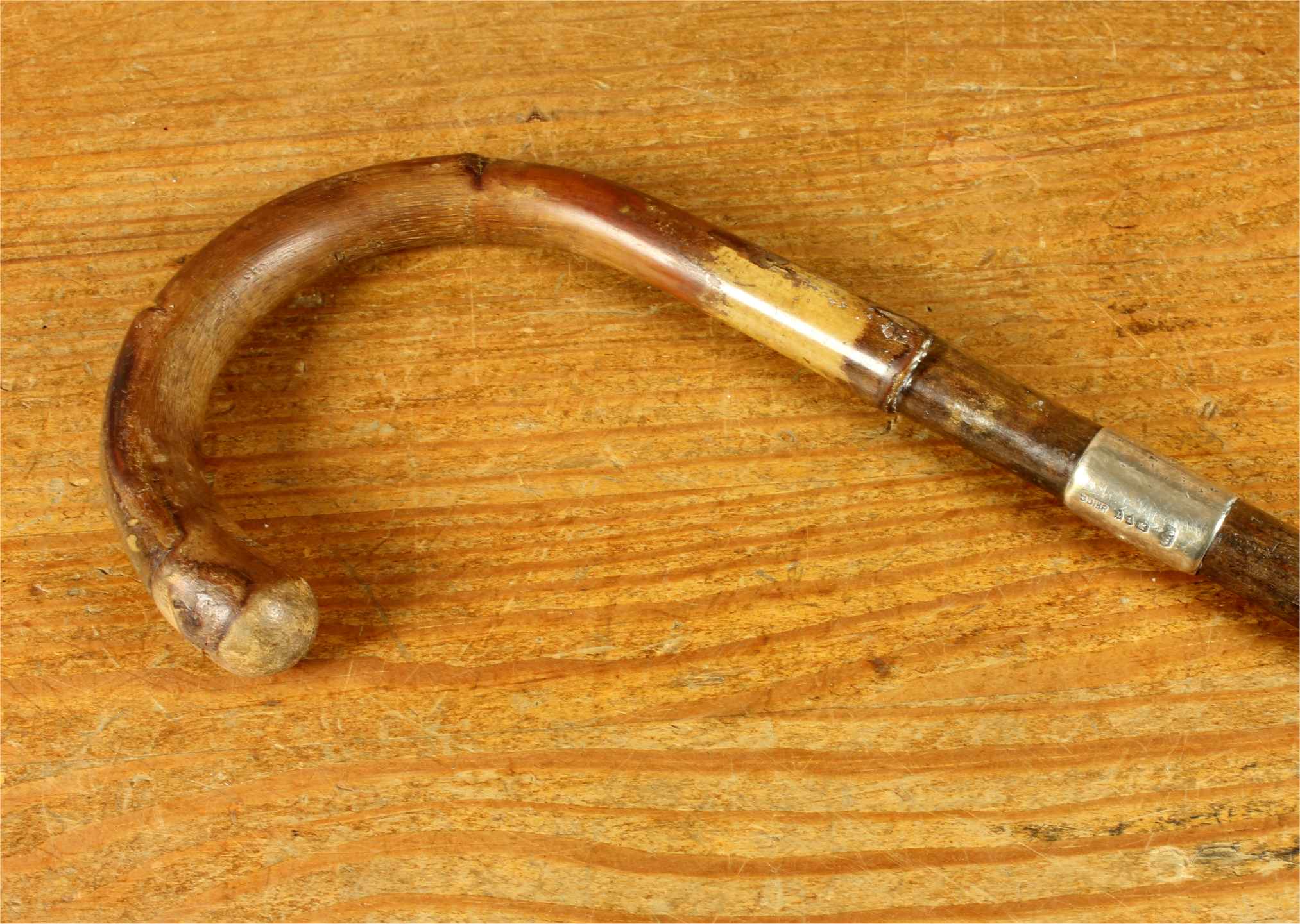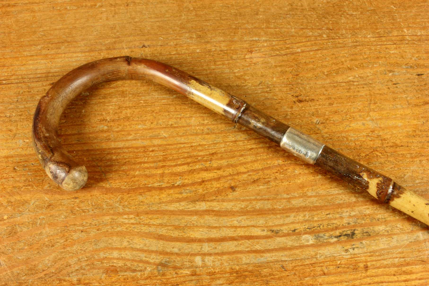 This Victorian walking cane has a crook handle, monogrammed silver collar, brass ferrule and is a good usable stick being 88.5 cm in length.