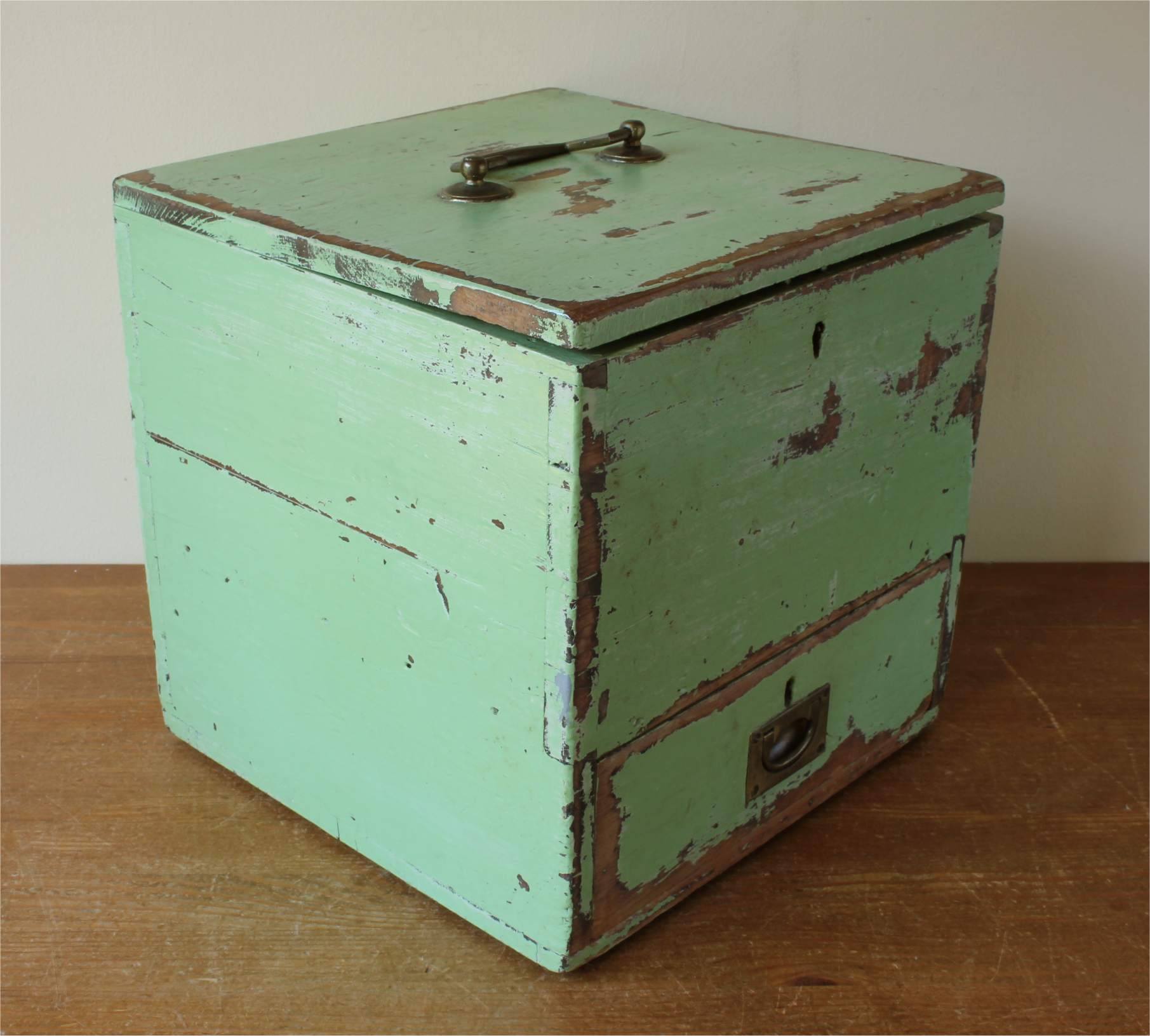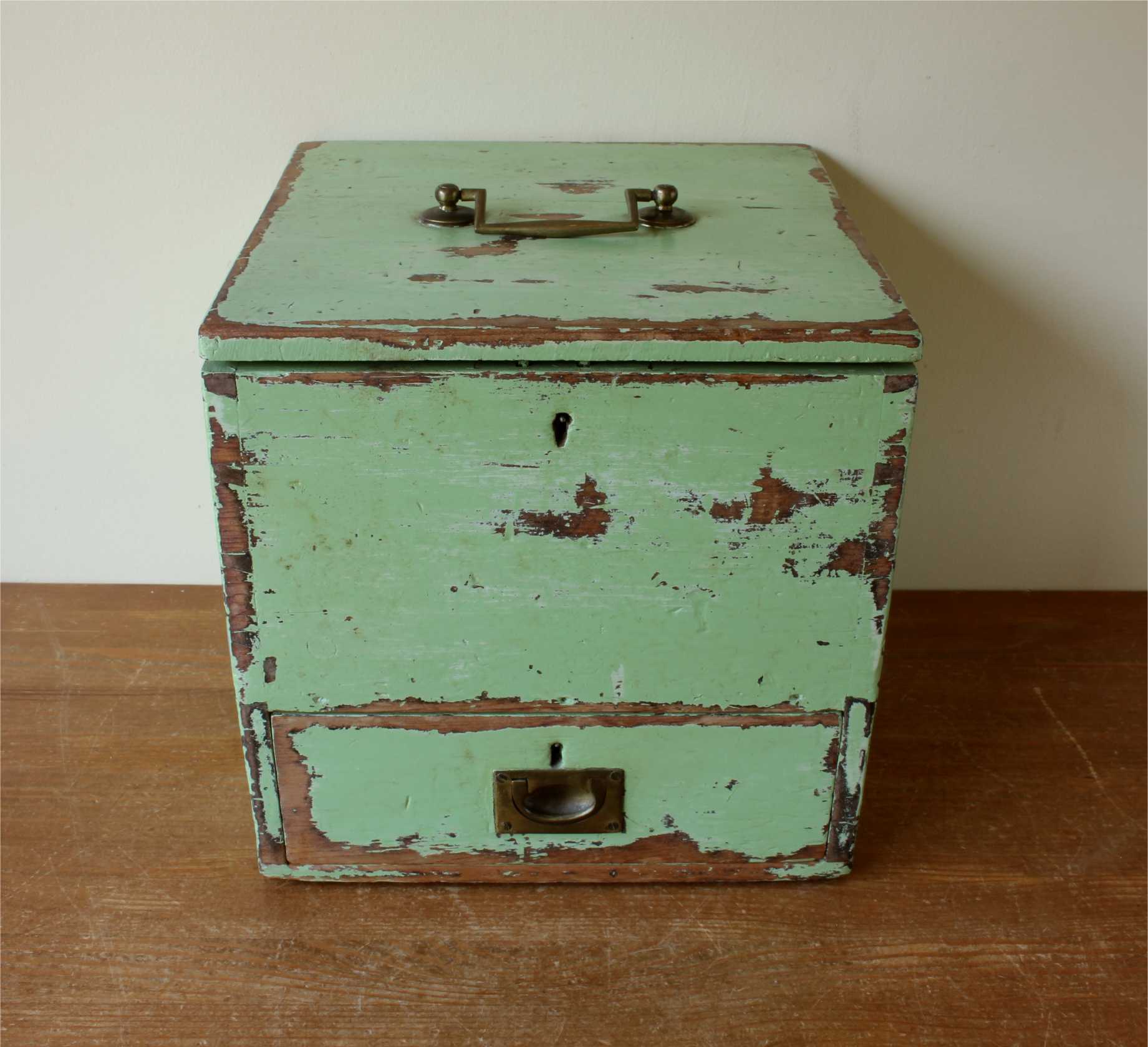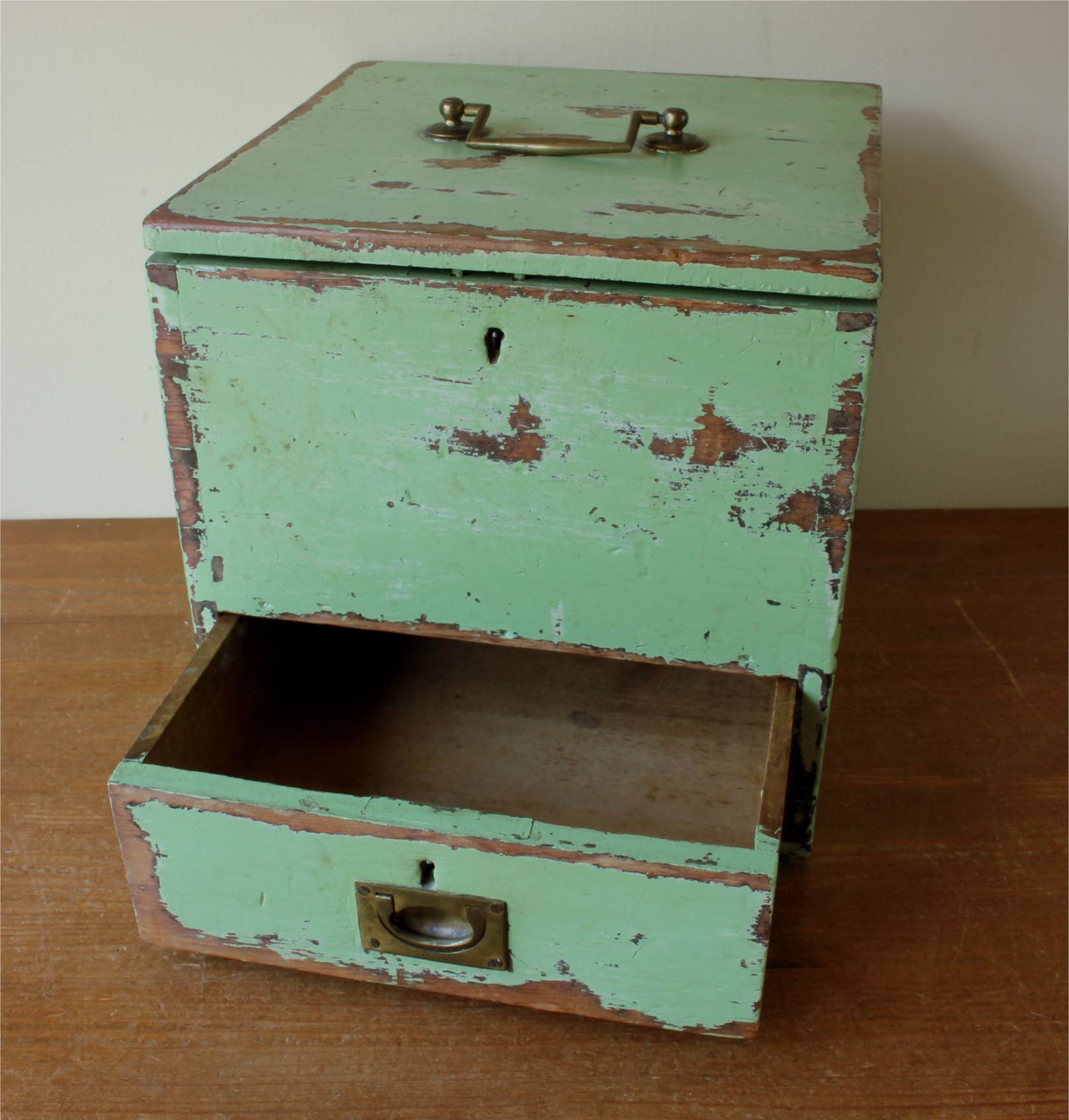 This Victorian cabinet is nicely made with a hinged lift up lid which is fitted with metal hinges and brass handle, lower drawer has a brass folding handle and the drawer sliding in and out well. The box sits on four metal stud feet and two brass locks are fitted to the box but we do not have the keys.