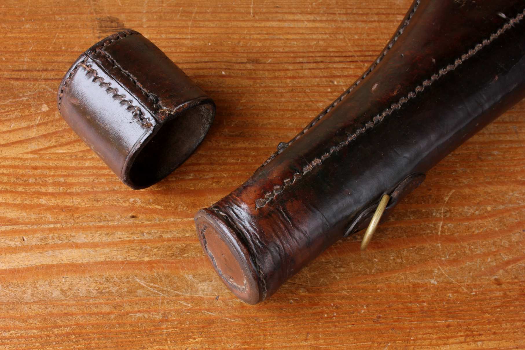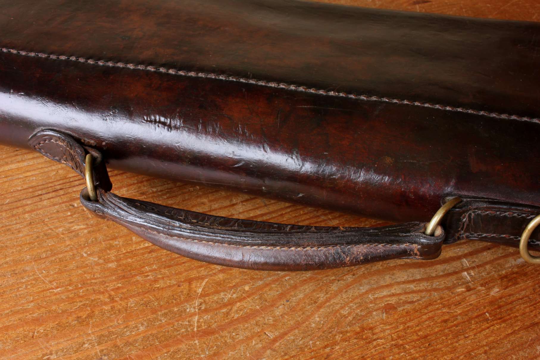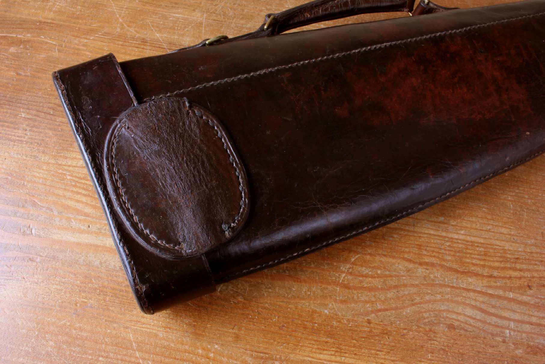 This handsome antique case comes complete with a separate leather end cap which fits over the end nicely to protect and is in good usable condition so could be used to carry and store a shotgun. Would also make a nice display item in a bar, stables, hunting shop or for home decor.