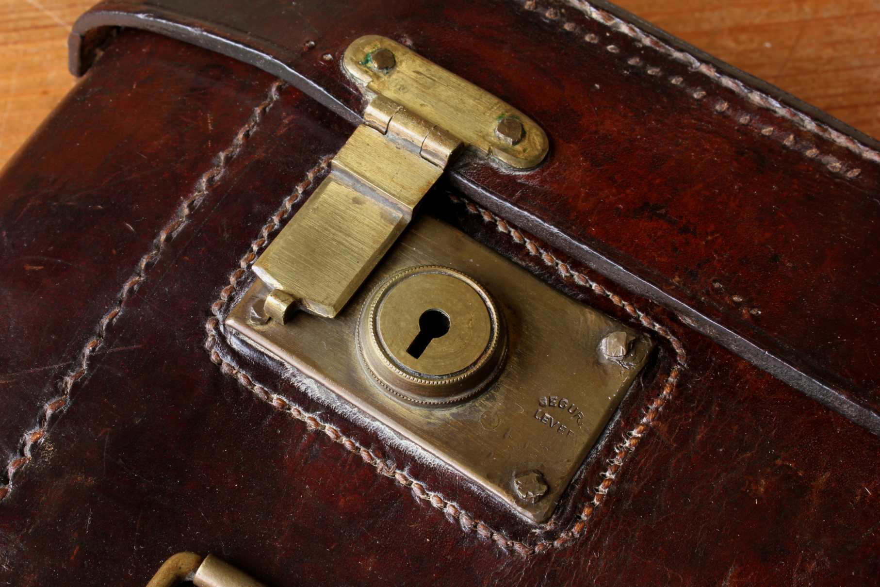 Condition: Well used antique condition with the usual scuffs, scrapes, marks and wear from years of use leaving a wonderful patina. Some cracking to leather. The inside is in good condition with some wear. Some old repairs. Hinge has been replaced at some time. No carrying strap. Lock clasp works but there is no key. Please see pictures.