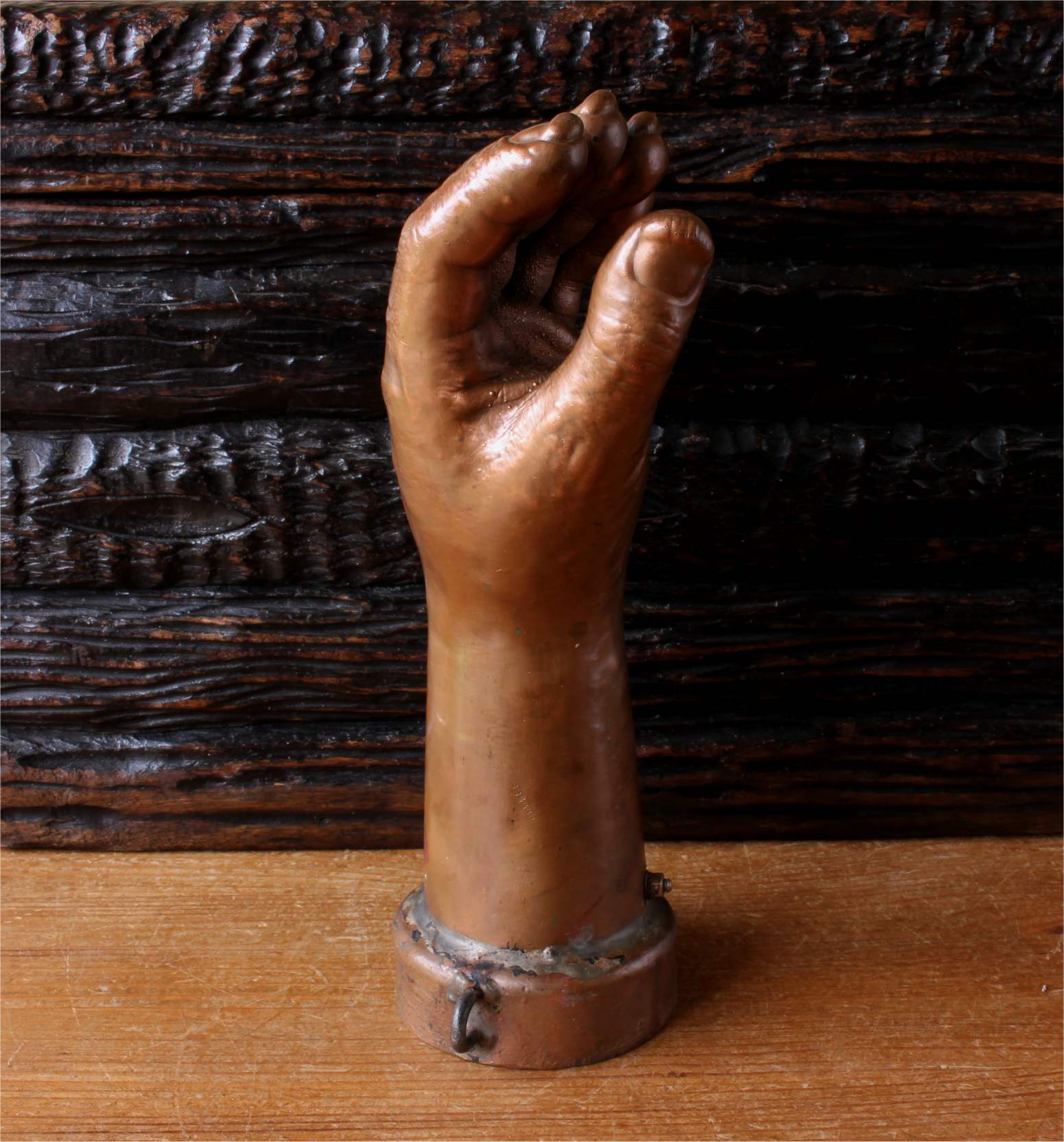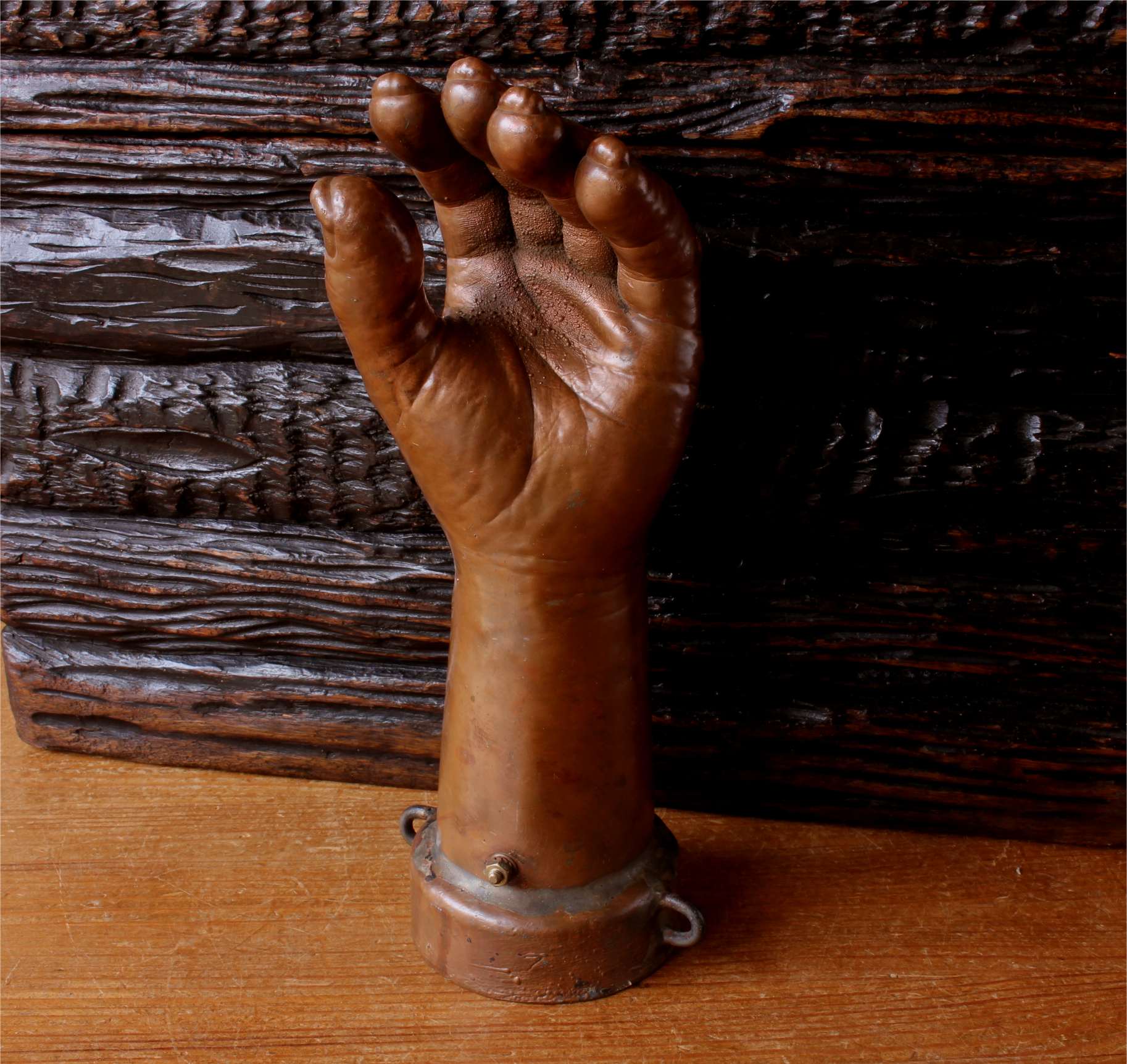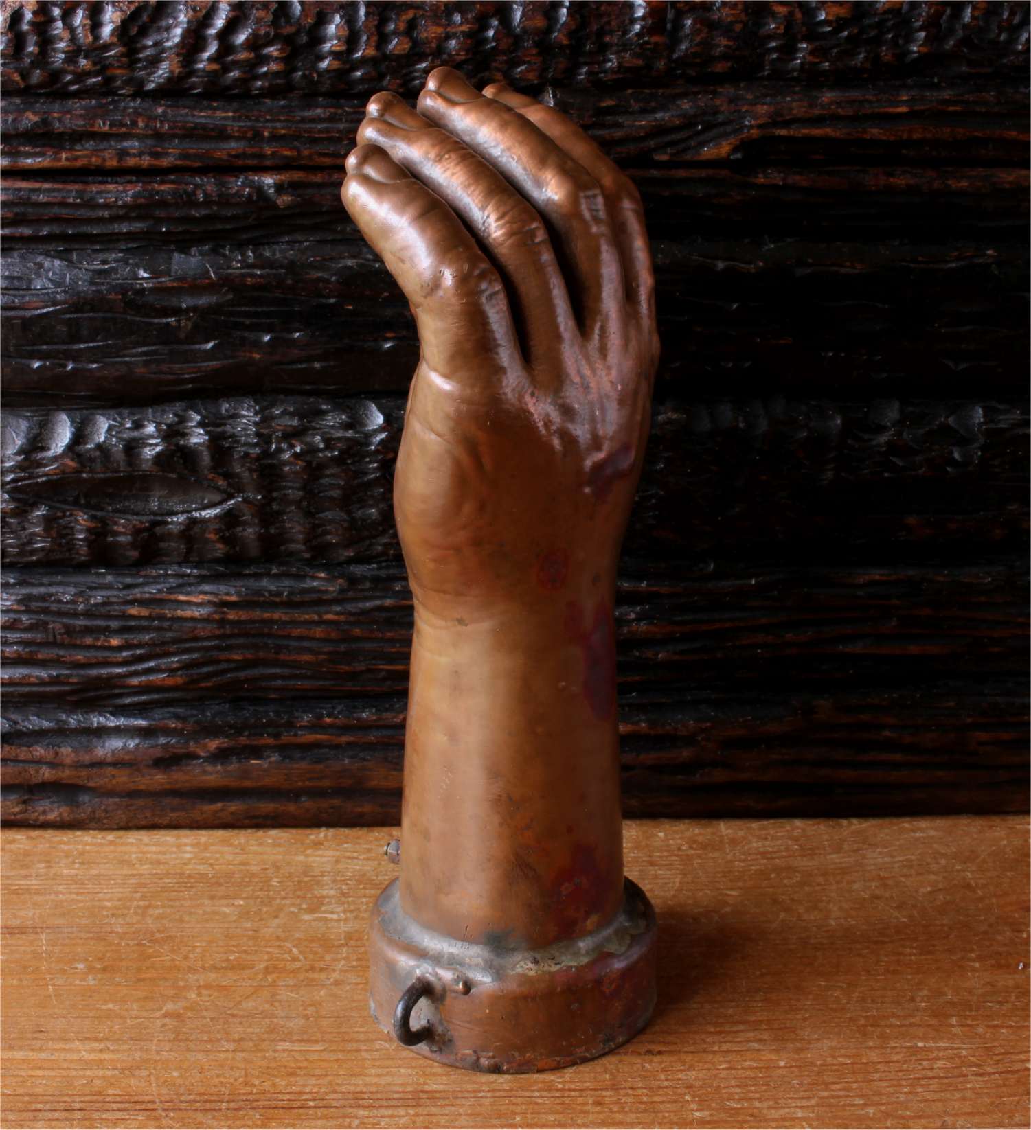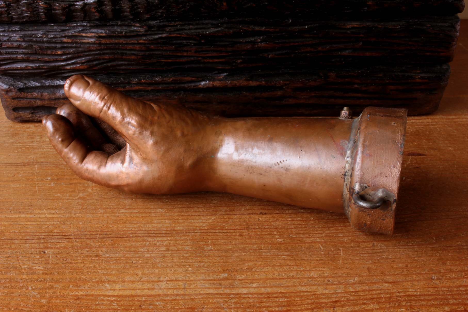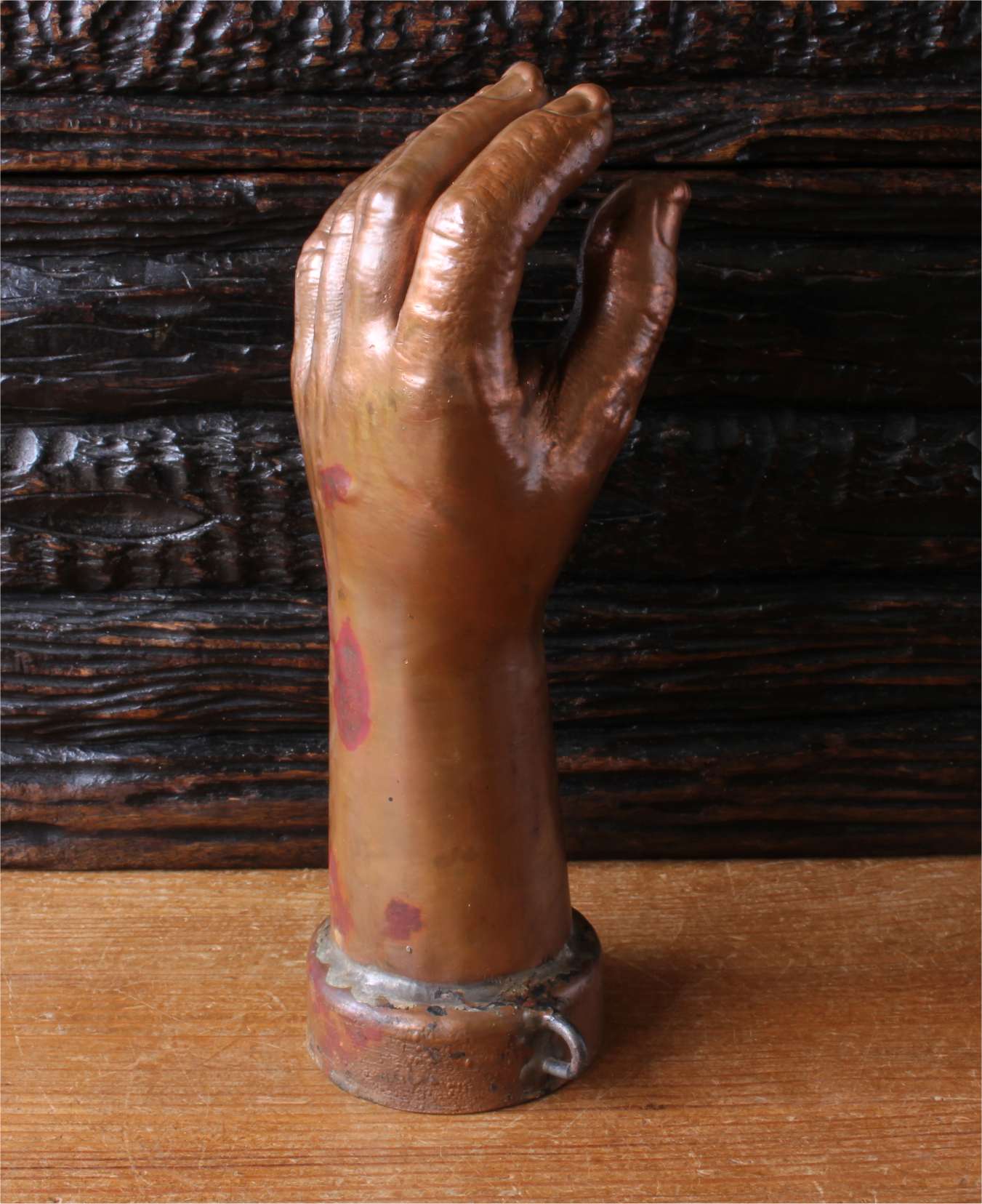 This unusual vintage hand & lower arm which is made of heavy copper dates from the mid 20th century and would have been used as a mould to make a rubber prosthetic arm or a life size model.
