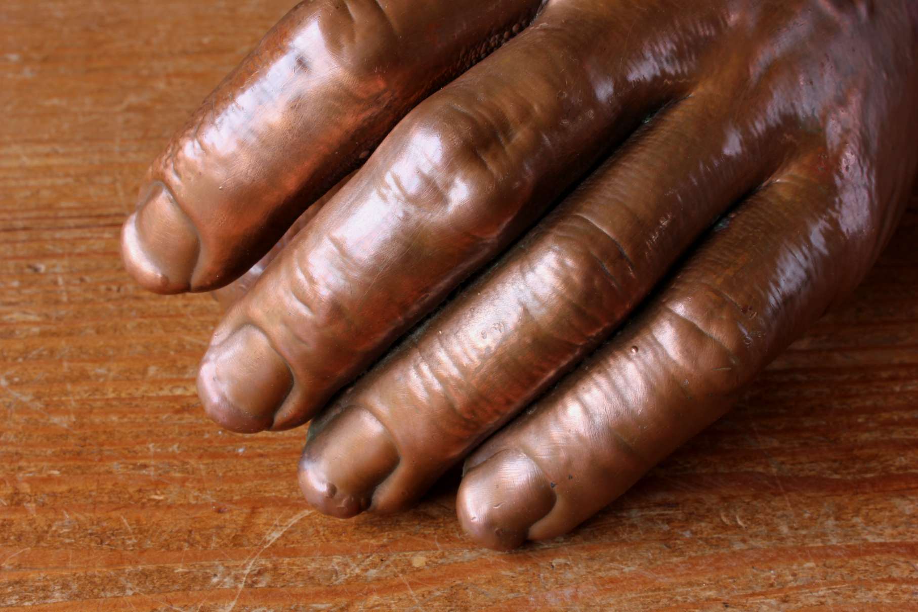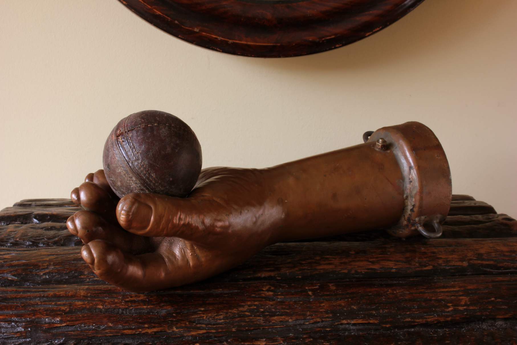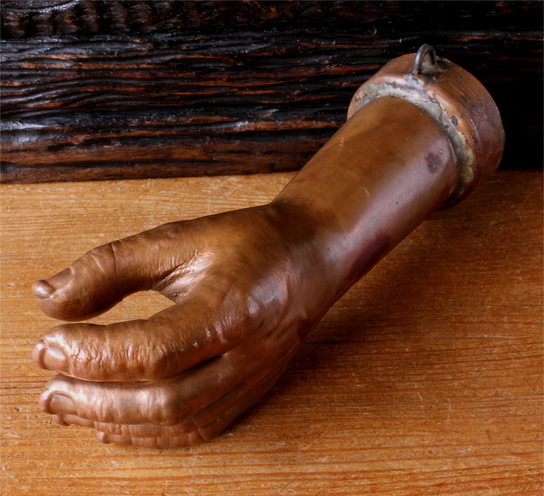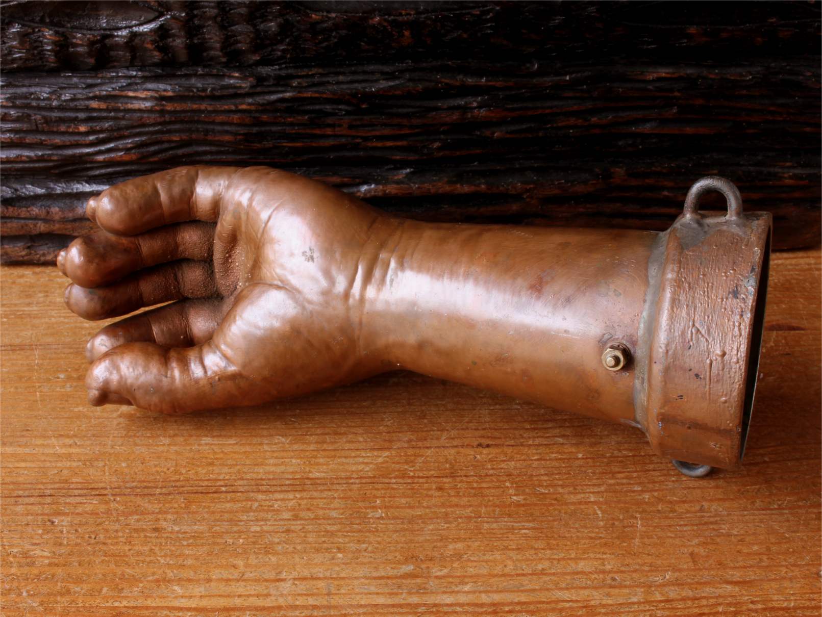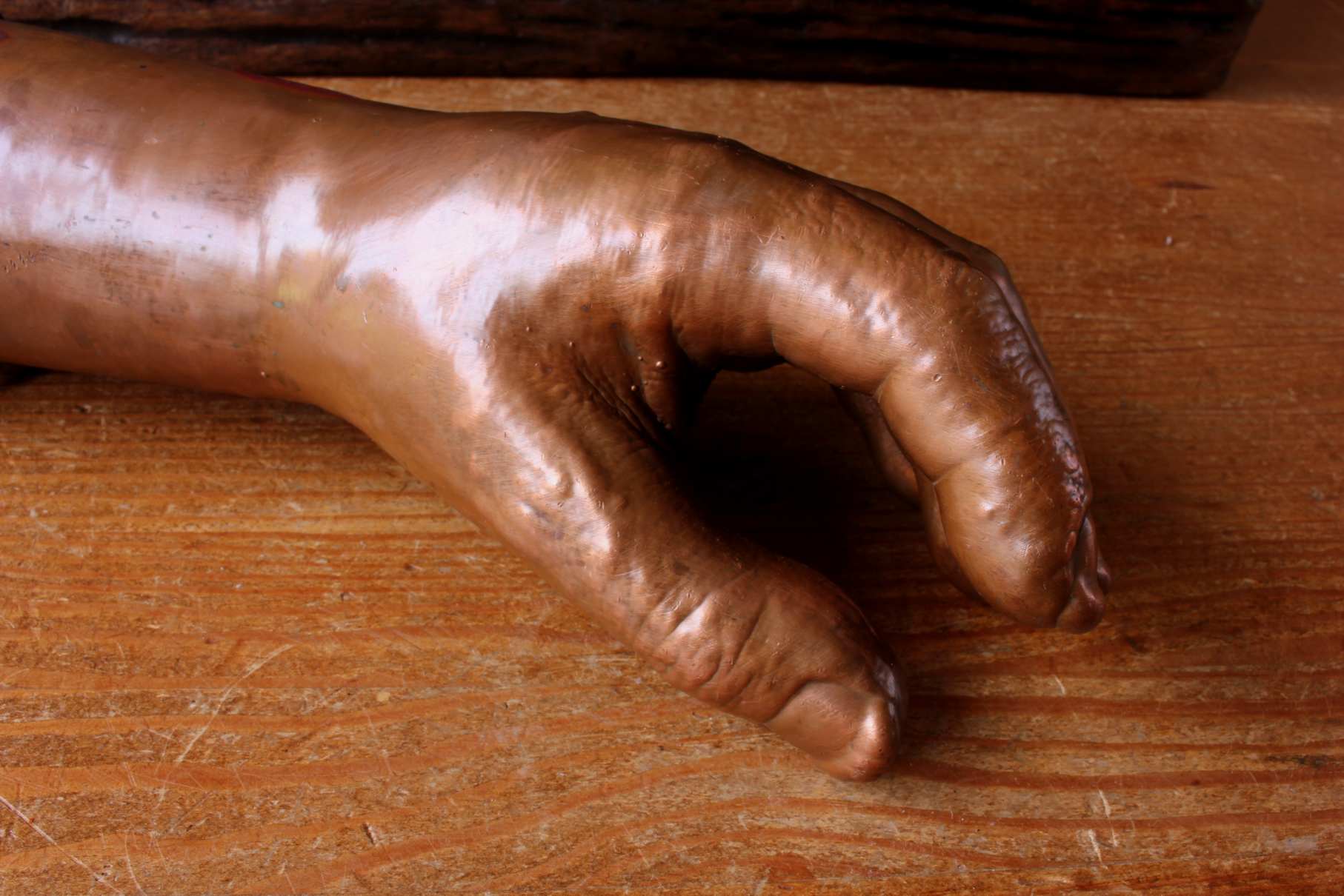 This unusual vintage hand & lower arm which is made of heavy copper dates from the mid 20th century and would have been used as a mould to make a rubber prosthetic arm or a life size model.