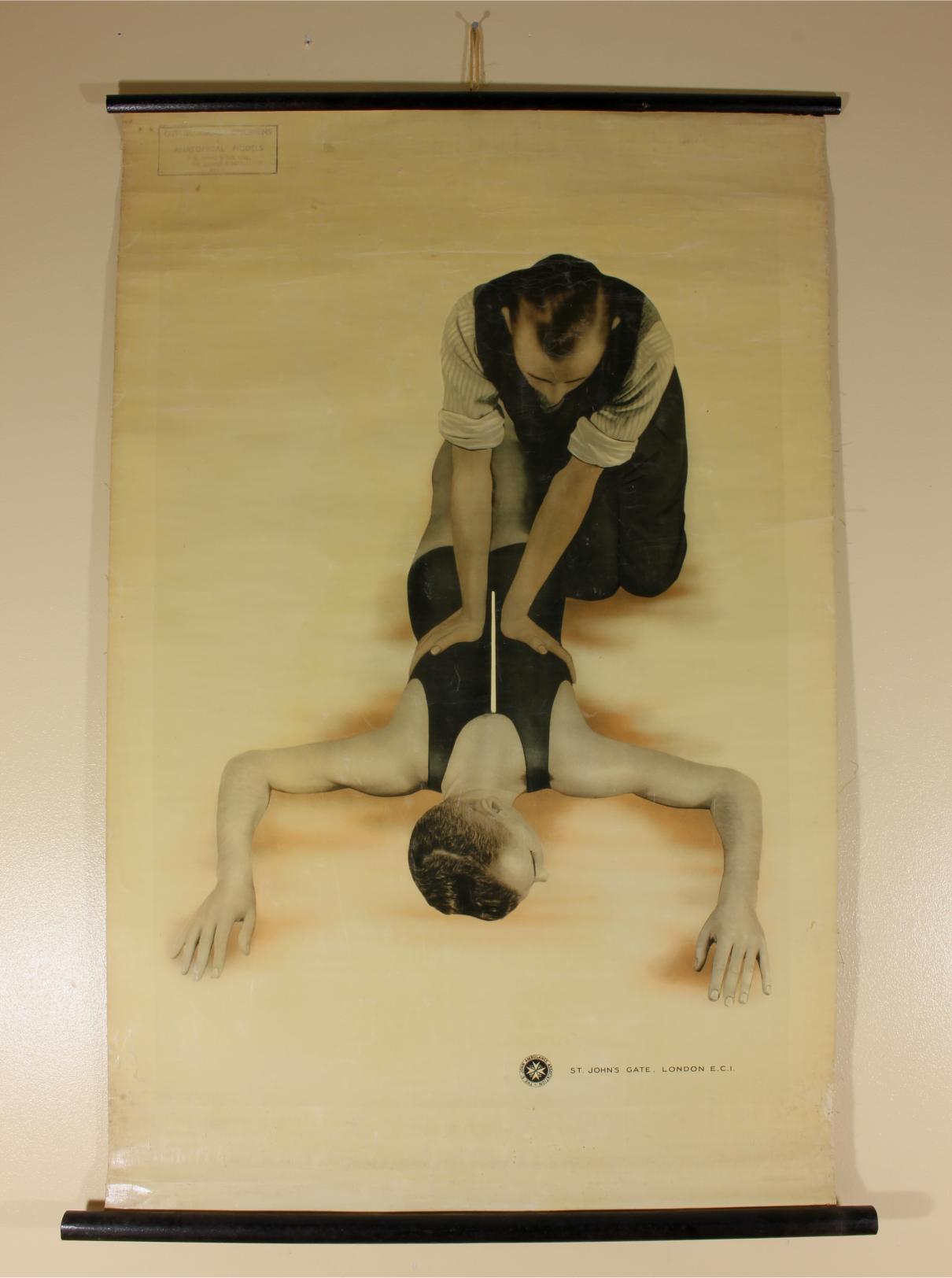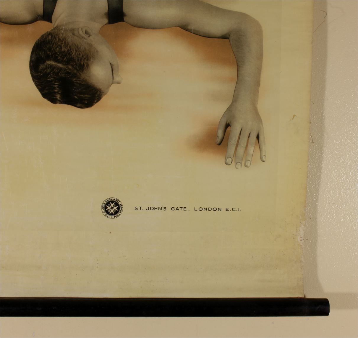 The chart is marked at the bottom with the St John's Ambulance logo and St John's Gate, London EC1, printed on paper which is linen backed and is suspended by top and bottom wooden bar hangers.
