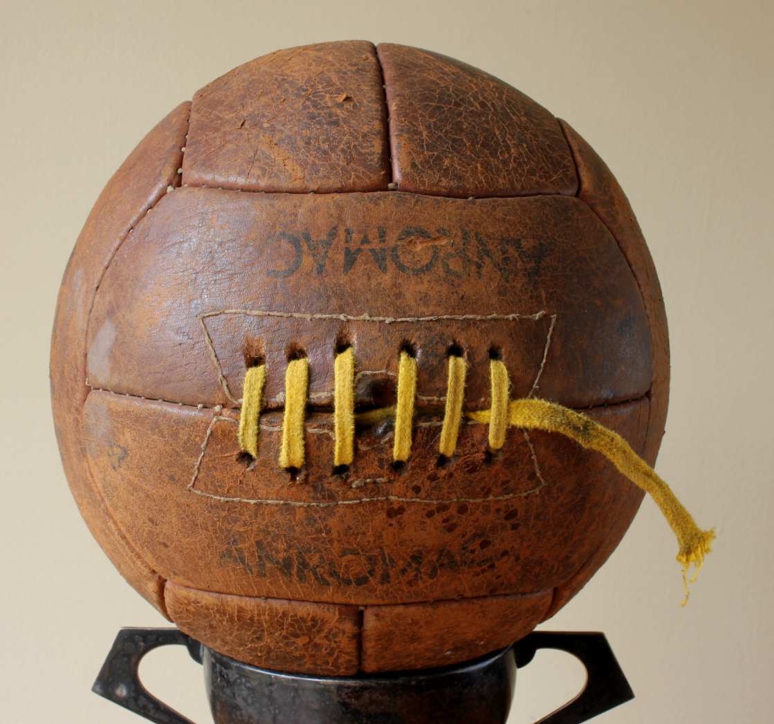 This great looking original vintage football that has 12 panels and 6 pairs of lace holes is made of thick light brown leather and is marked with Anromac Star.
