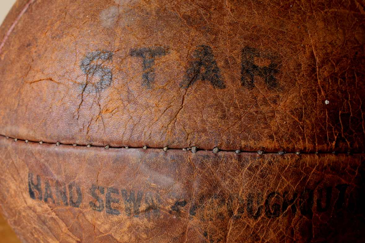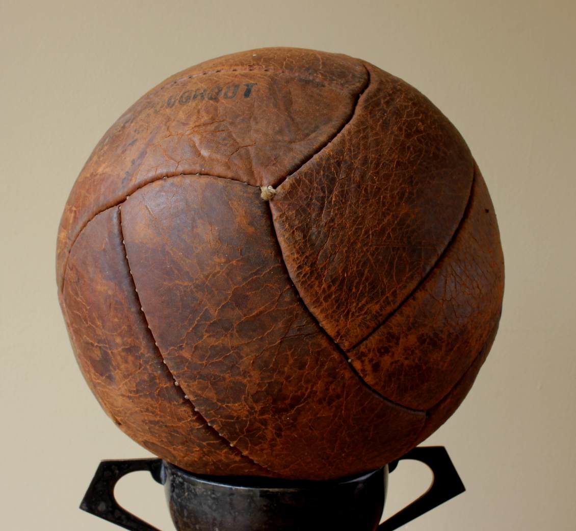 This leather soccer ball dates from c1950 and is also marked with Hand Sewn Throughout. A new bladder has been fitted so the ball is inflated, holds it's shape and displays well.