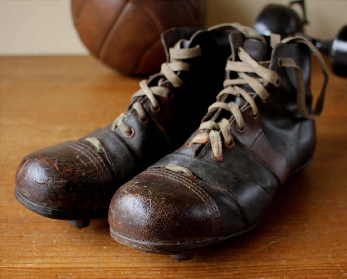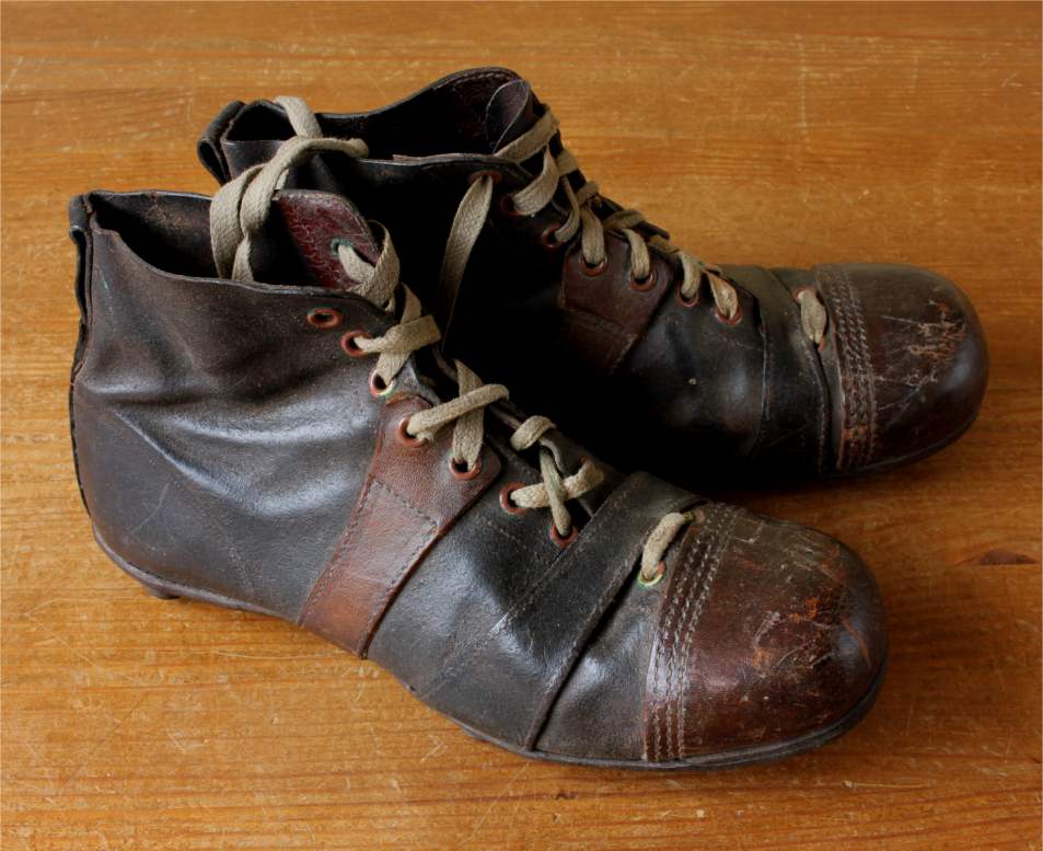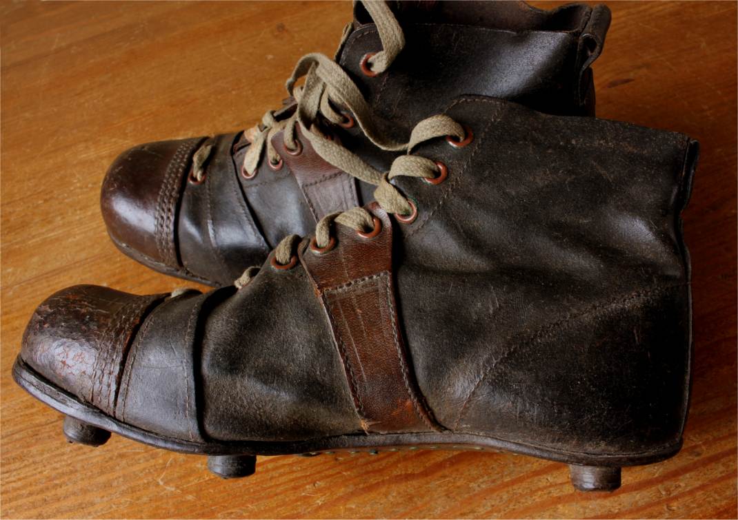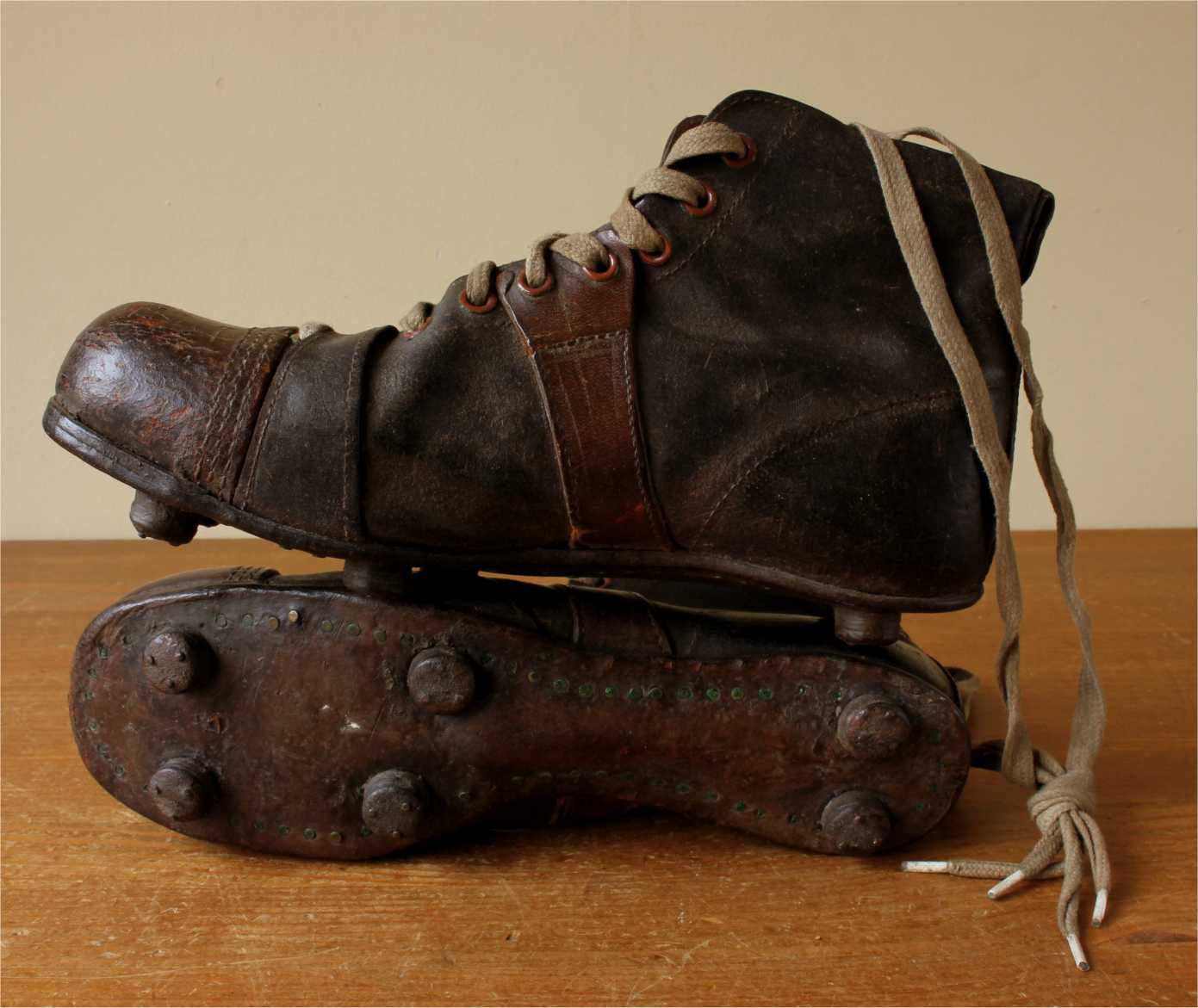 This very nice pair of brown leather football boots which date from c1940 have leather soles with nailed on leather studs and cord laces.