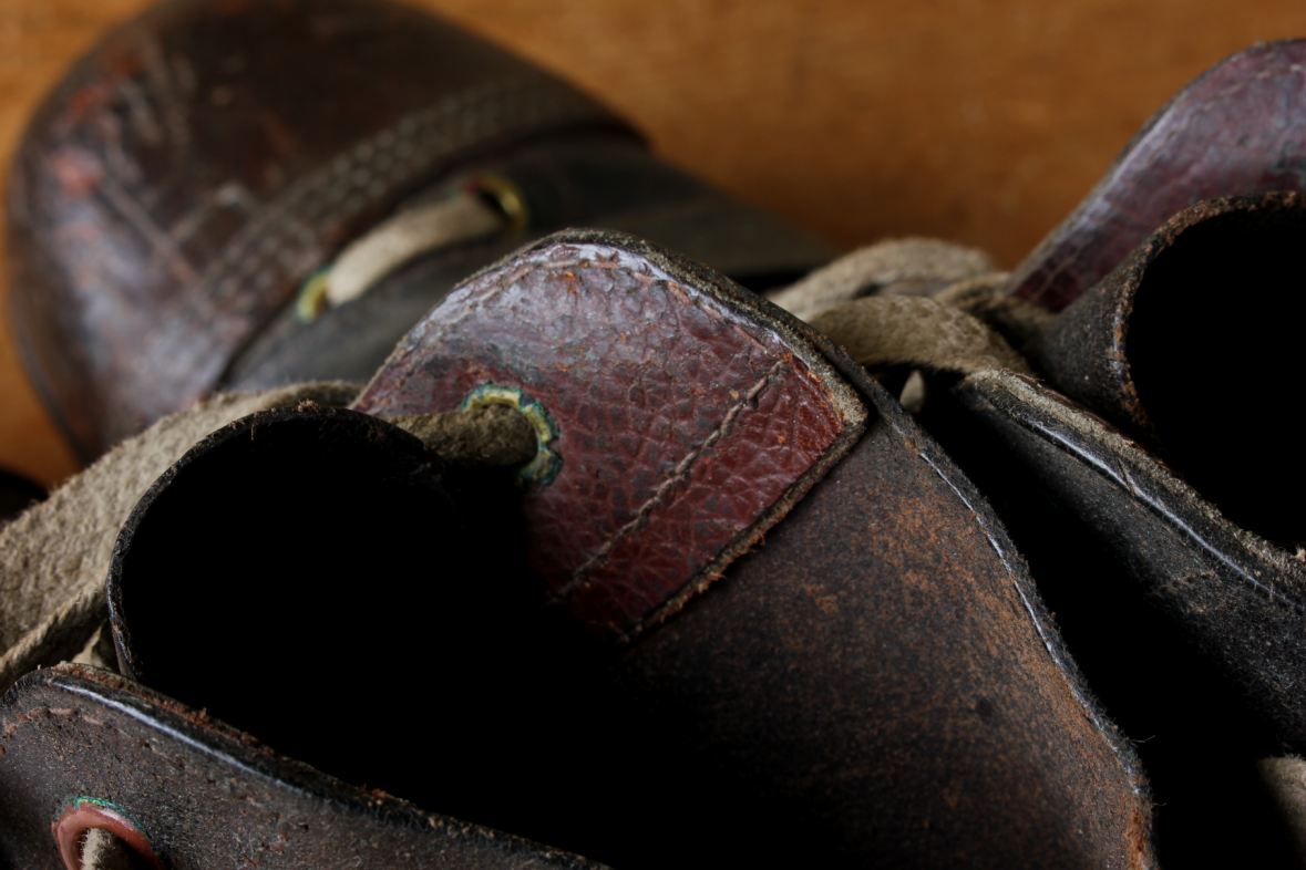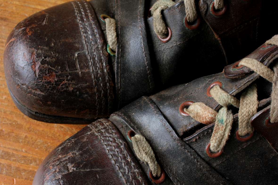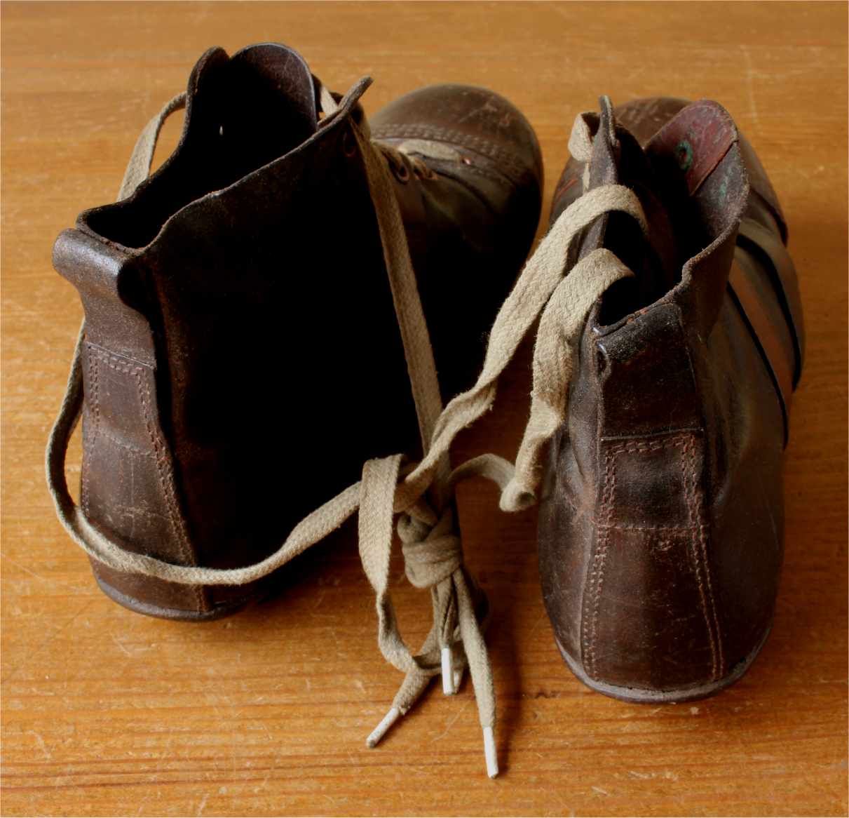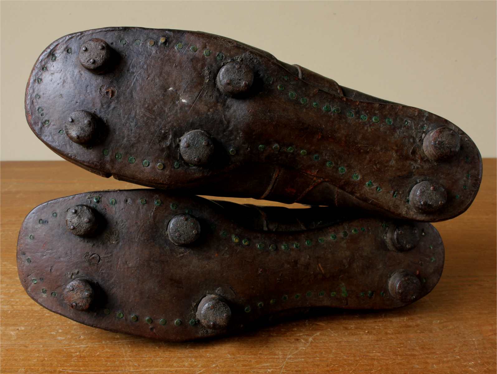This very nice pair of brown leather football boots which date from c1940 have leather soles with nailed on leather studs and cord laces.