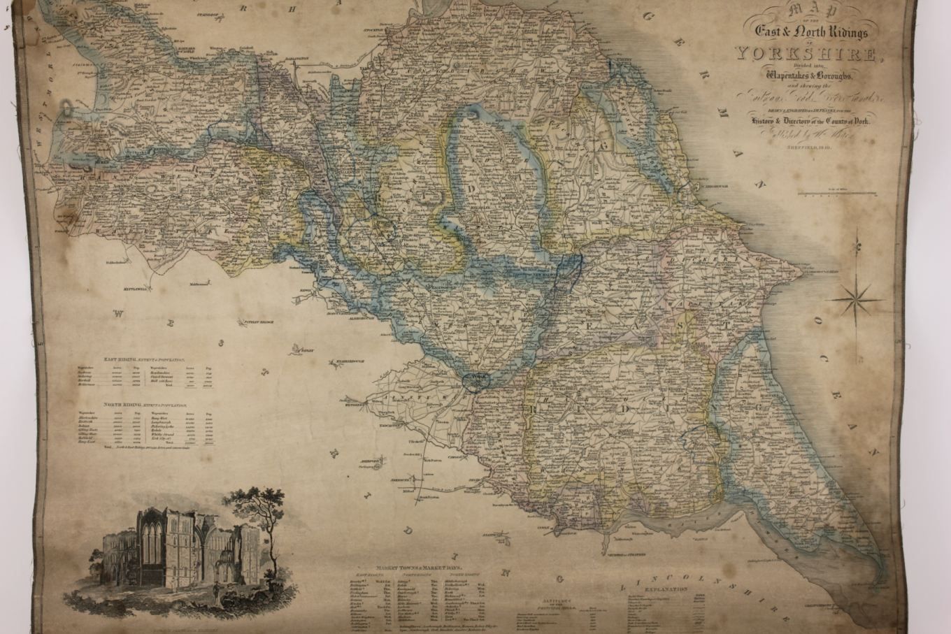 This genuine and interesting 19th century wall map of East & North Ridings, Yorkshire which is drawn and engraved by J.H. Franks for the History and Directory of the County of York is published by William White of Sheffield in 1840.